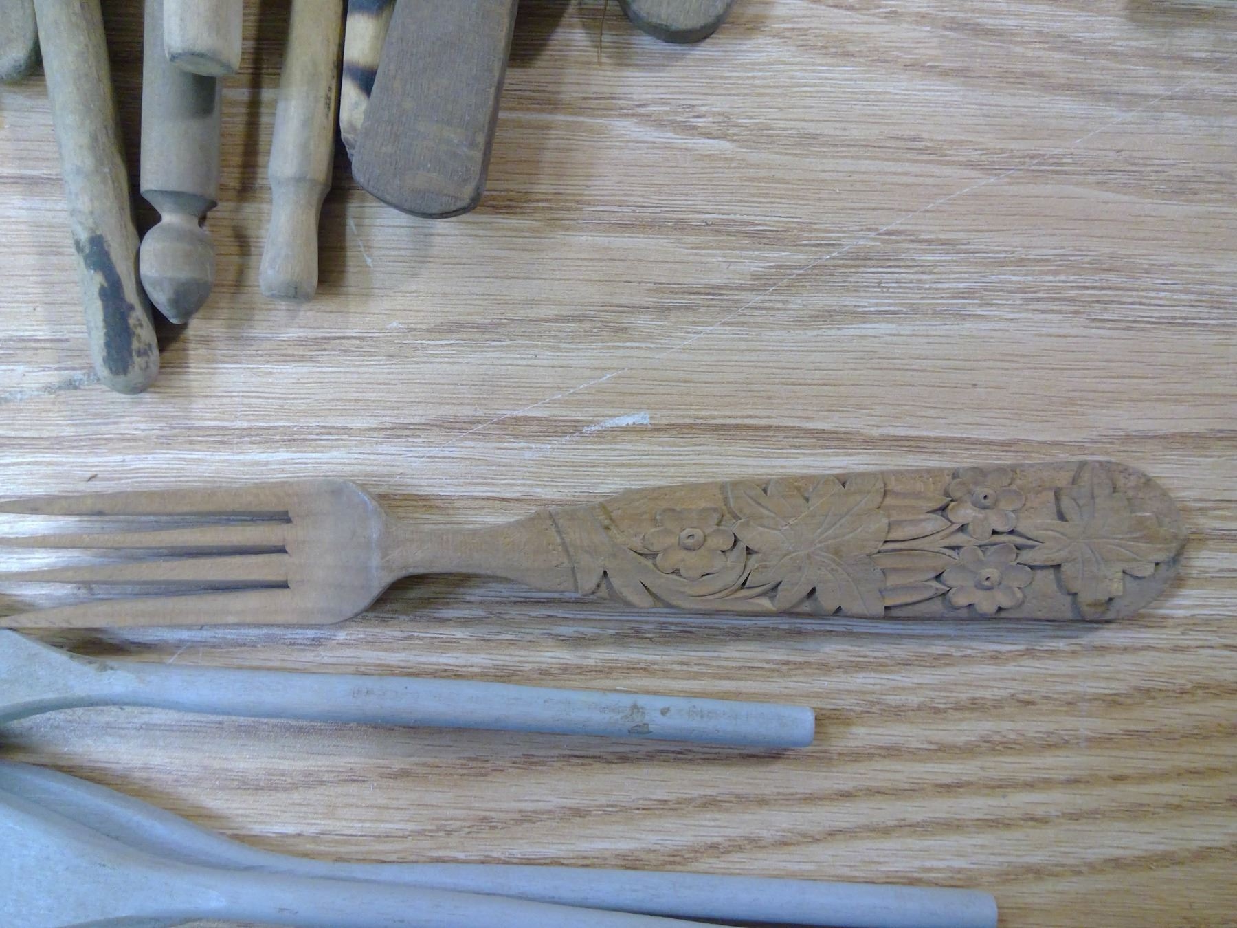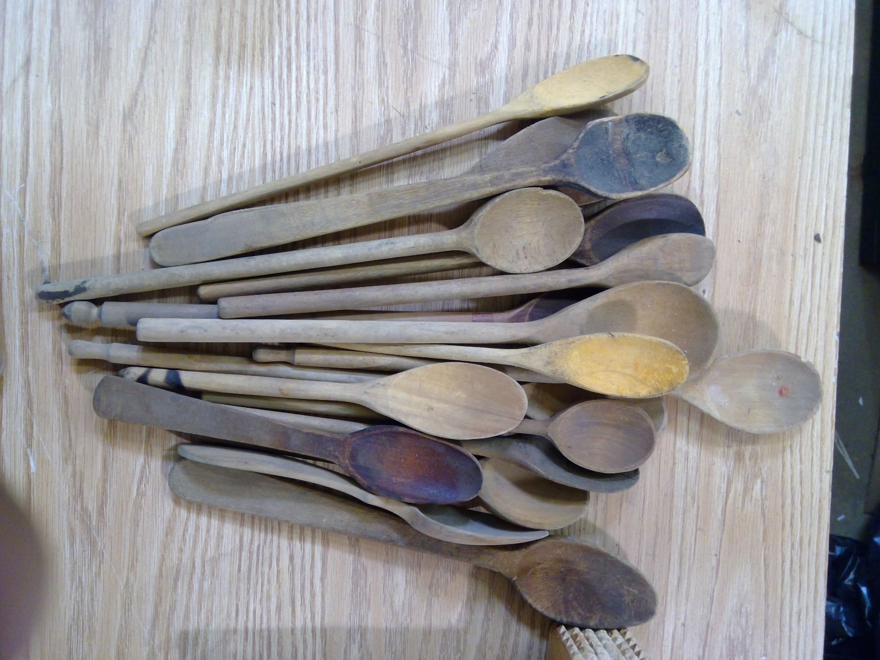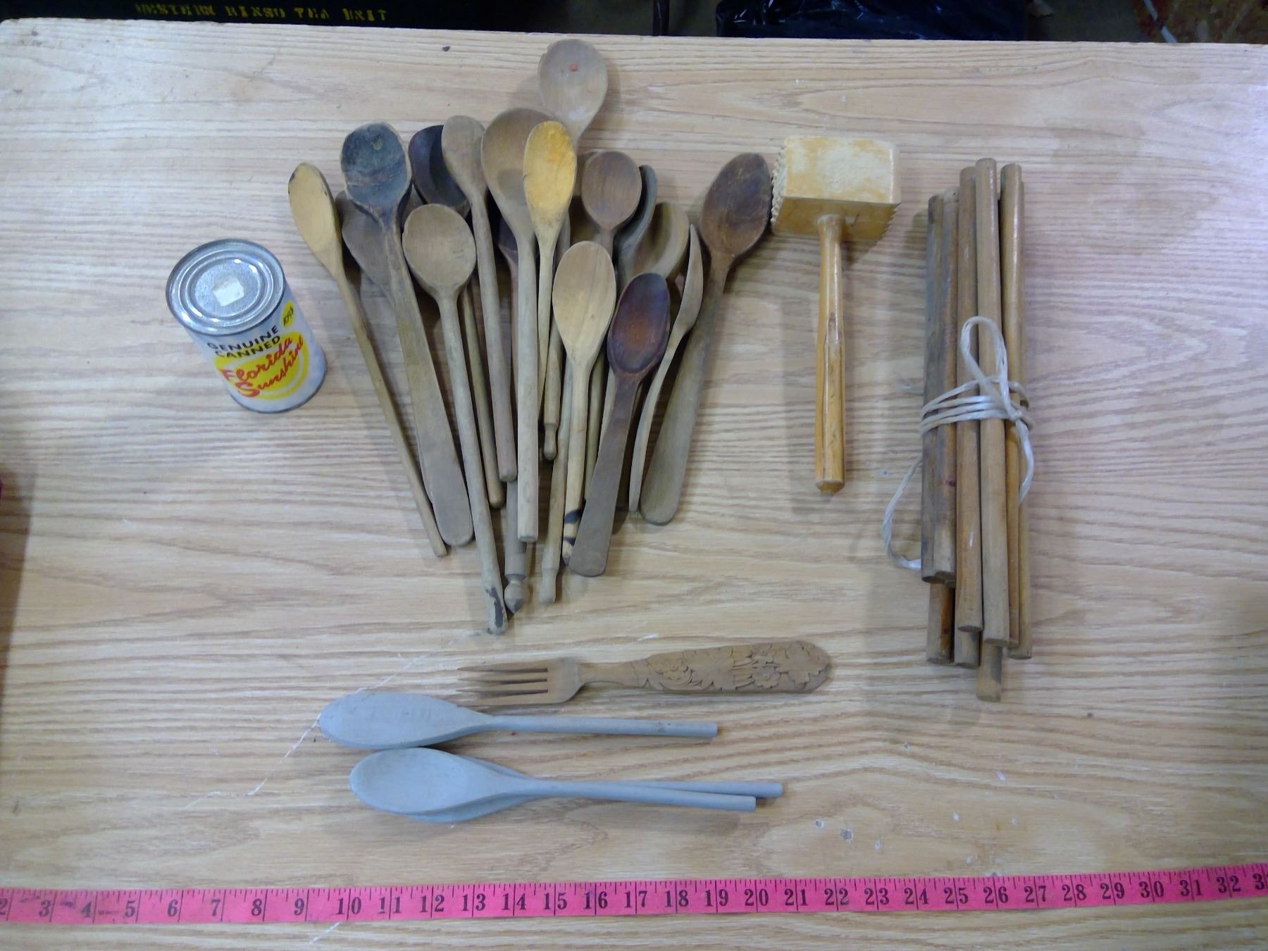 LOT OF WOODEN SPOONS + MEAT POUNDER + FLORIDA SUNSHINE CAN (EMPTY, UNOPENED)