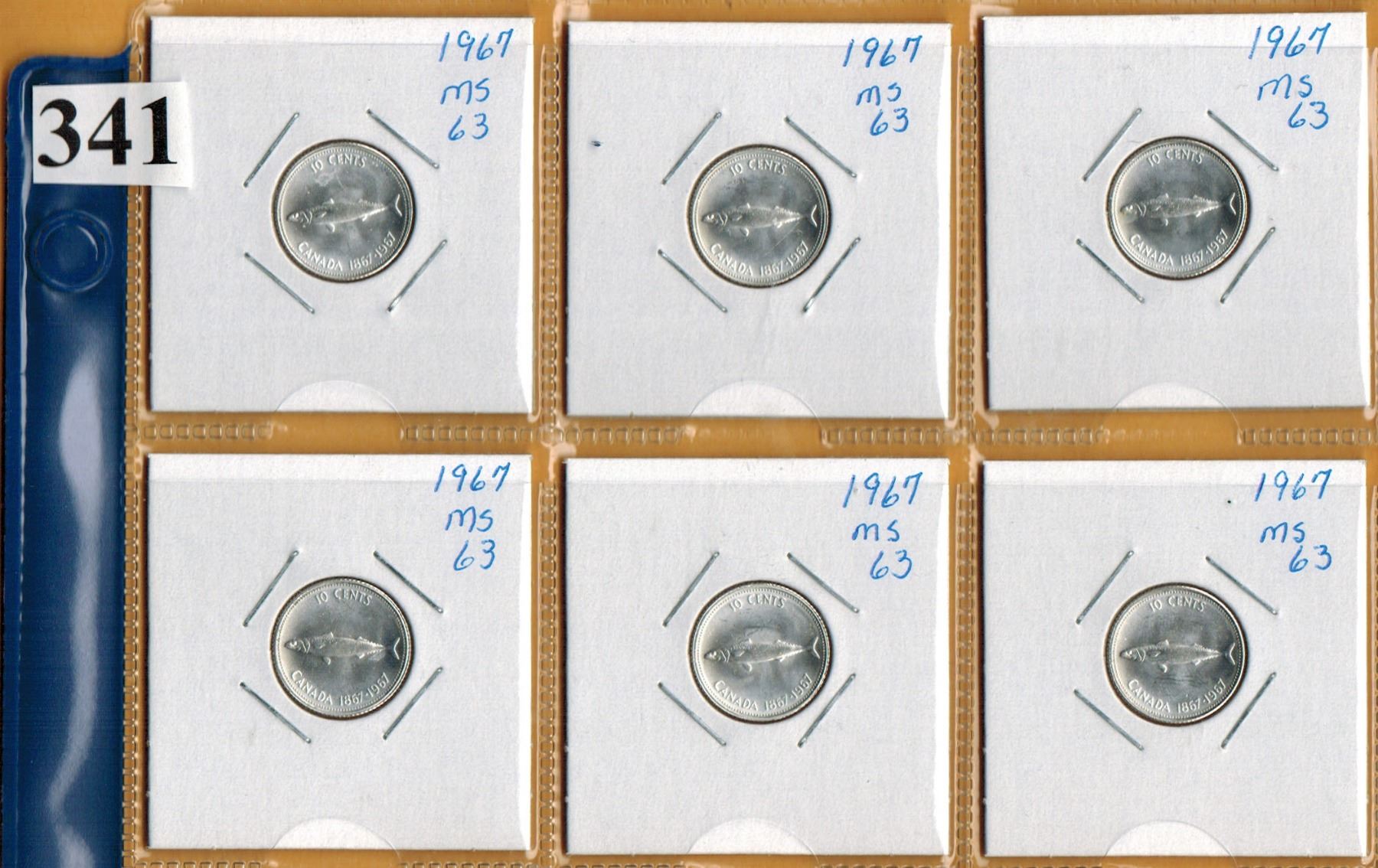 LOT of 6 1967 CANADIAN CENTENNIAL DIMES - UNCIRCULATED MS 63