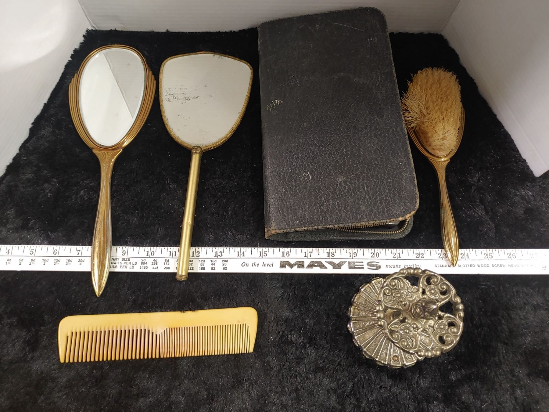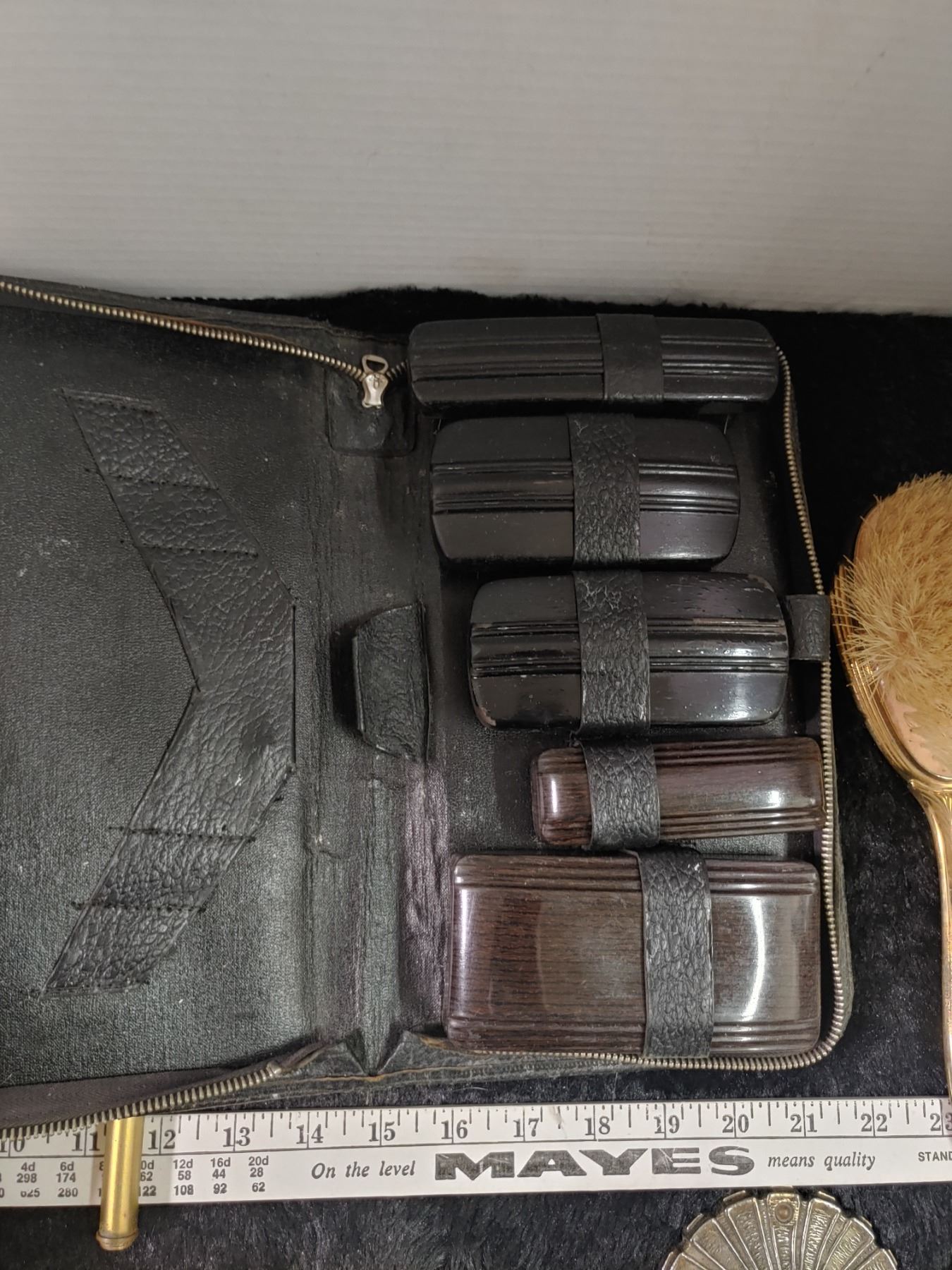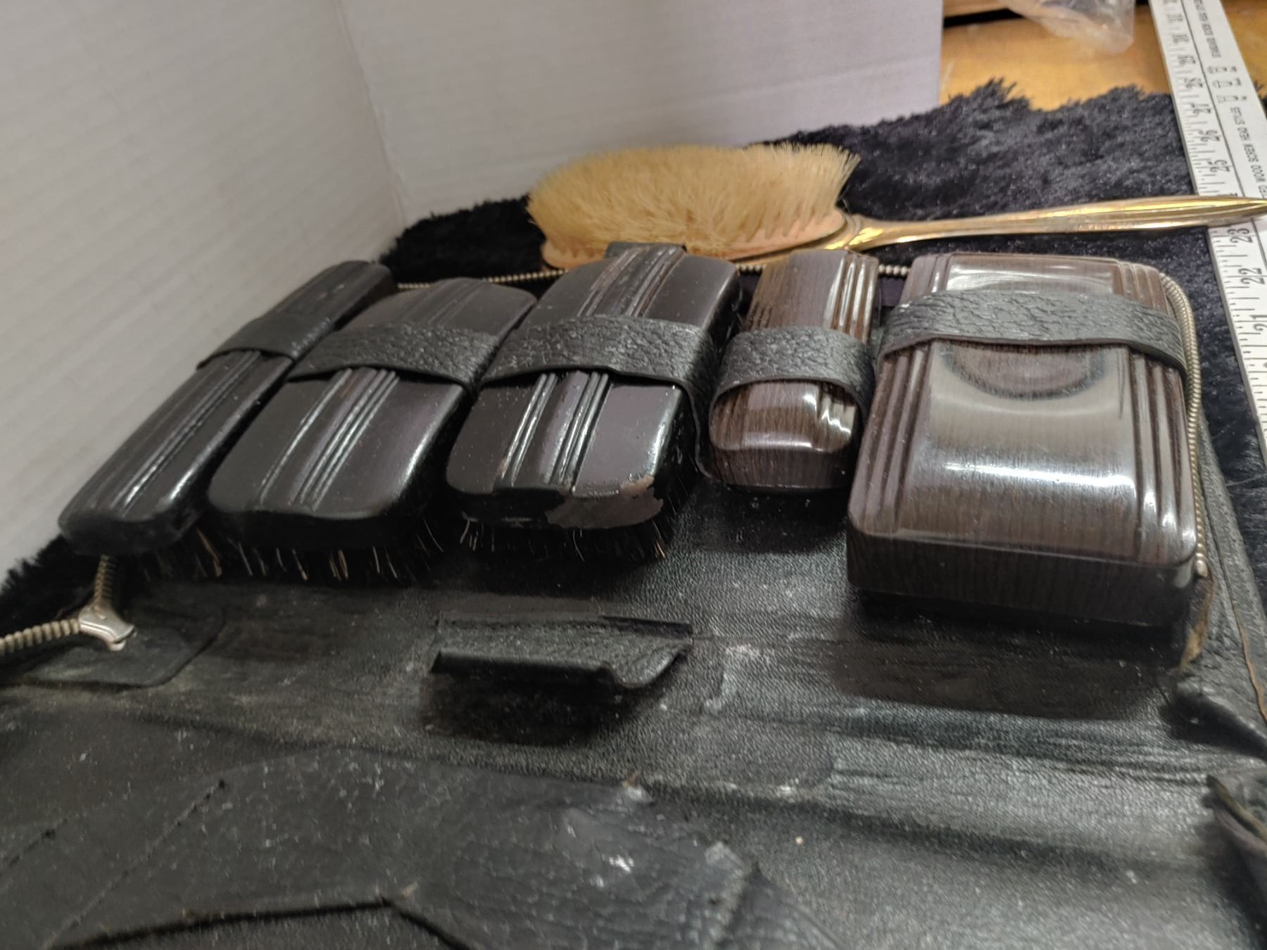 Ladies Brass Vintage Vanity items with Bakelite comb + mans Leather and Ebony Travel Case