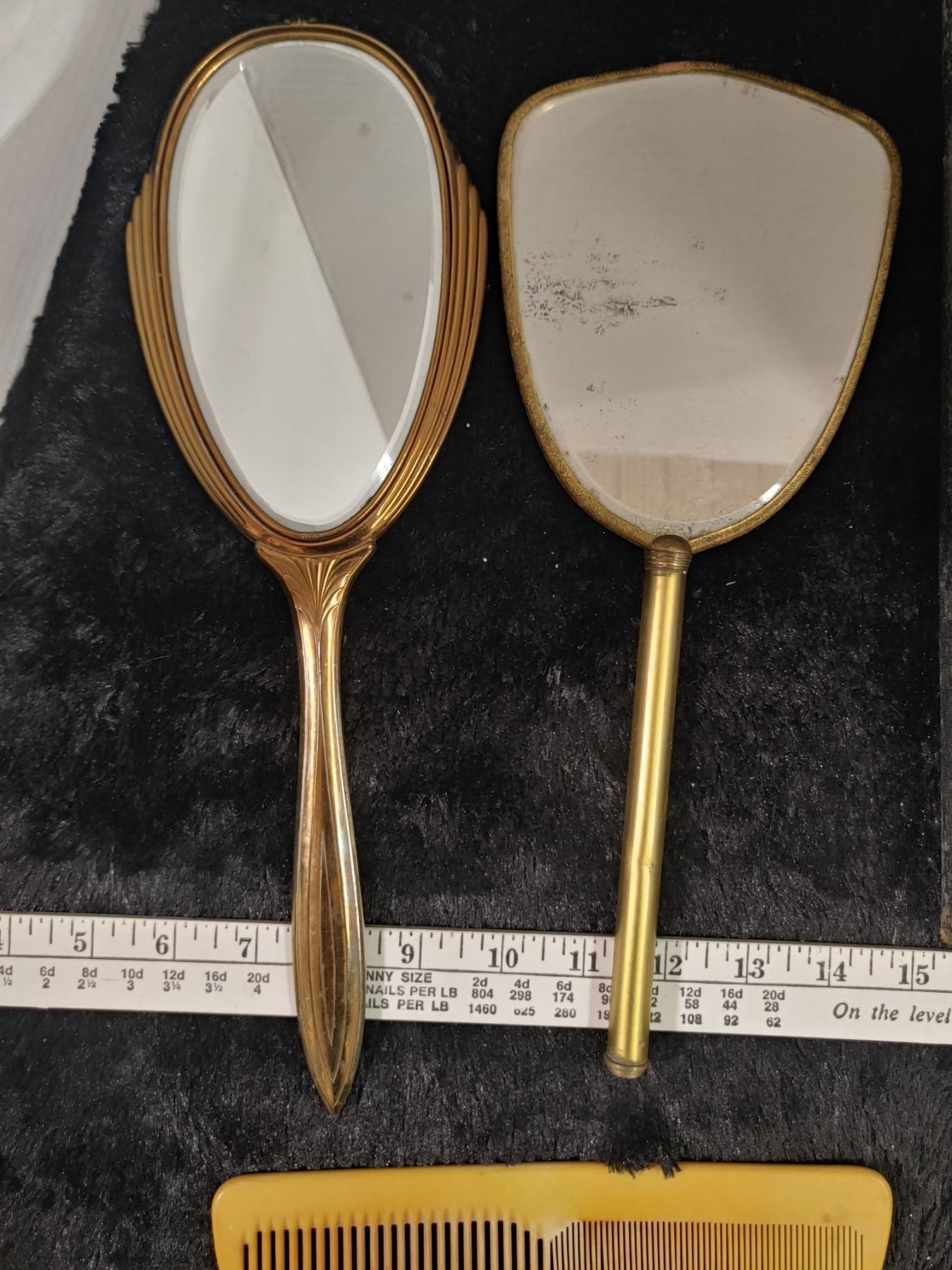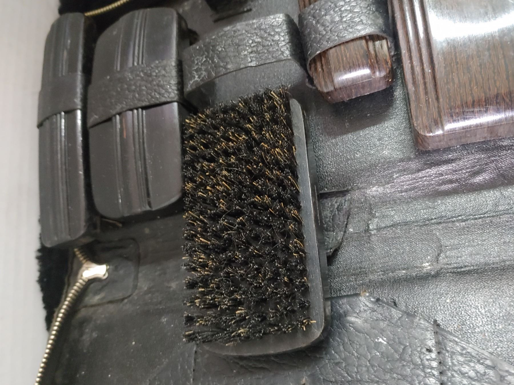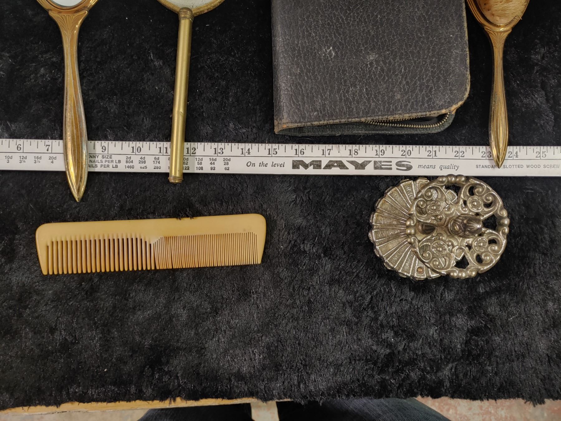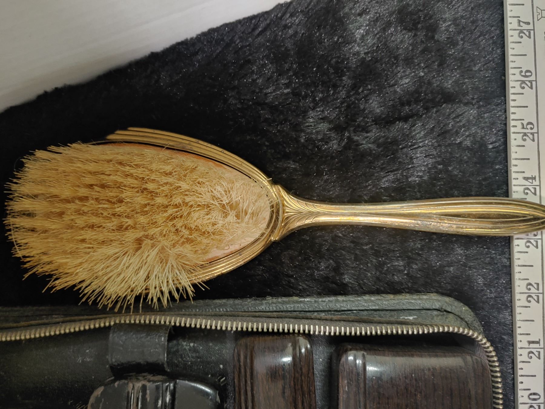 Ladies Brass Vintage Vanity items with Bakelite comb + mans Leather and Ebony Travel Case