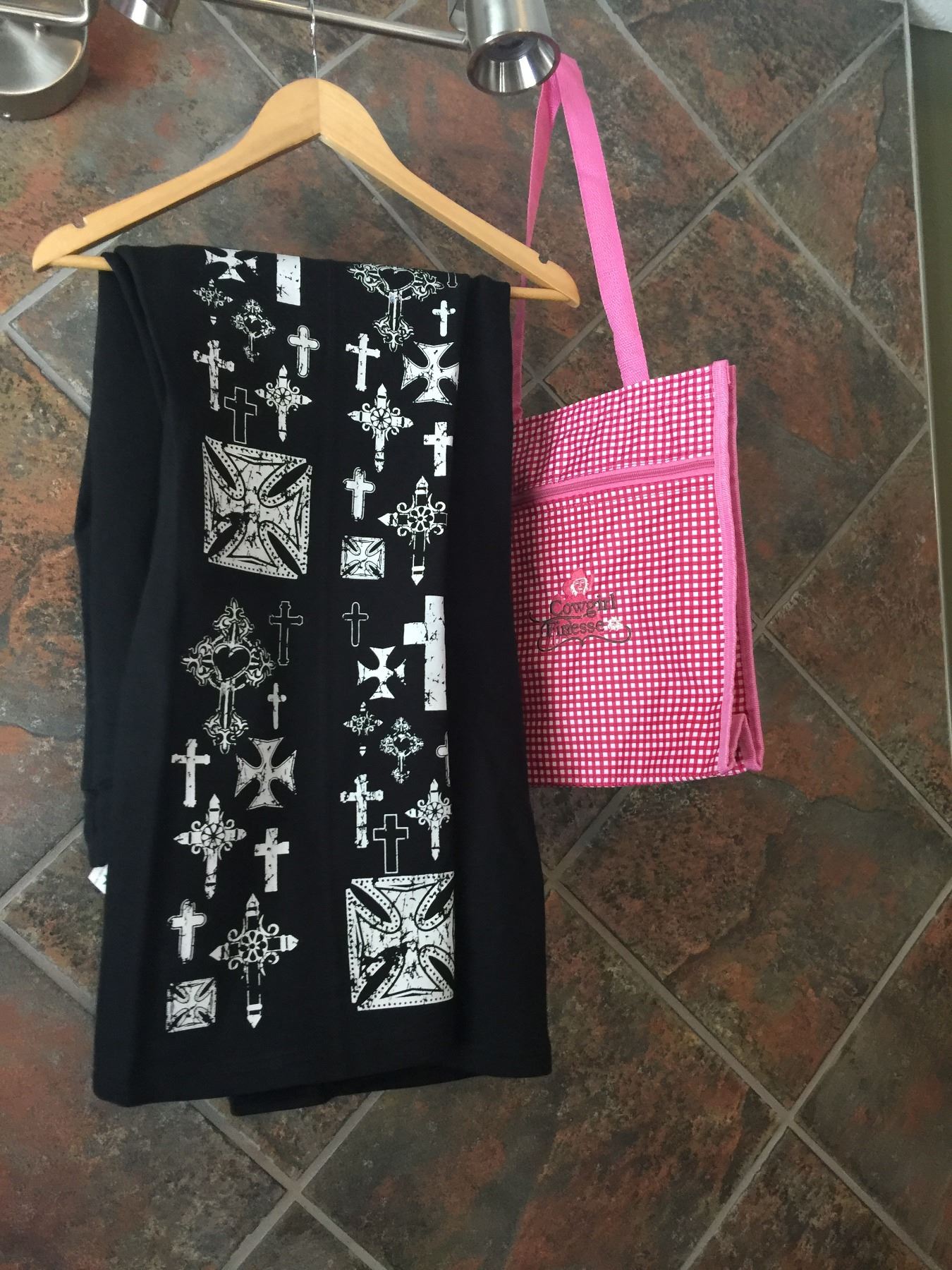 Ladies black capris with white crosses down the front and back /Crystals on a cross on back of pants/ size 2XL(18-20)/COWGIRL FINESSE FINESSE TOTE BAG