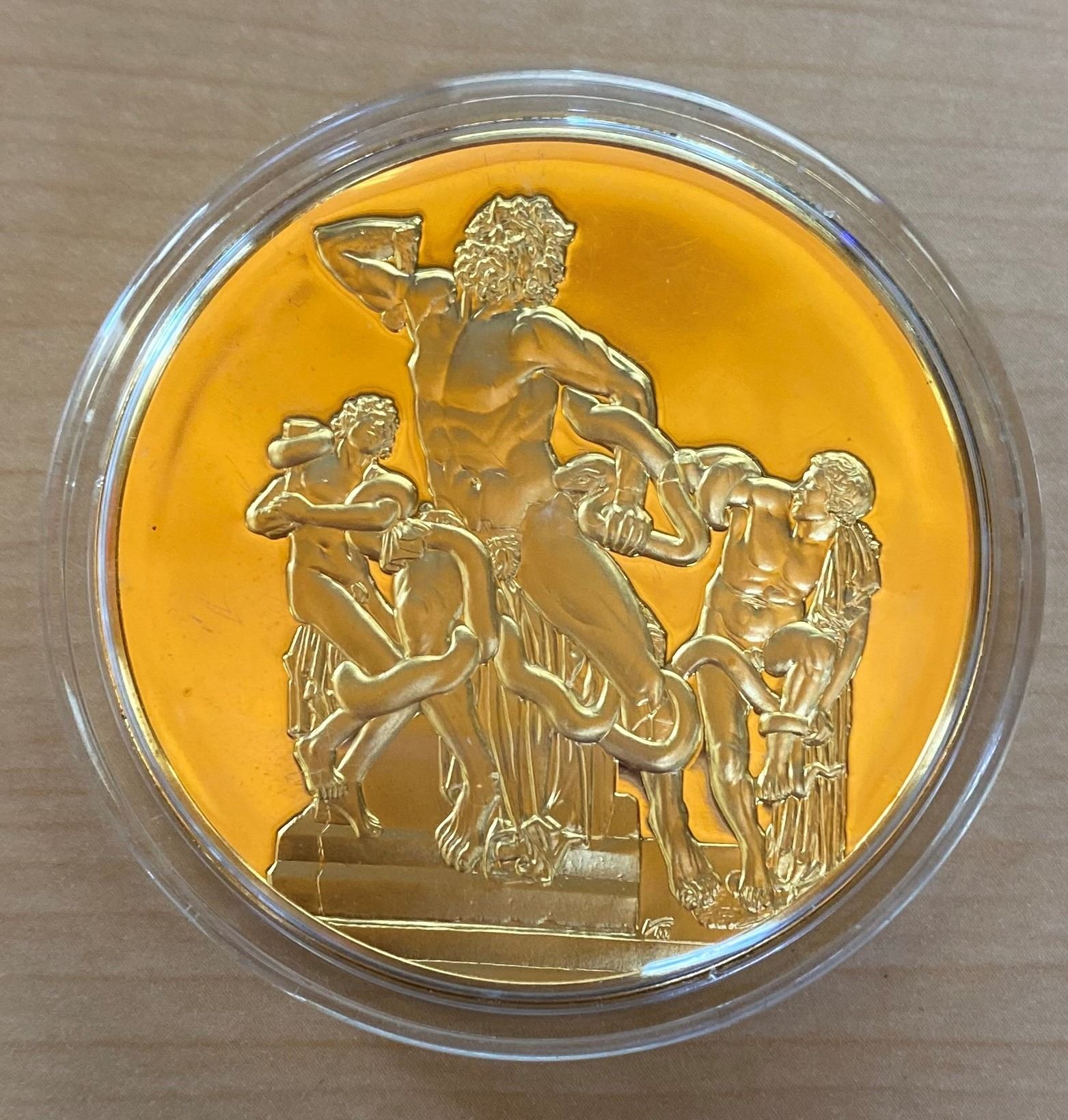 Laocoon. From the Ancient Greece medals series. A beautiful gold-plated bronze medal measuring 50mm in diameter and weighing 81.6 grams. In hard plastic holder. BU.