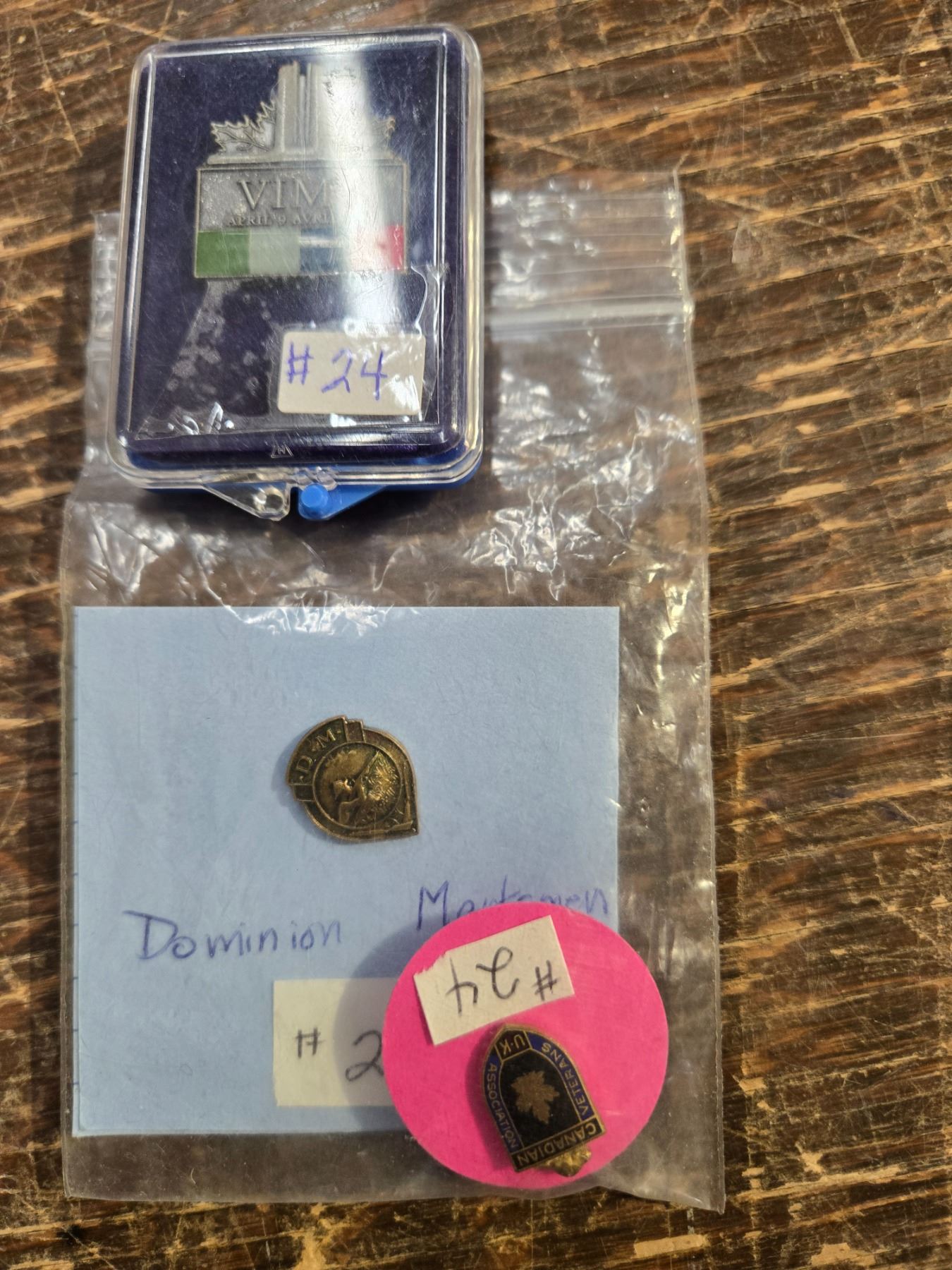 Lapel pins, Canadian Veterans Assoc., UK< Dominion of Canada Marksman, Vimy Memorial