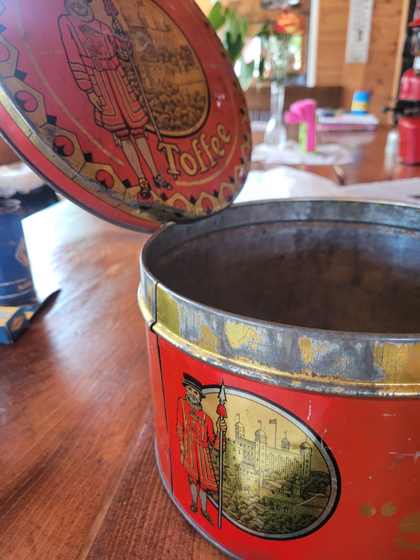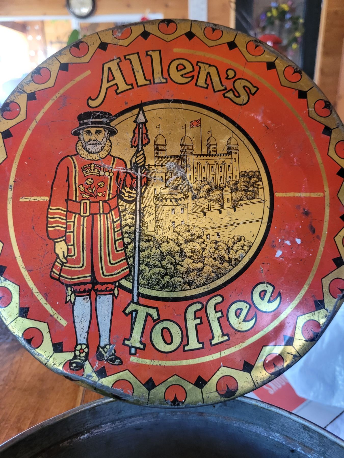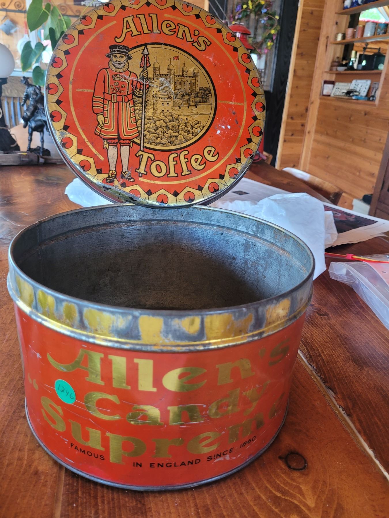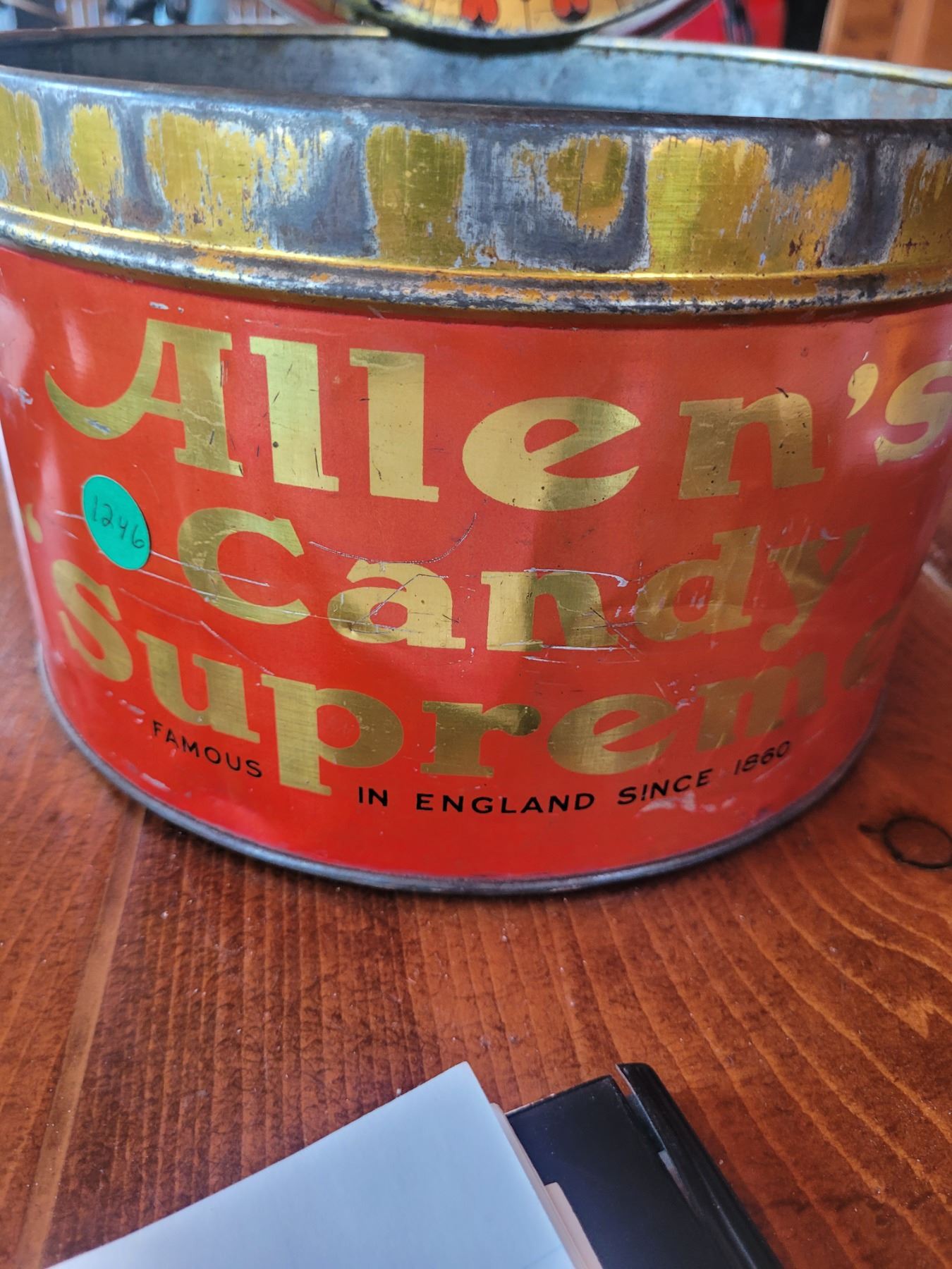 Large Allen's candy counter disply tin lid is cut to sit on rim - great graphics
