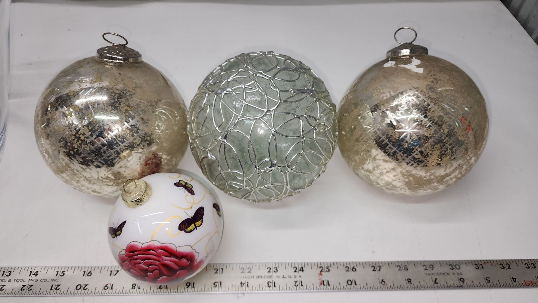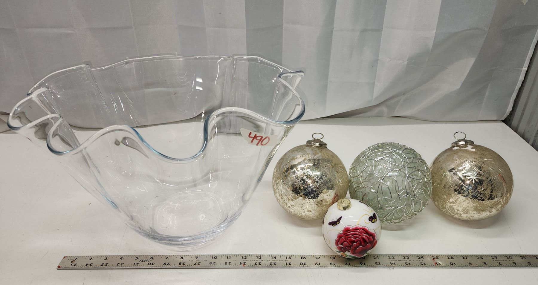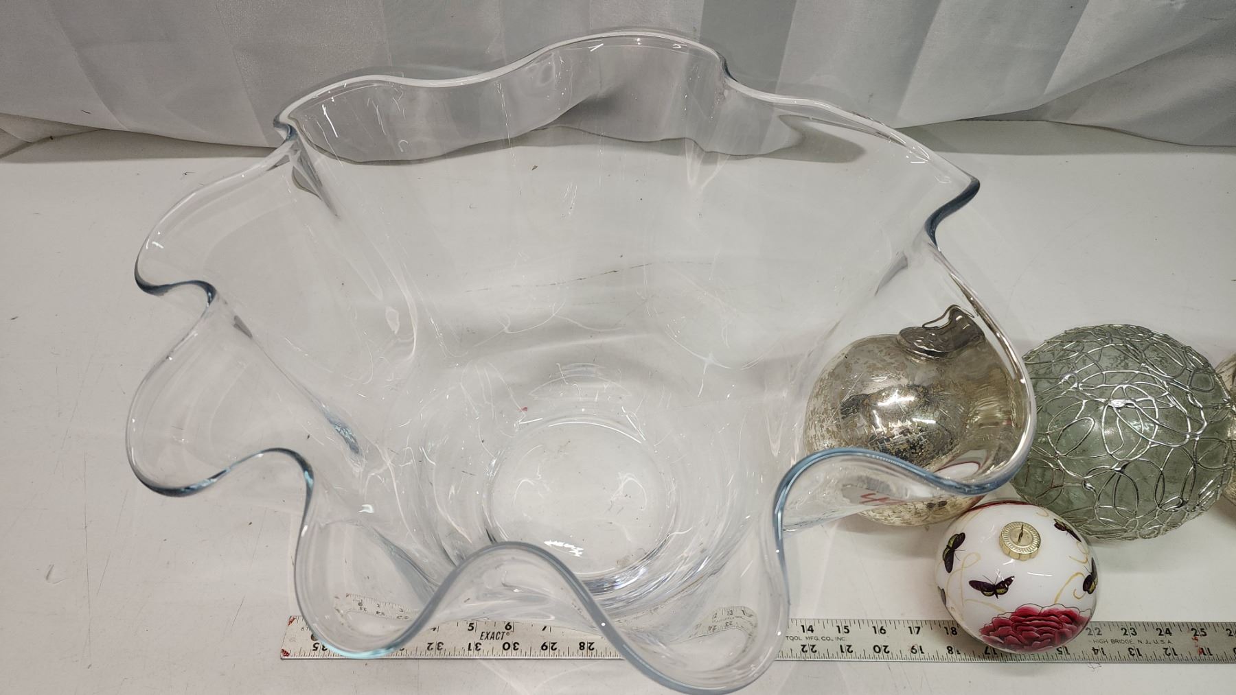 Large Glass decorative bowl & 4 Decorative glass balls - 17"W x 12"H