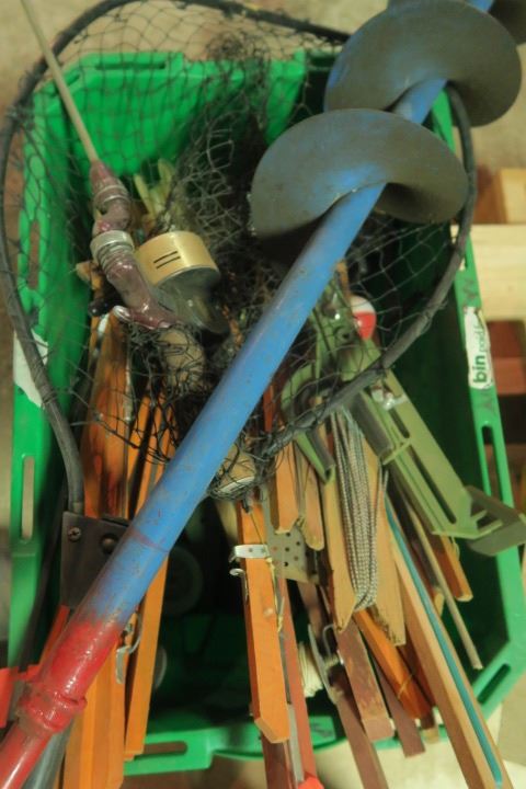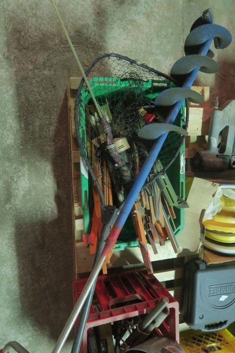 Large Lot of Fishing Supplies Including Auger, Pole, Net, and More!