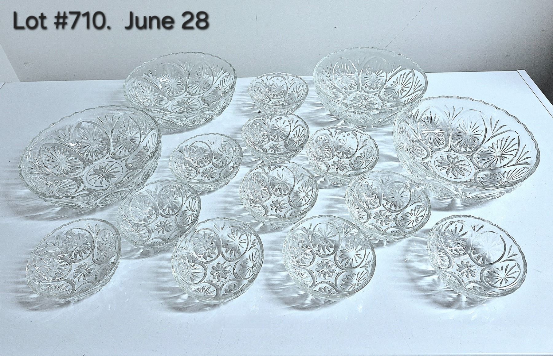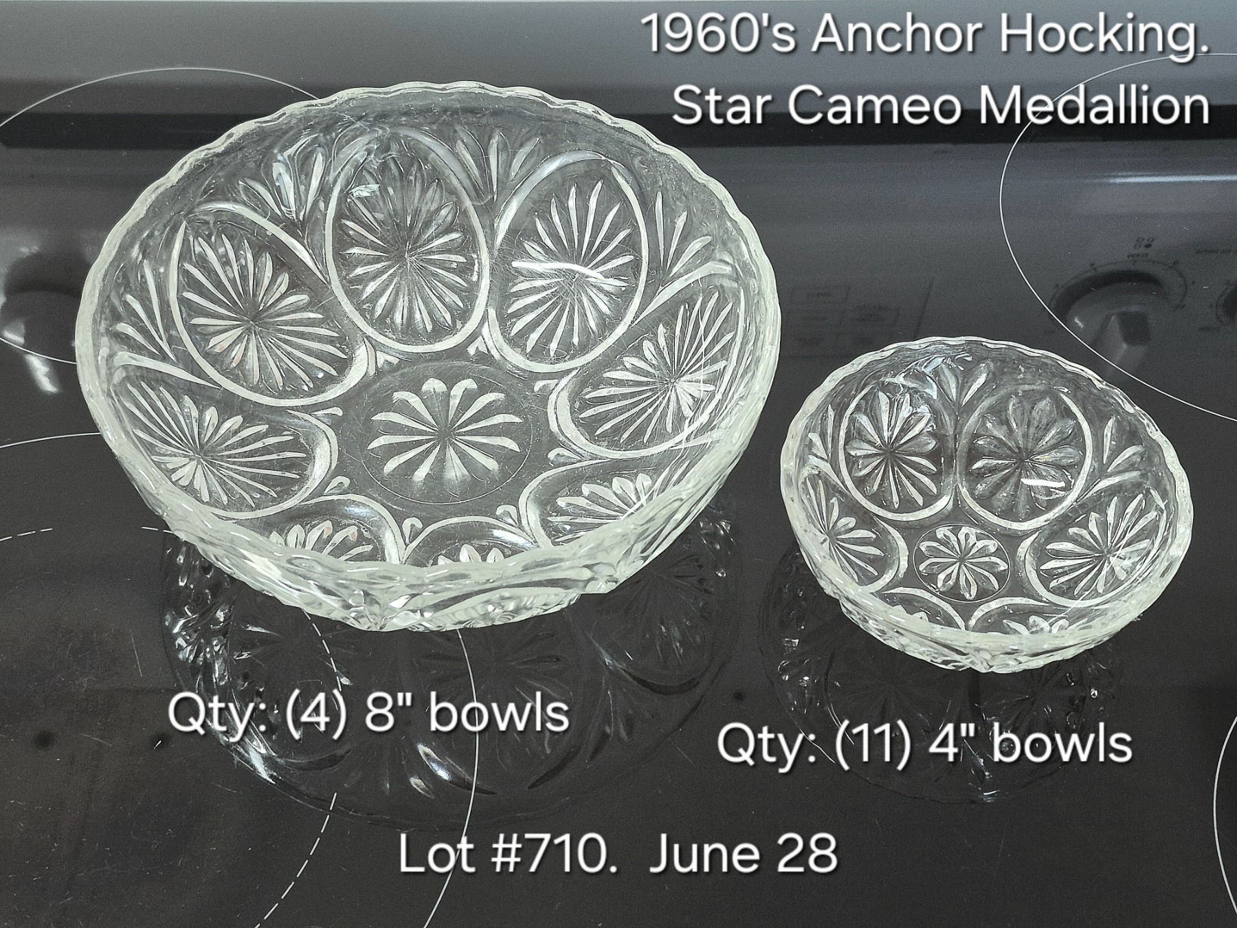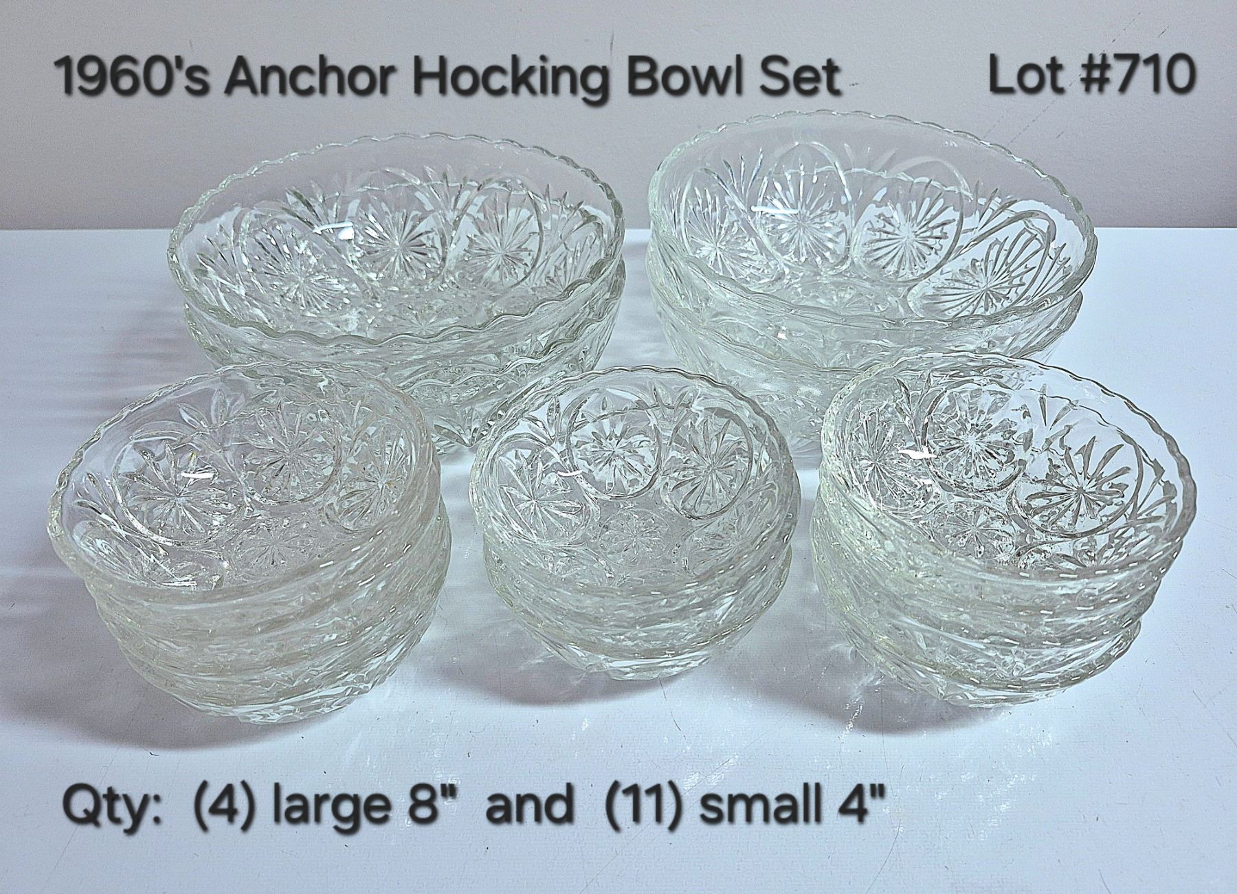 Large Lot of Vintage (1960's) Anchor Hocking Star Cameo Medallion Bowls. Includes (4) large 8" bowls + (11) small 4" bowls.