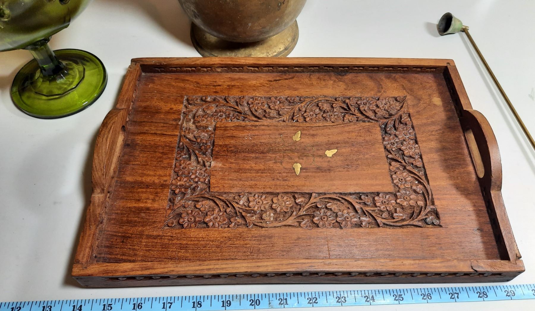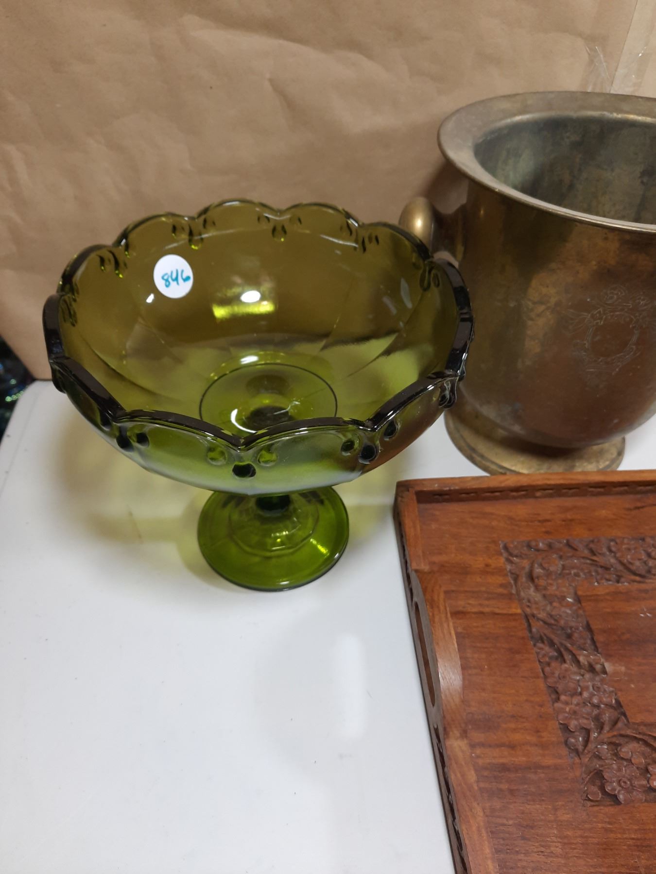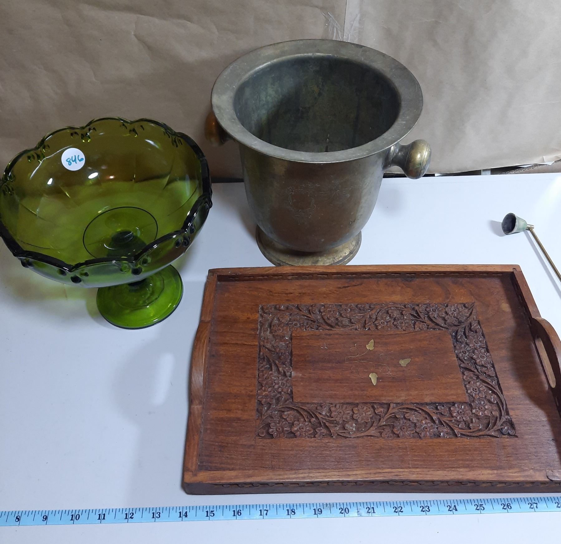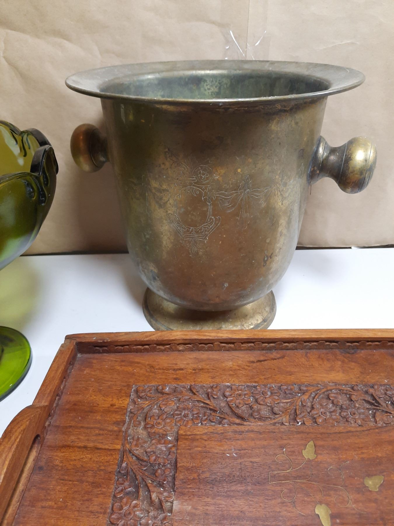 Large Pedestal Bowl, Brass Wine Cooler/Bucket, Wood Tray