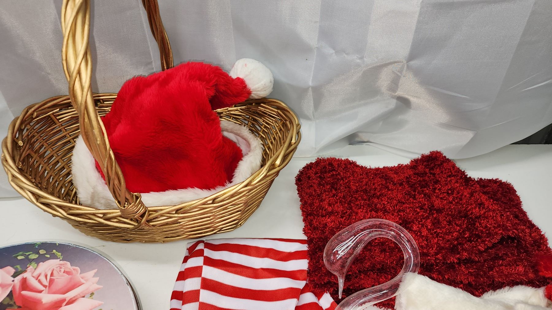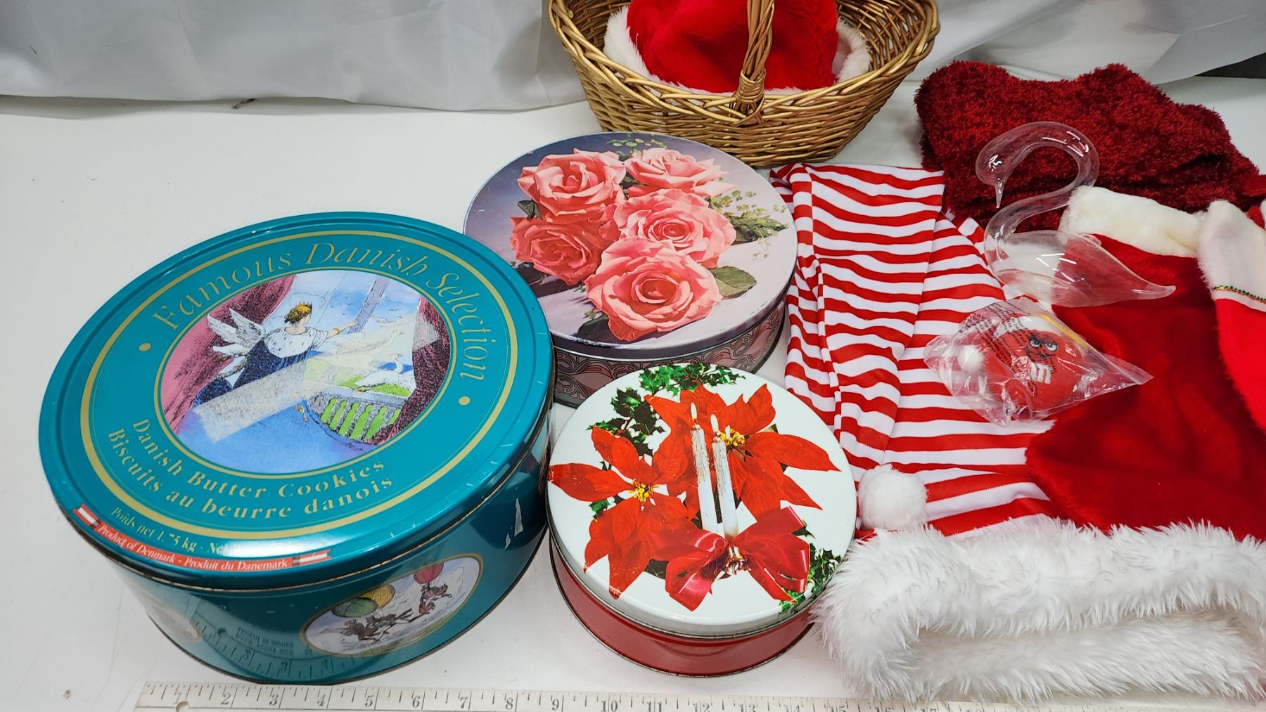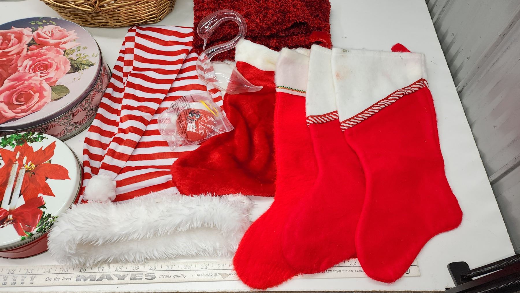 Large collection of Christmas items - Tins, stockings, ornaments, basket, etc.