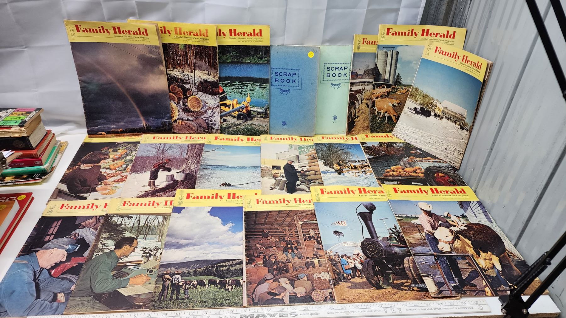 Large collection of "Family Hearld" magazines and 2 scrapbooks filled with old newspaper clippings