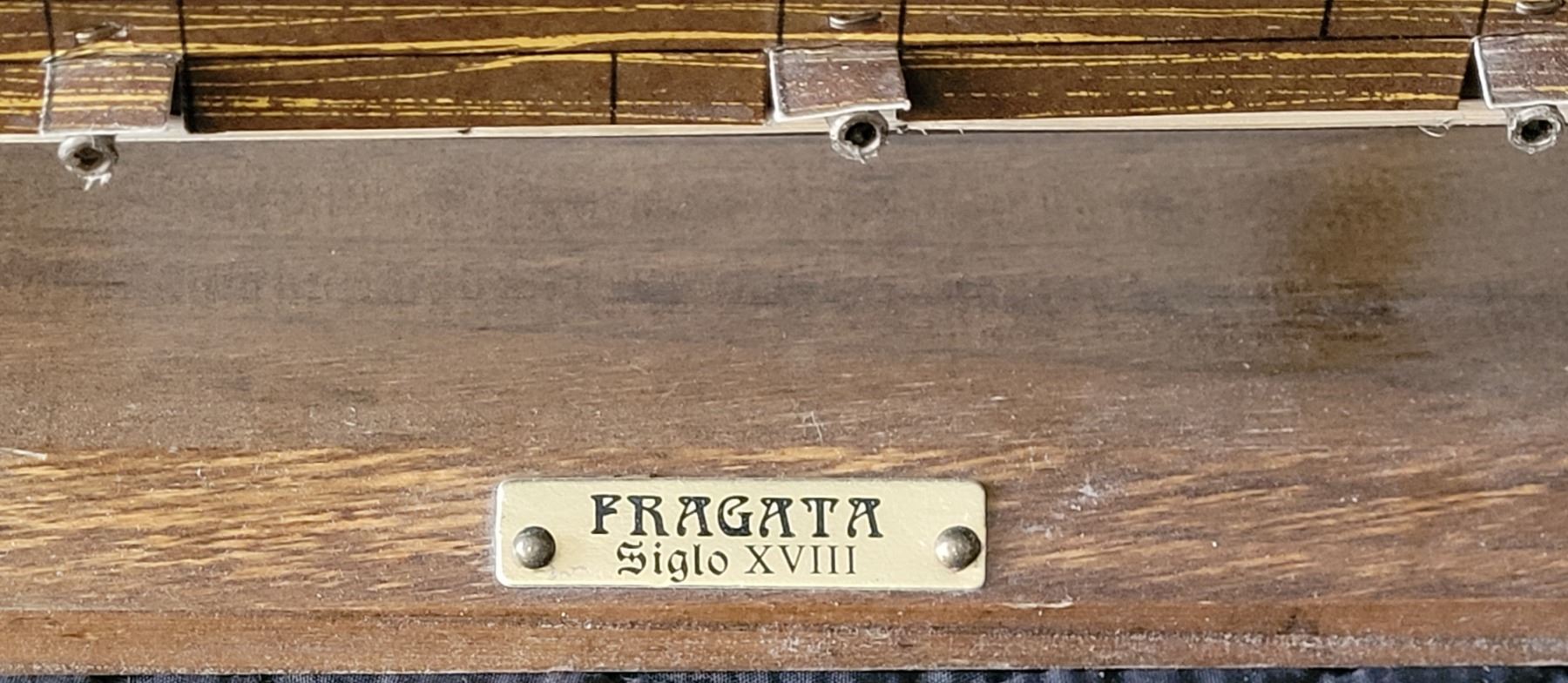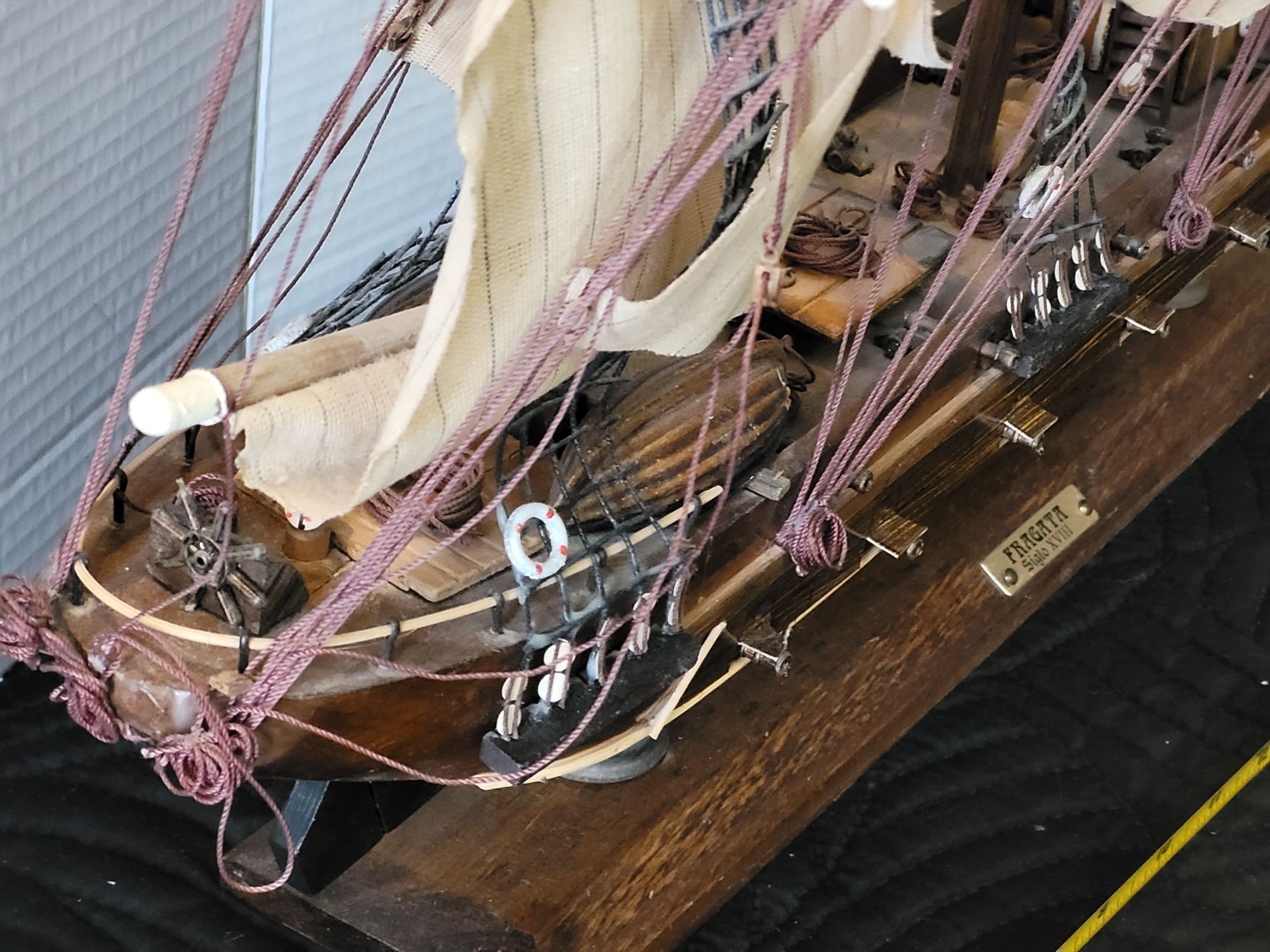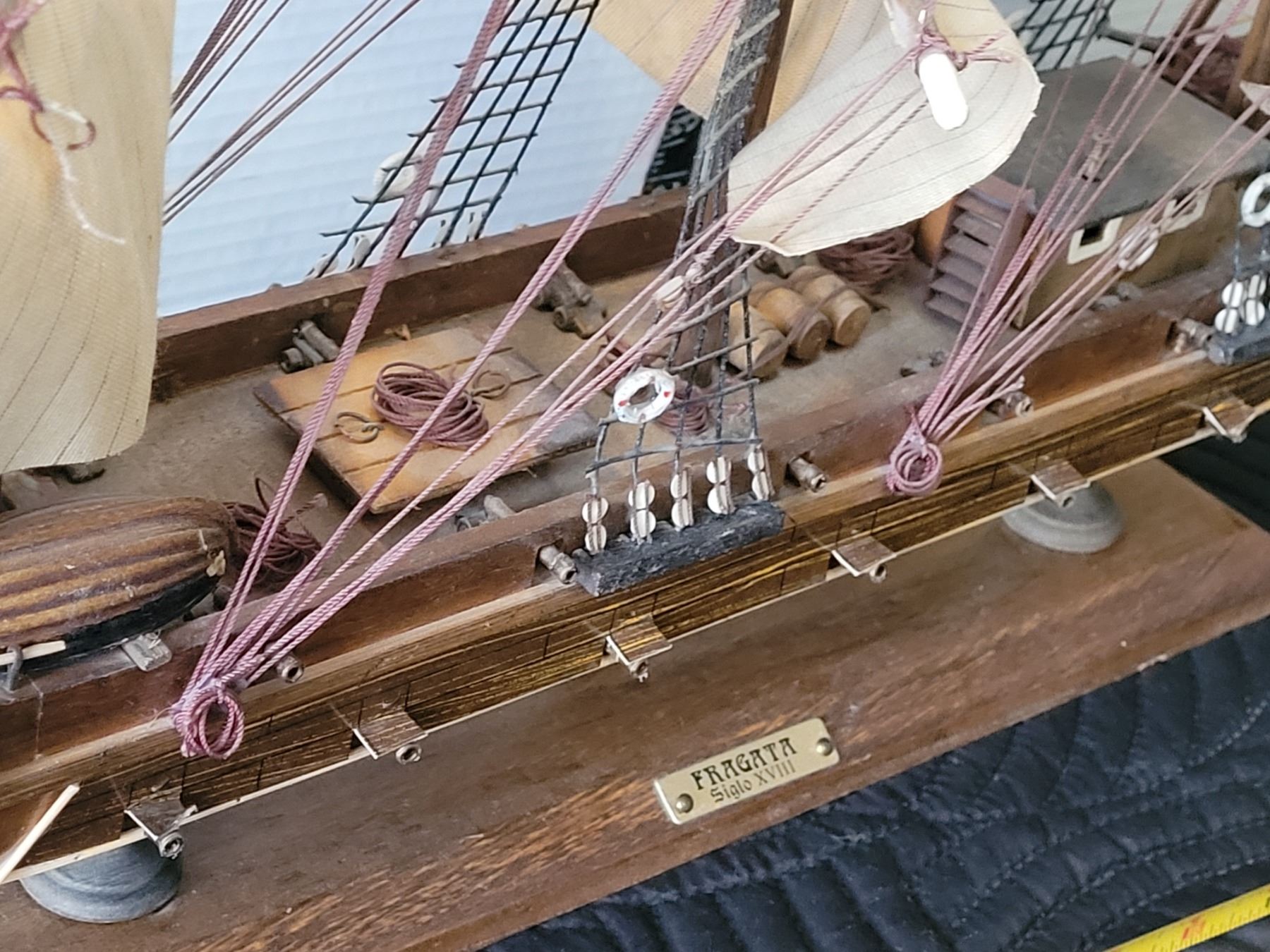 Large detailed Frigata Siglo XVIII model ship. Wood, cloth sails & cord. 20+” tall, 26+” wide