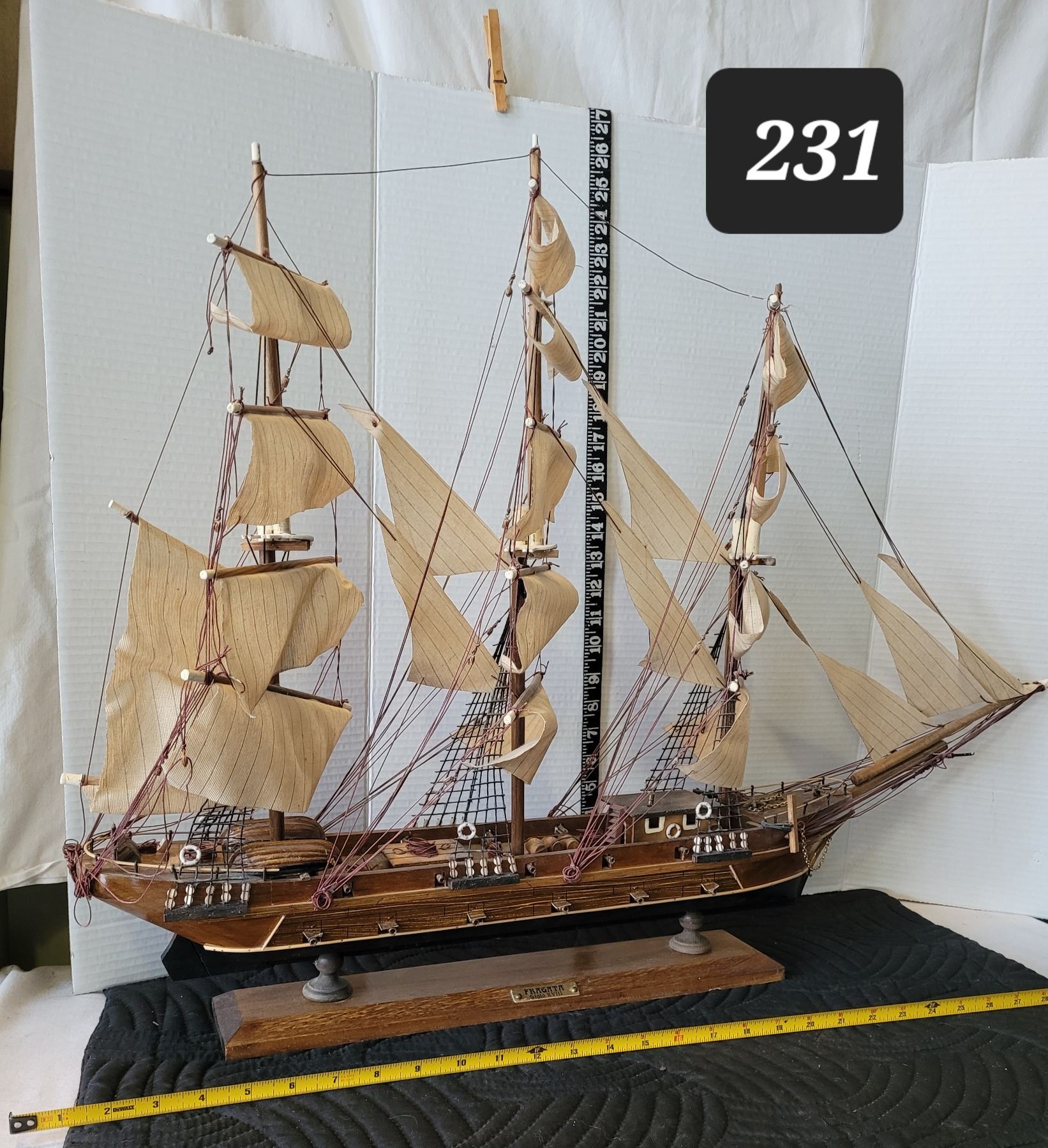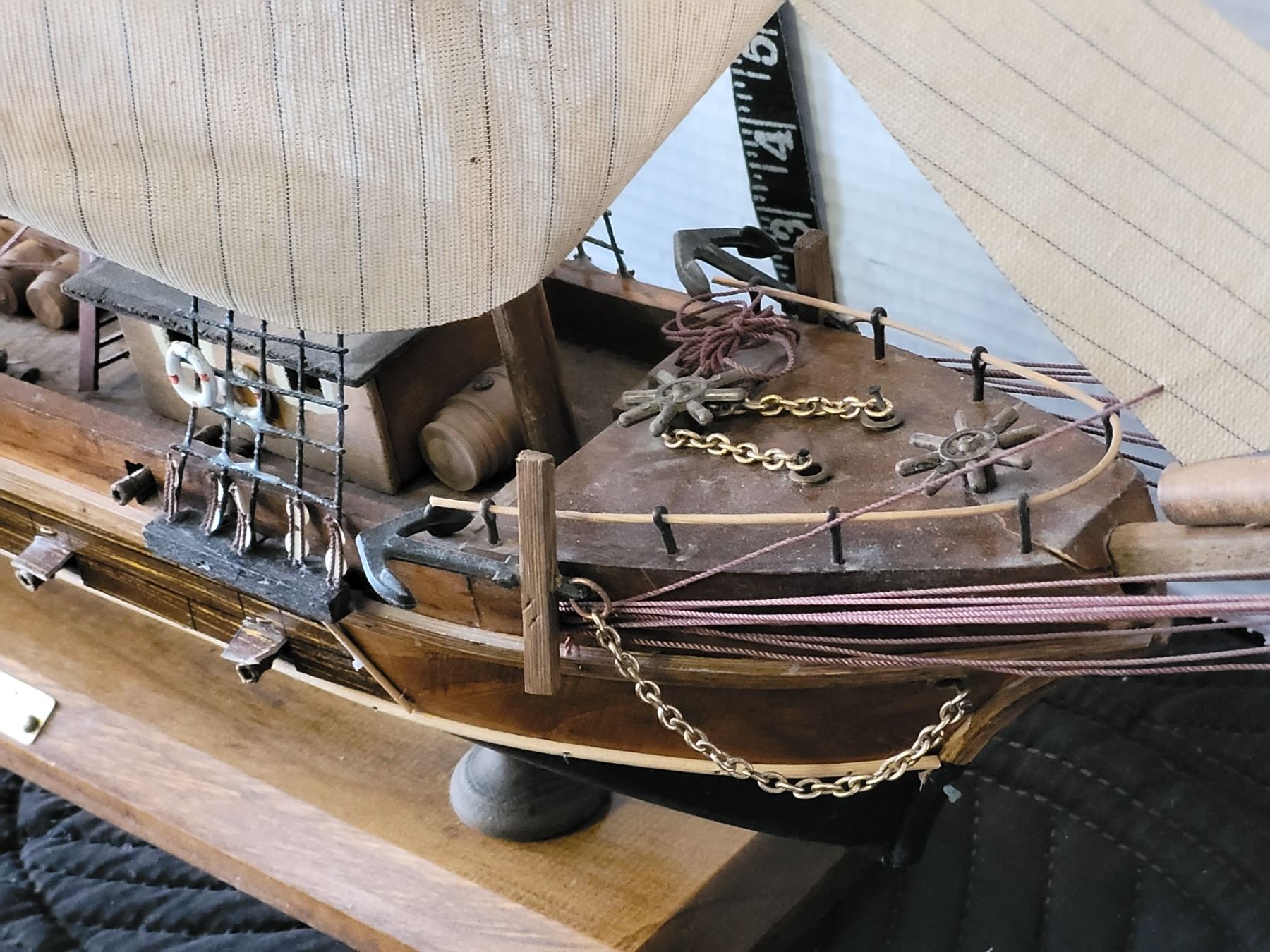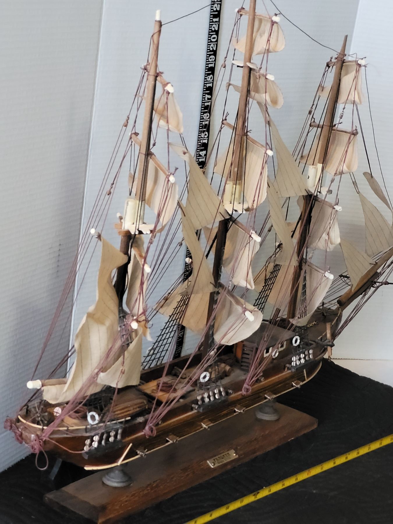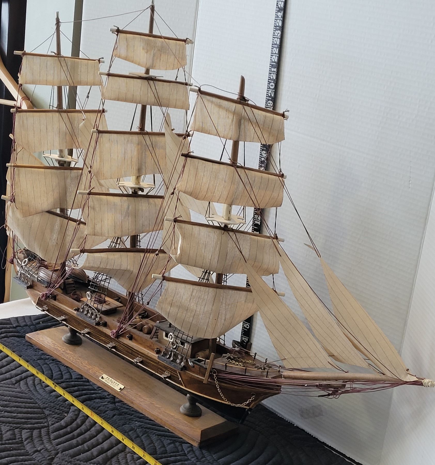 Large detailed Frigata Siglo XVIII model ship. Wood, cloth sails & cord. 20+” tall, 26+” wide