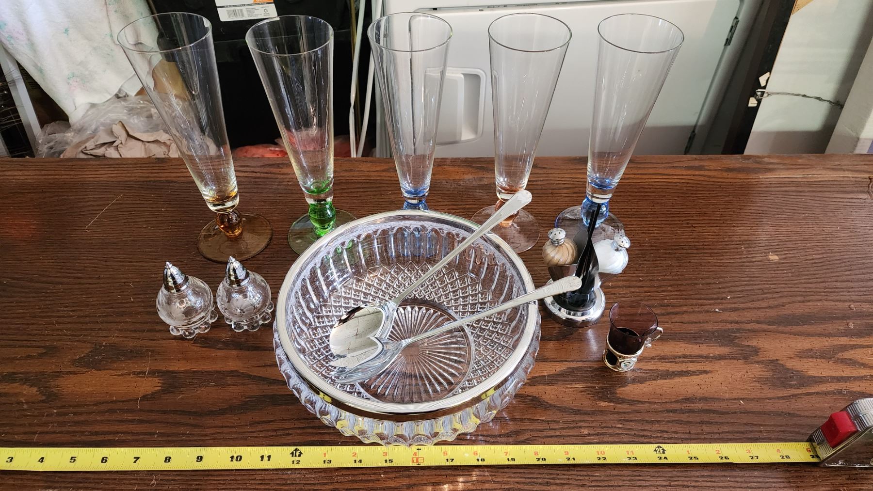 Large glass wine glasses, crystal salad bowl, and salt n pepper shakers
