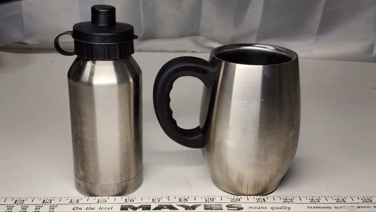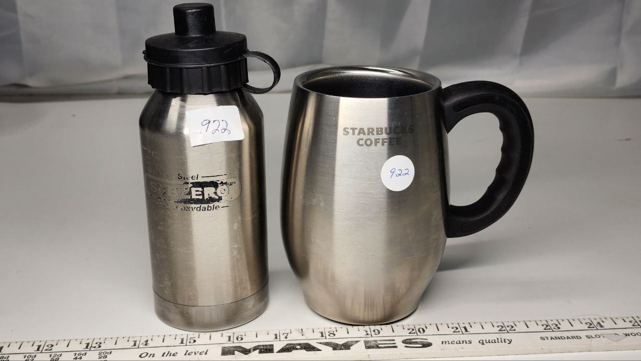 Large stainless steel STARBUCK thermos coffee mug & smaller stainless thermos water bottle