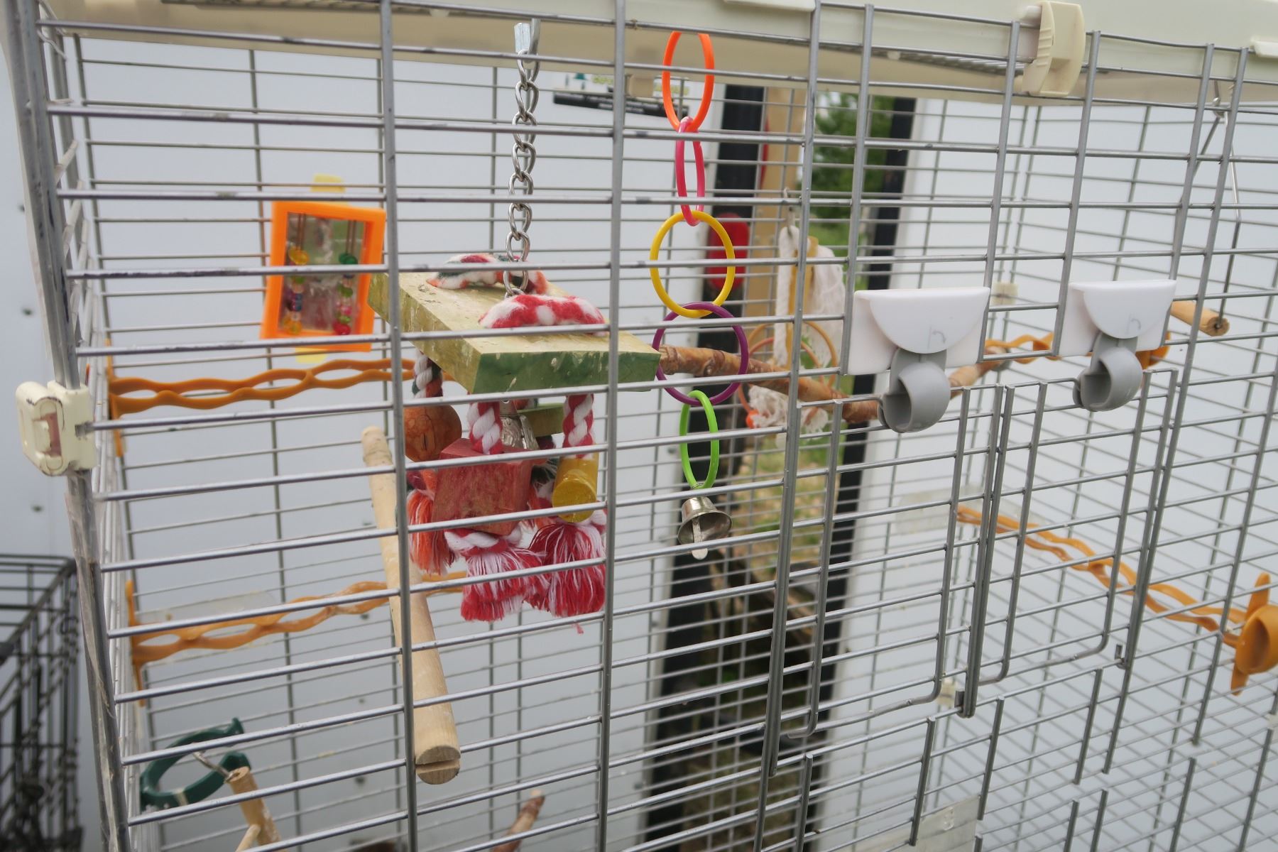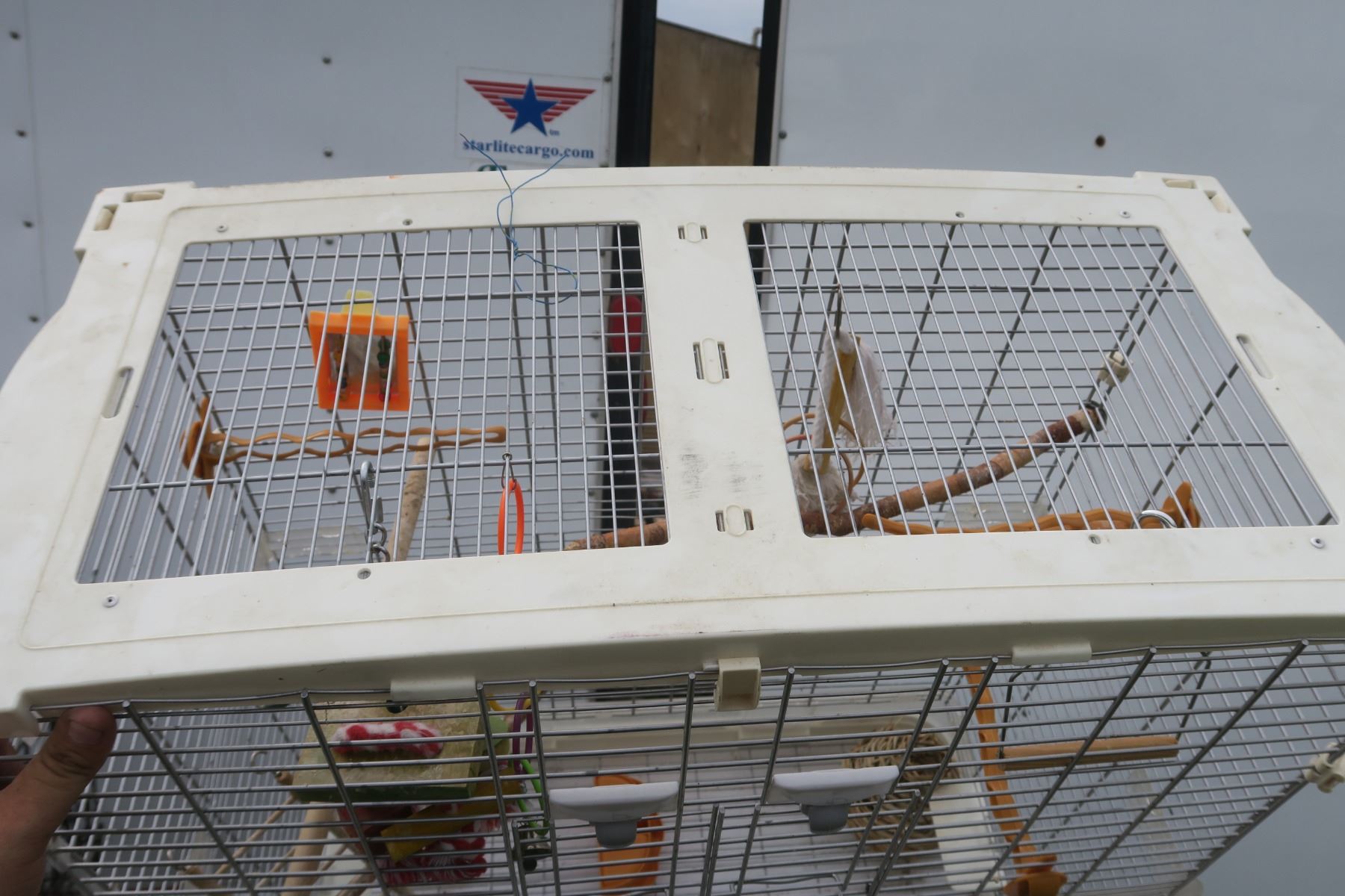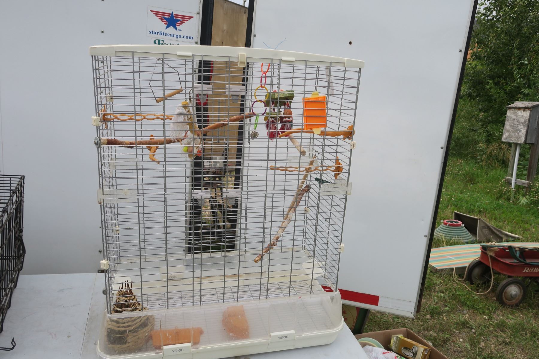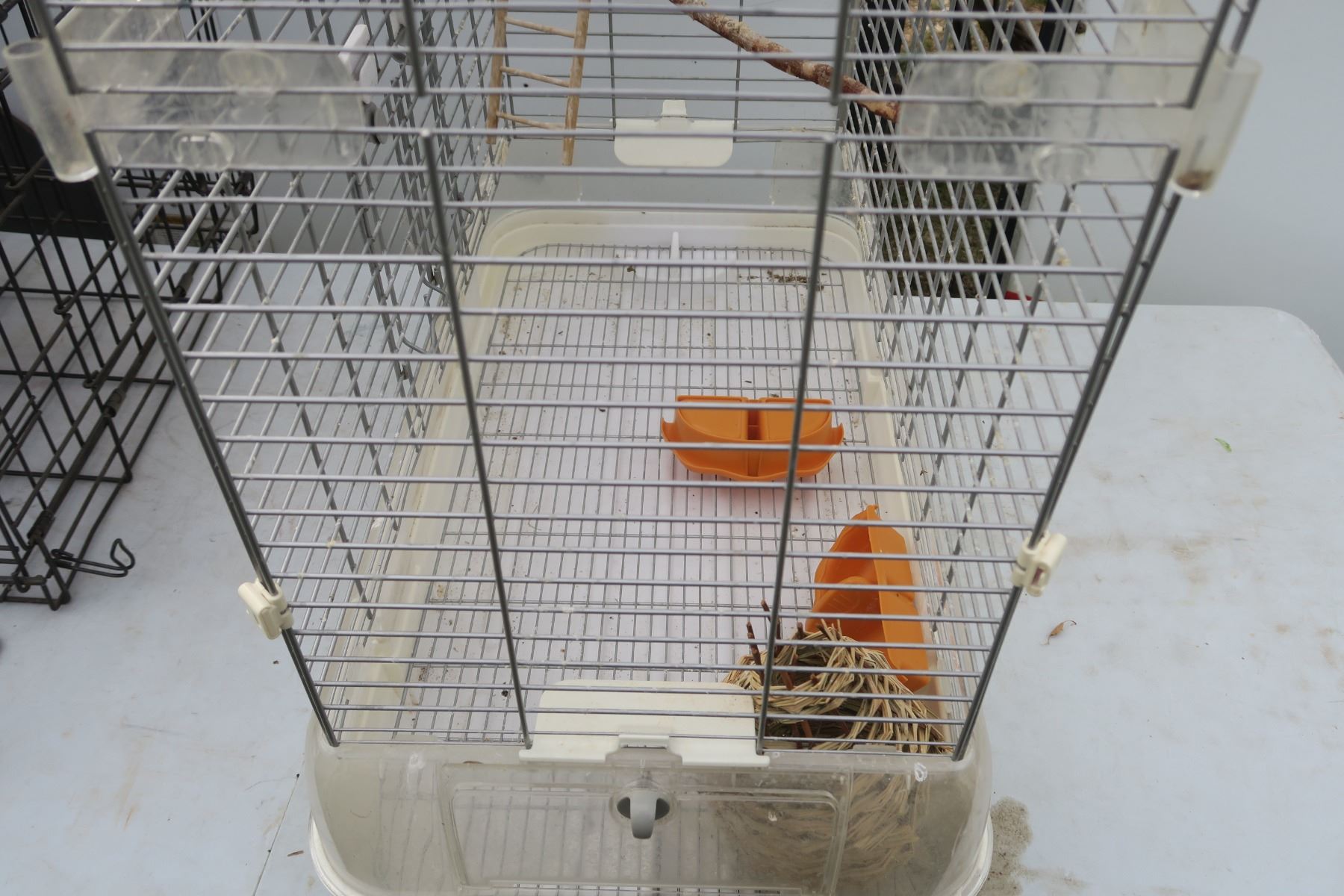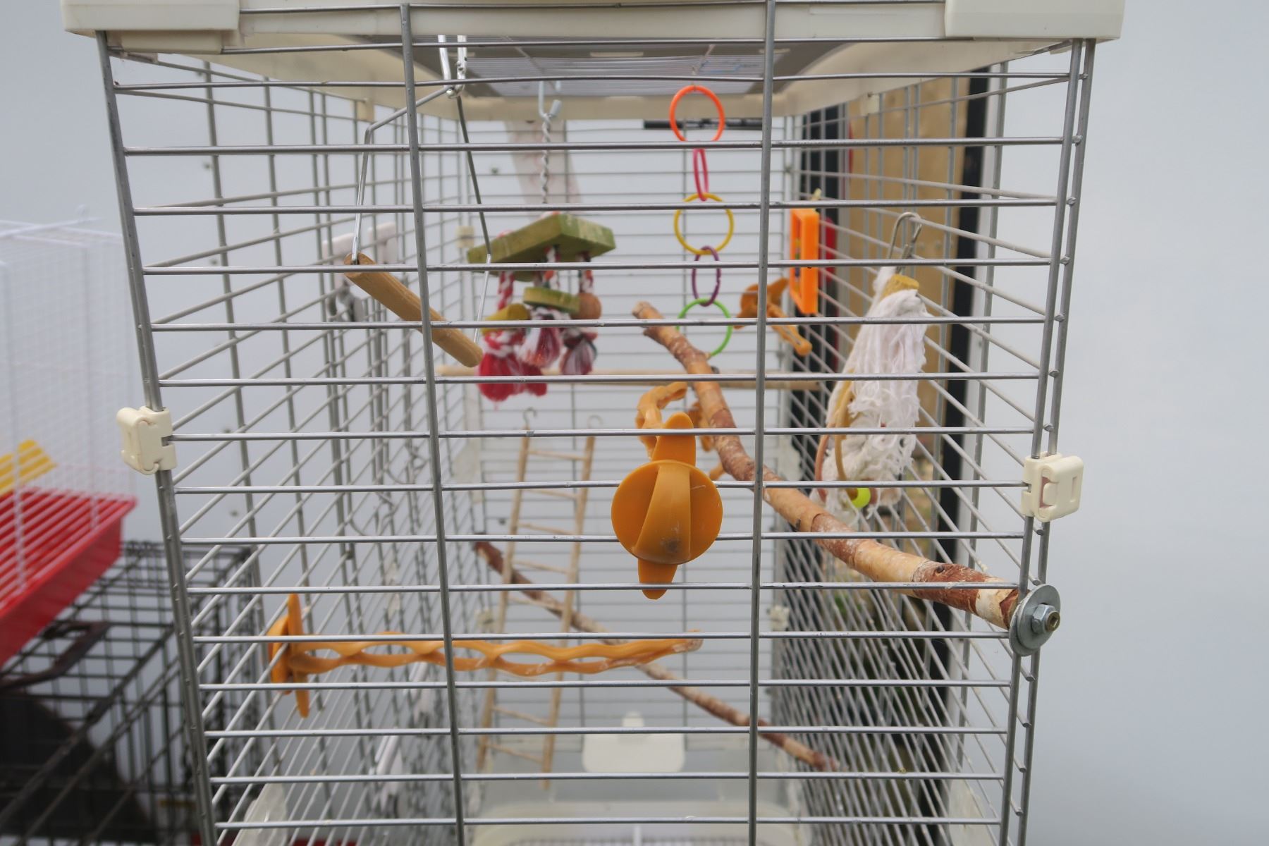Large white bird cage with accessories