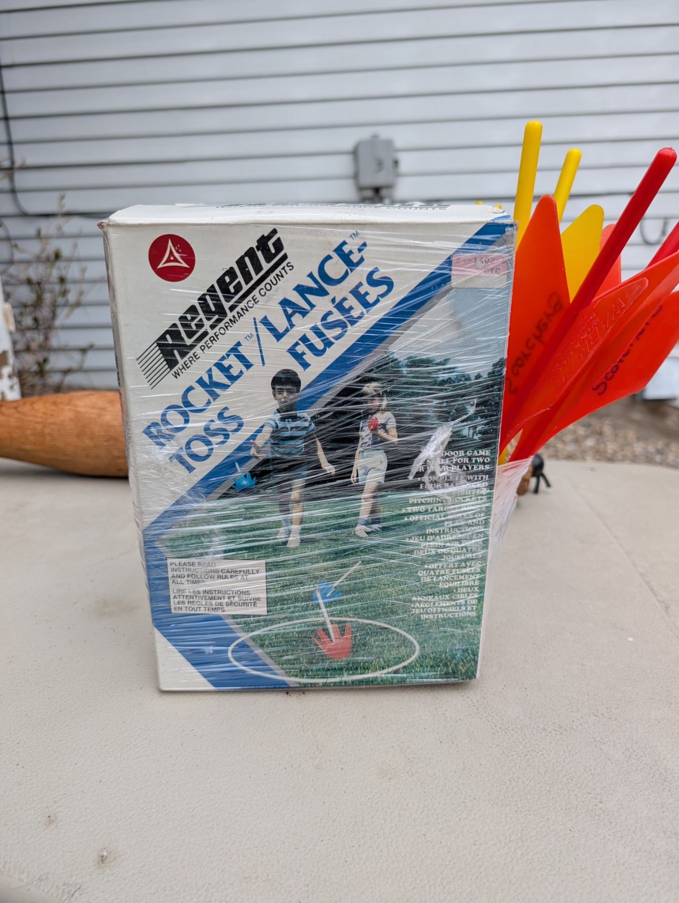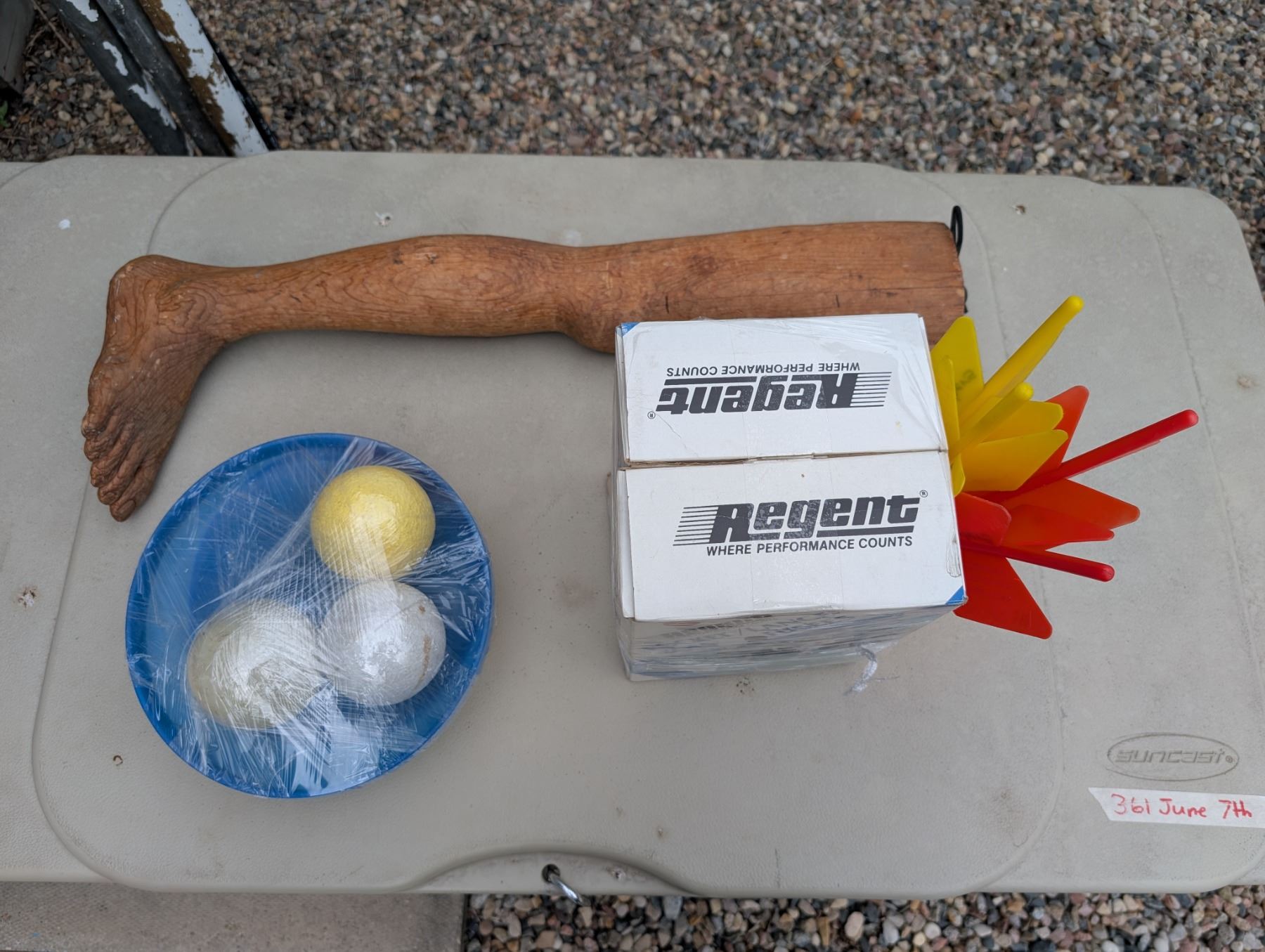 Lawn Darts (3) toy balls, Frisbees, and Wooden Foot