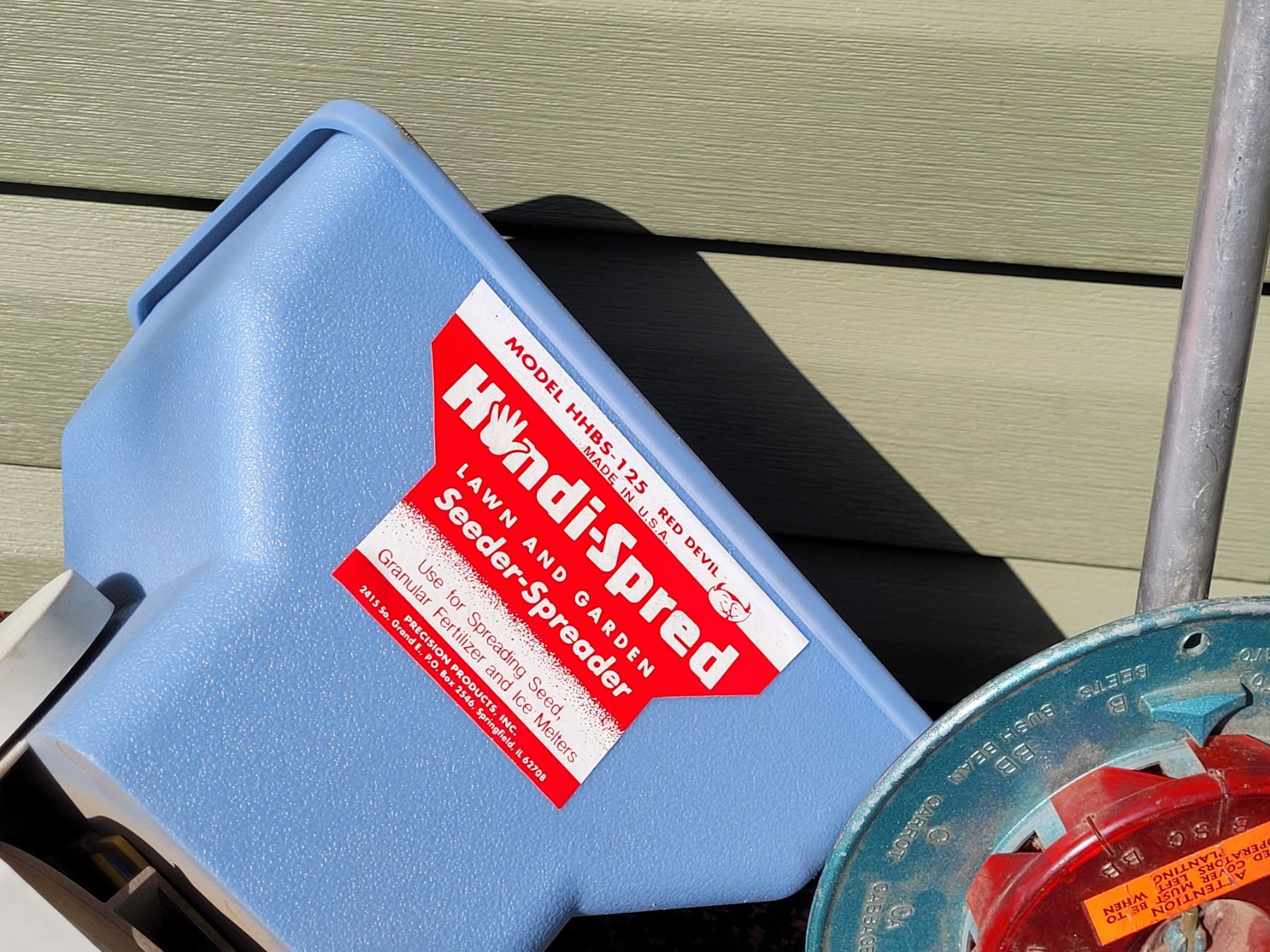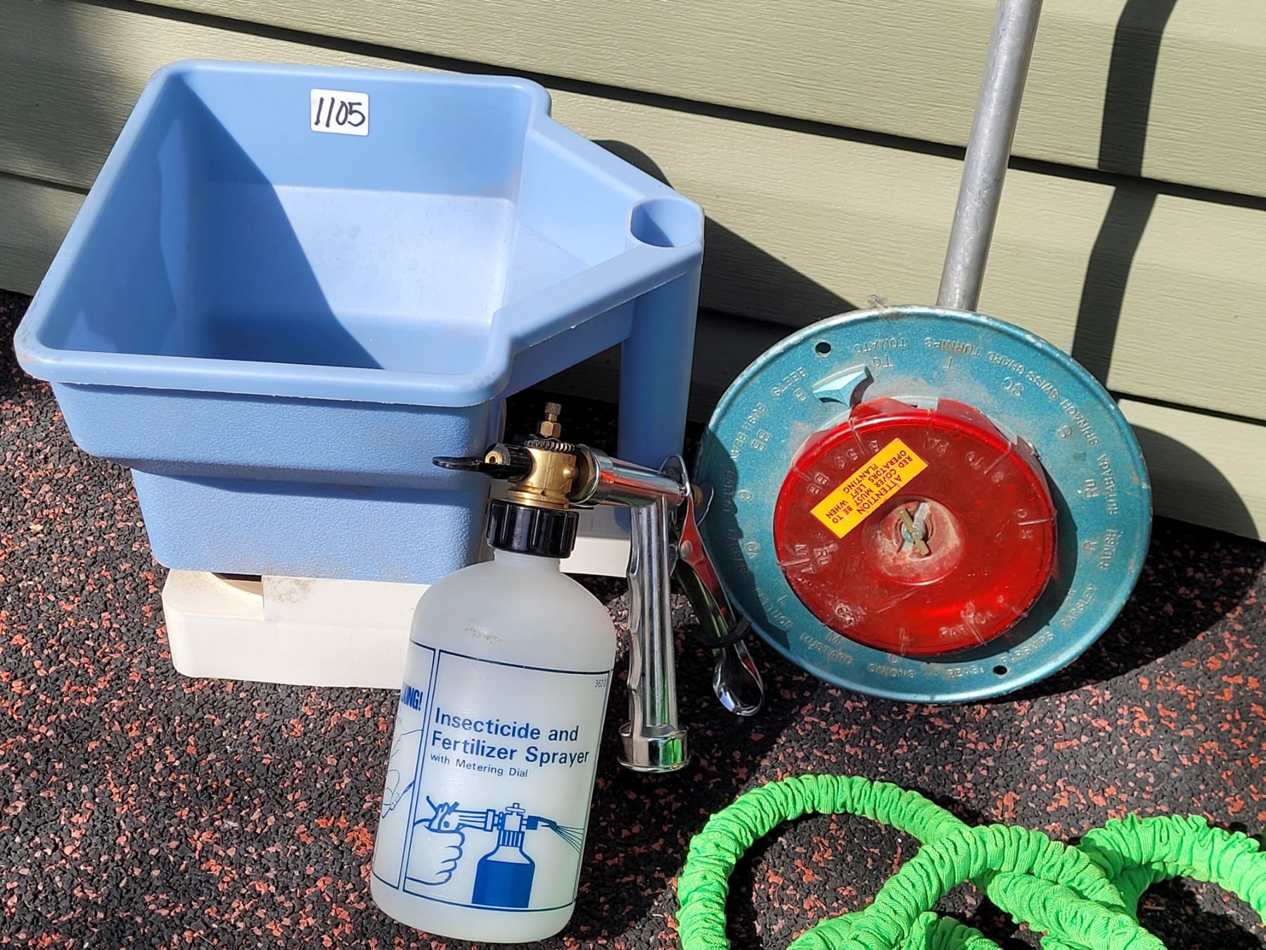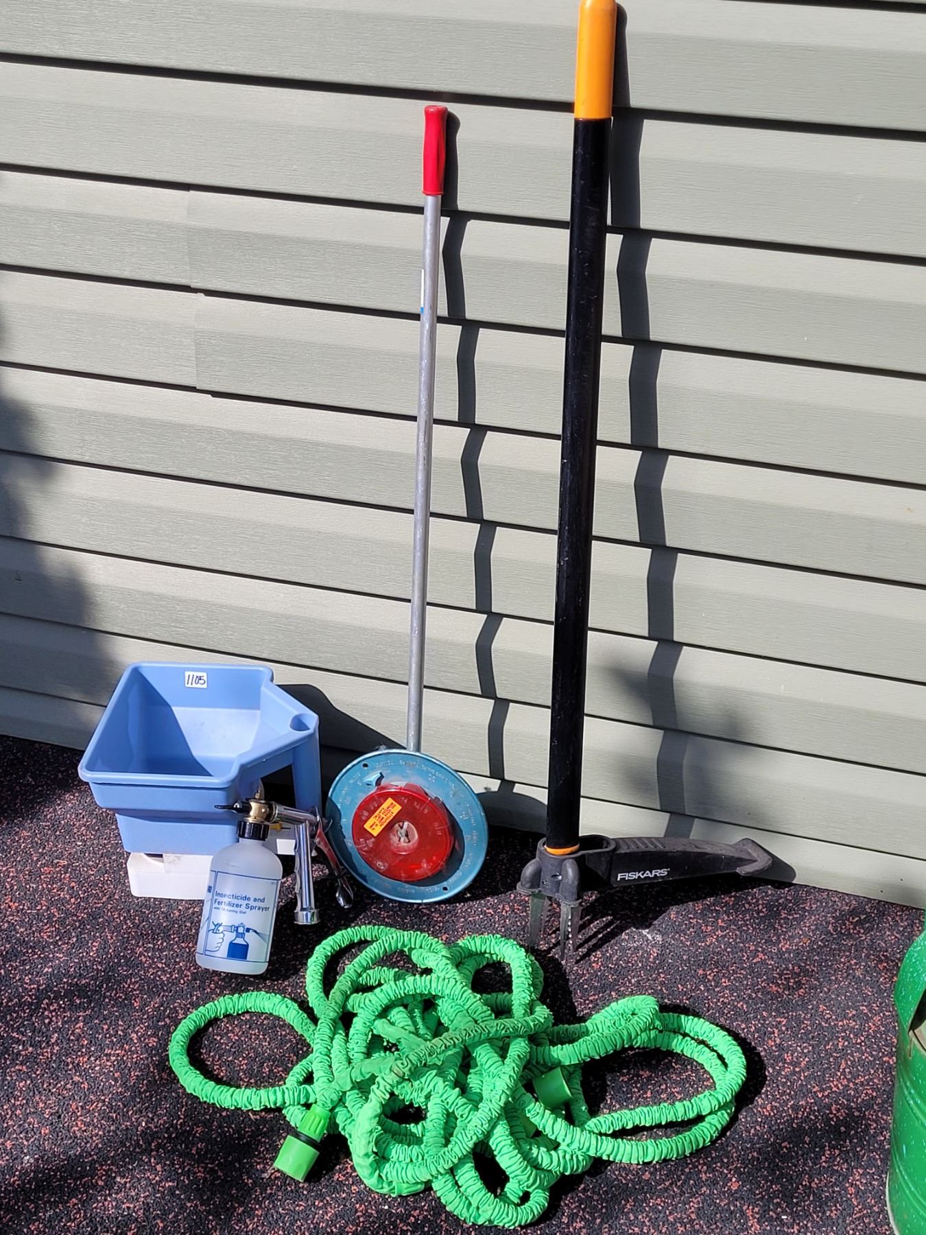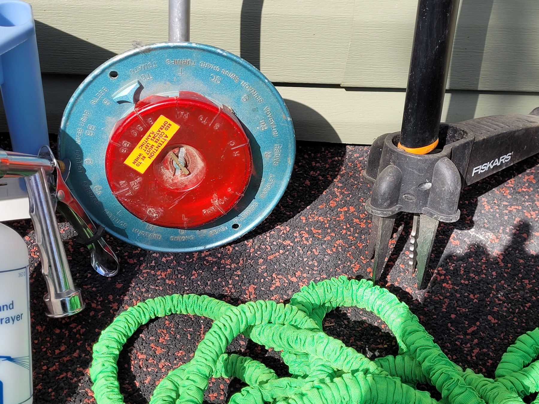 Lawn & garden tools. Fiskars weeder, seeders & a fertilizer sprayer.