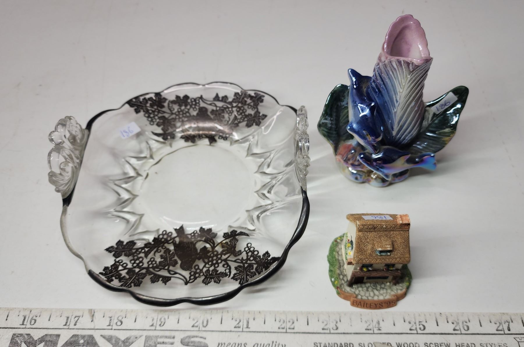 Lead inlayed glass dish, "Bailey's 95" mini house & Porcelain dolphin ornament