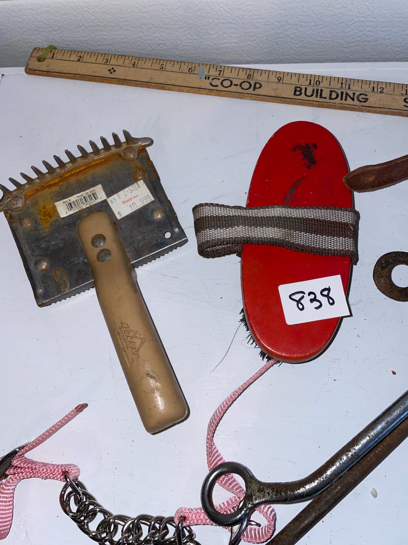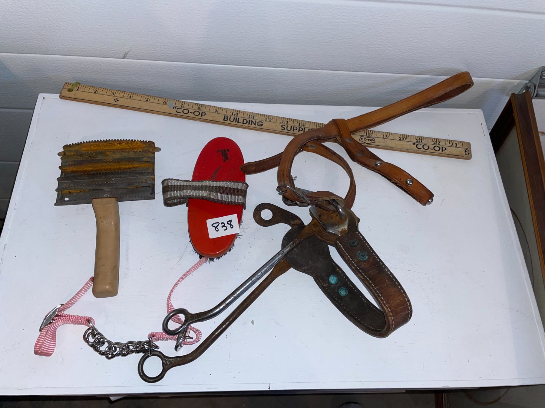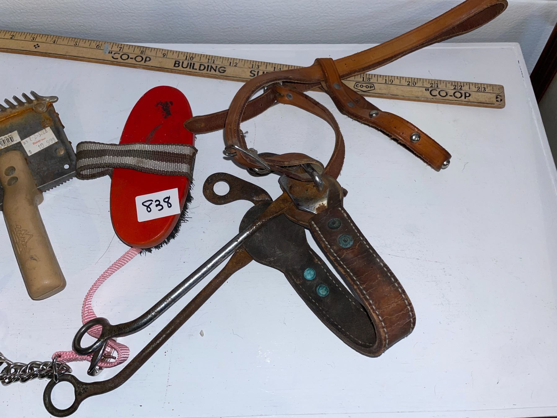 Leather bridle piece, and grooming tools