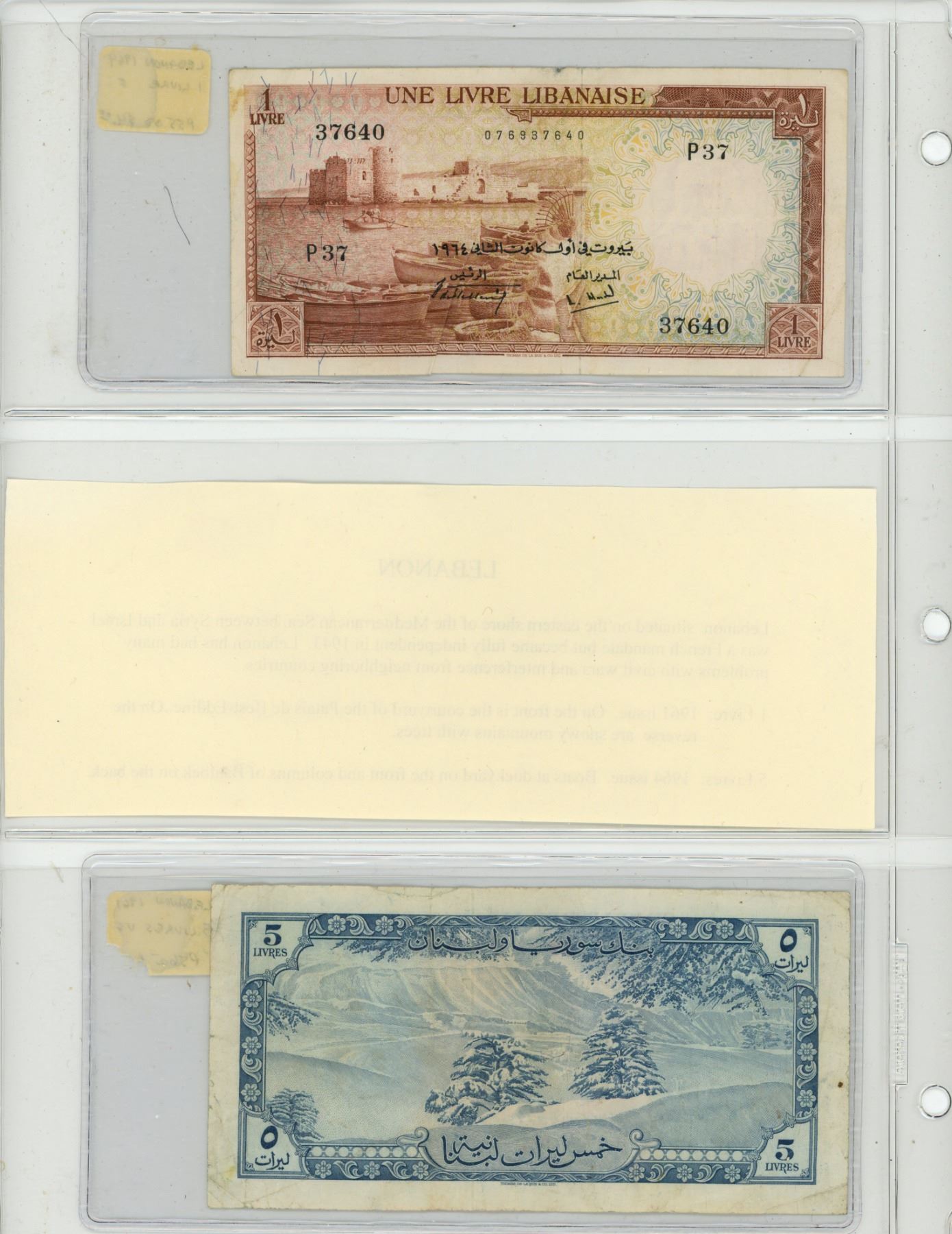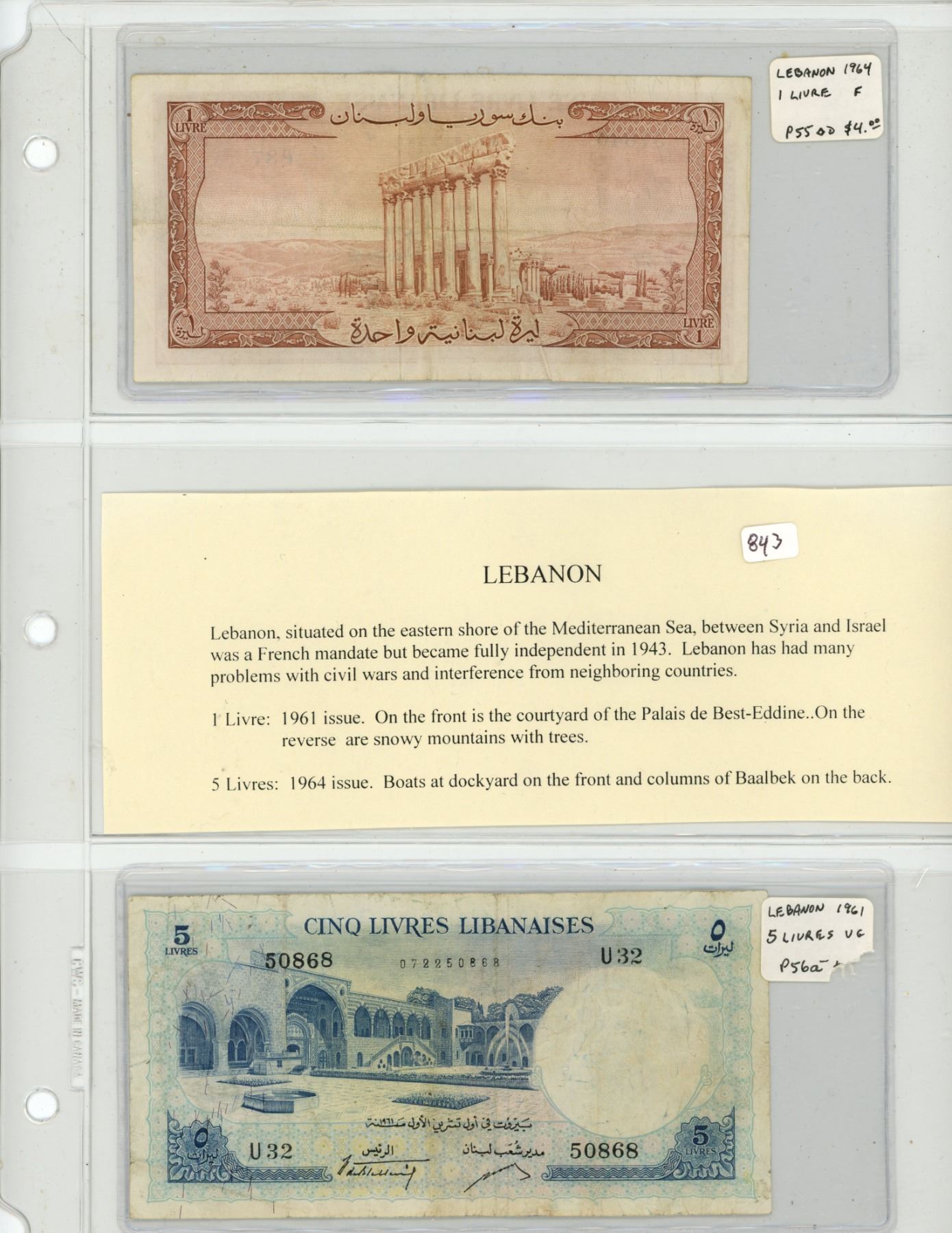 Lebanon. Lot of 2 notes: 1964 1 Livre P-55 F and 1961 5 Livres P-56a VF.