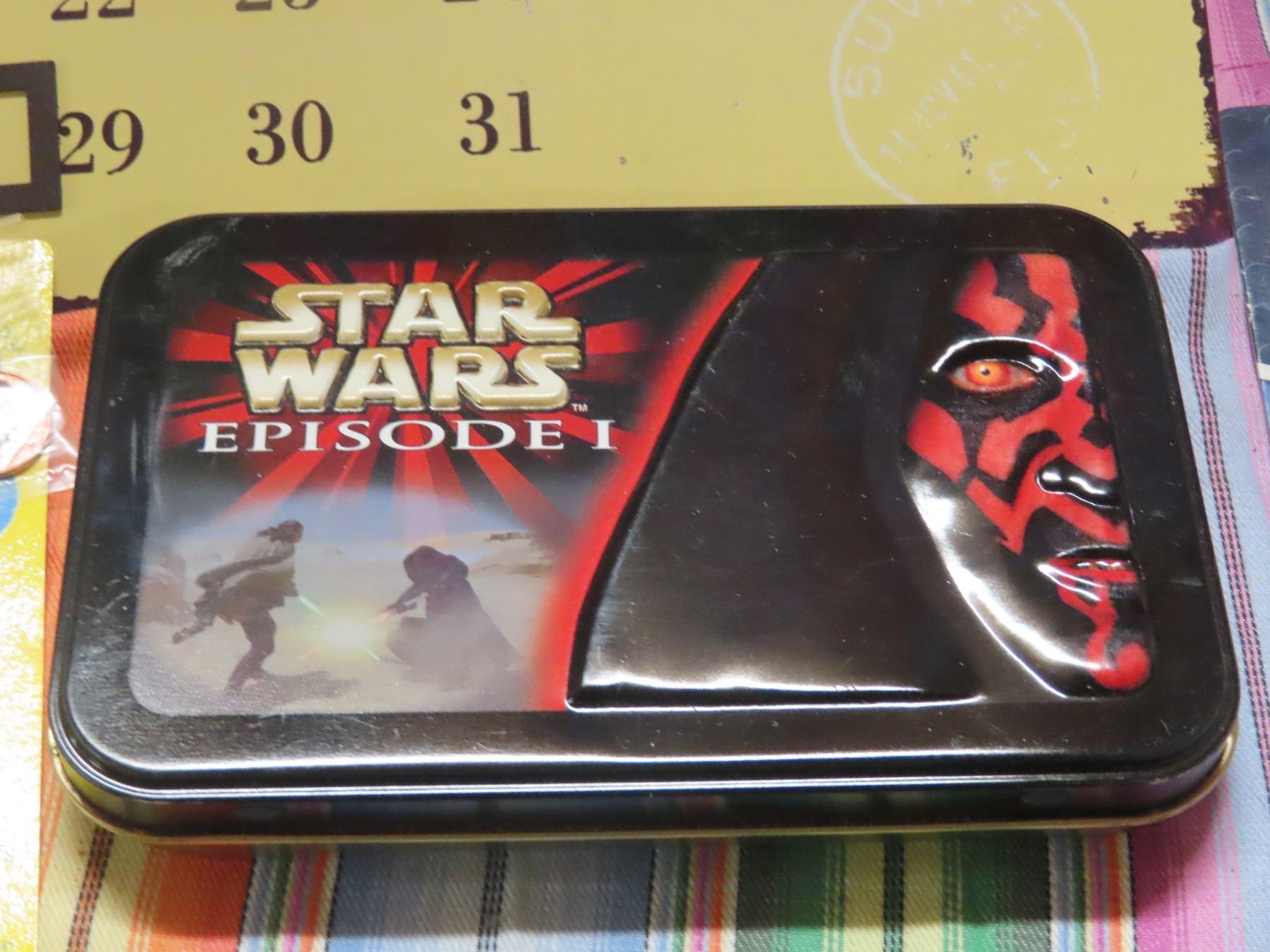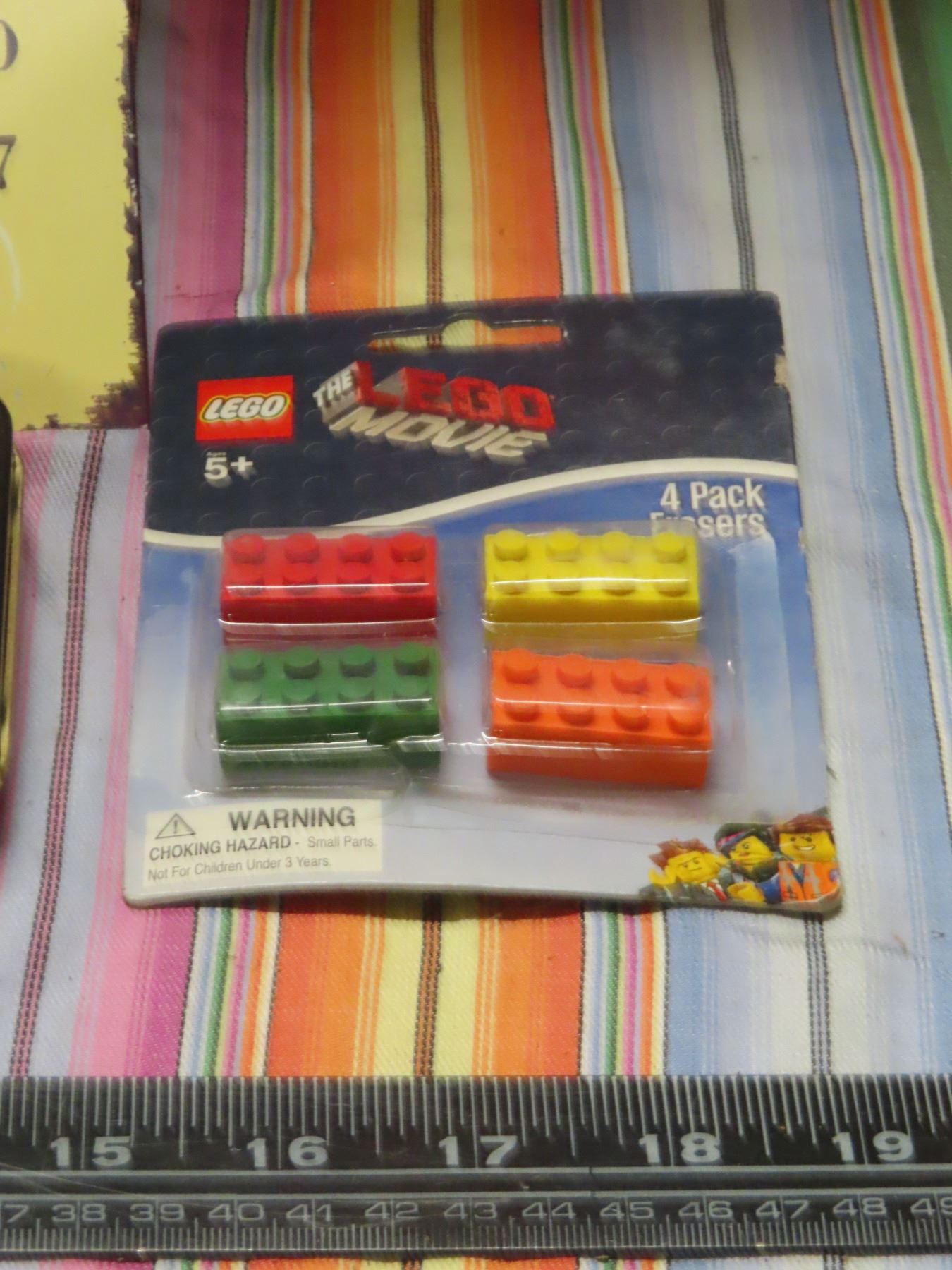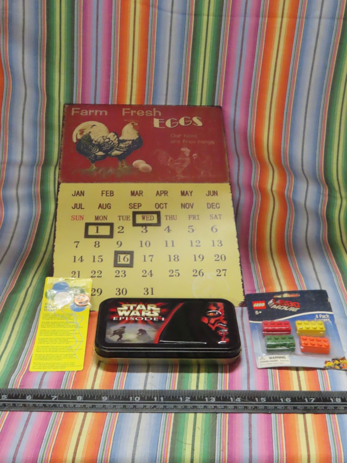 Lego movie erasers, star wars cards, happy cent, tin calendar