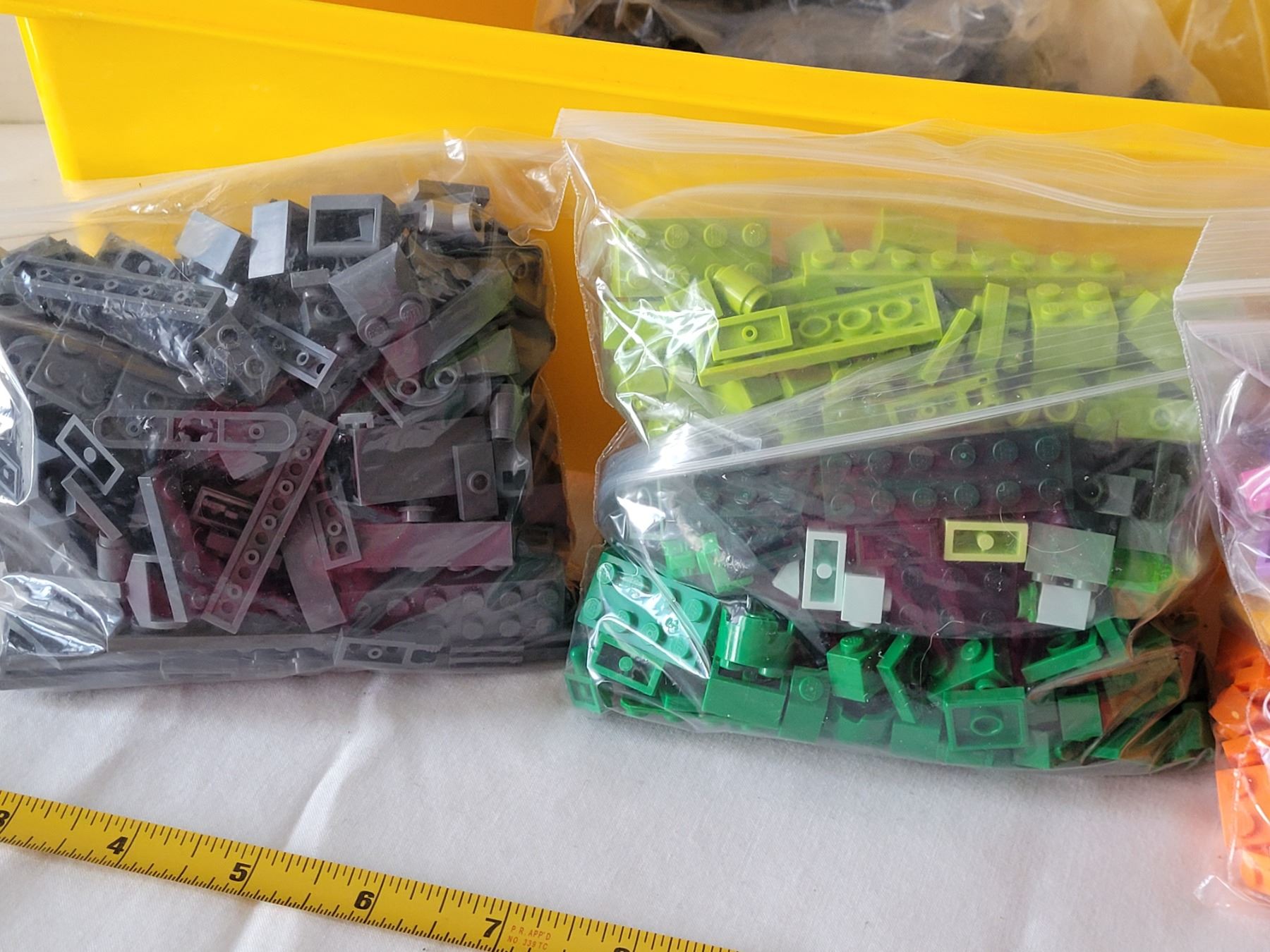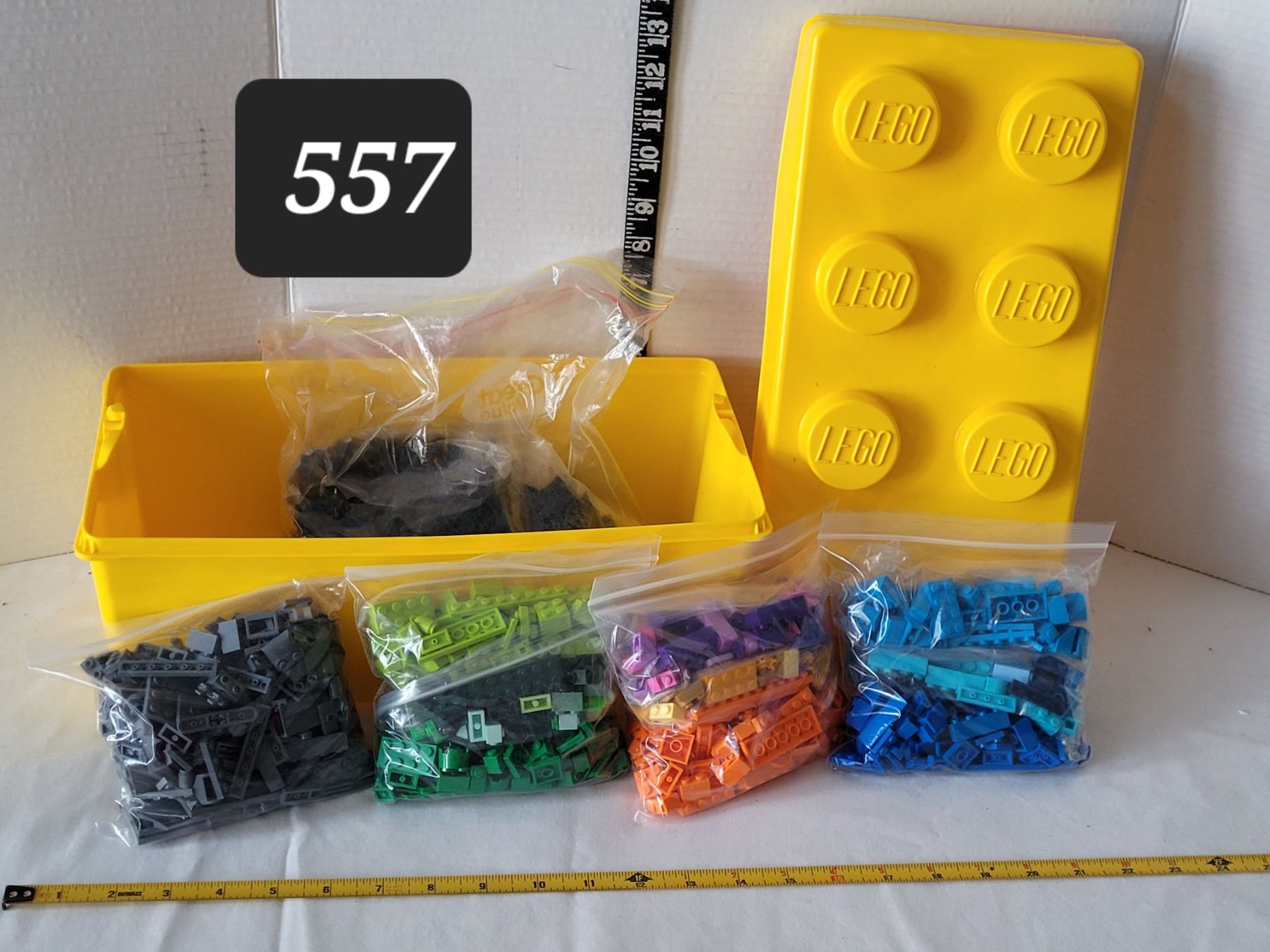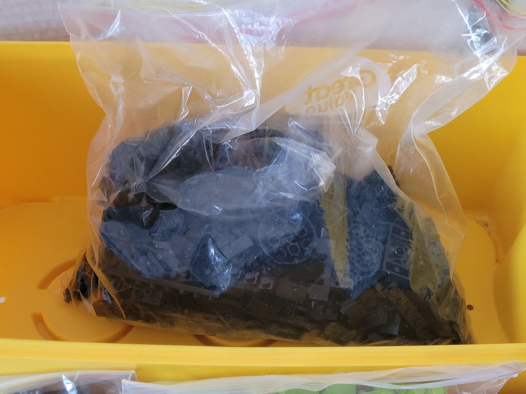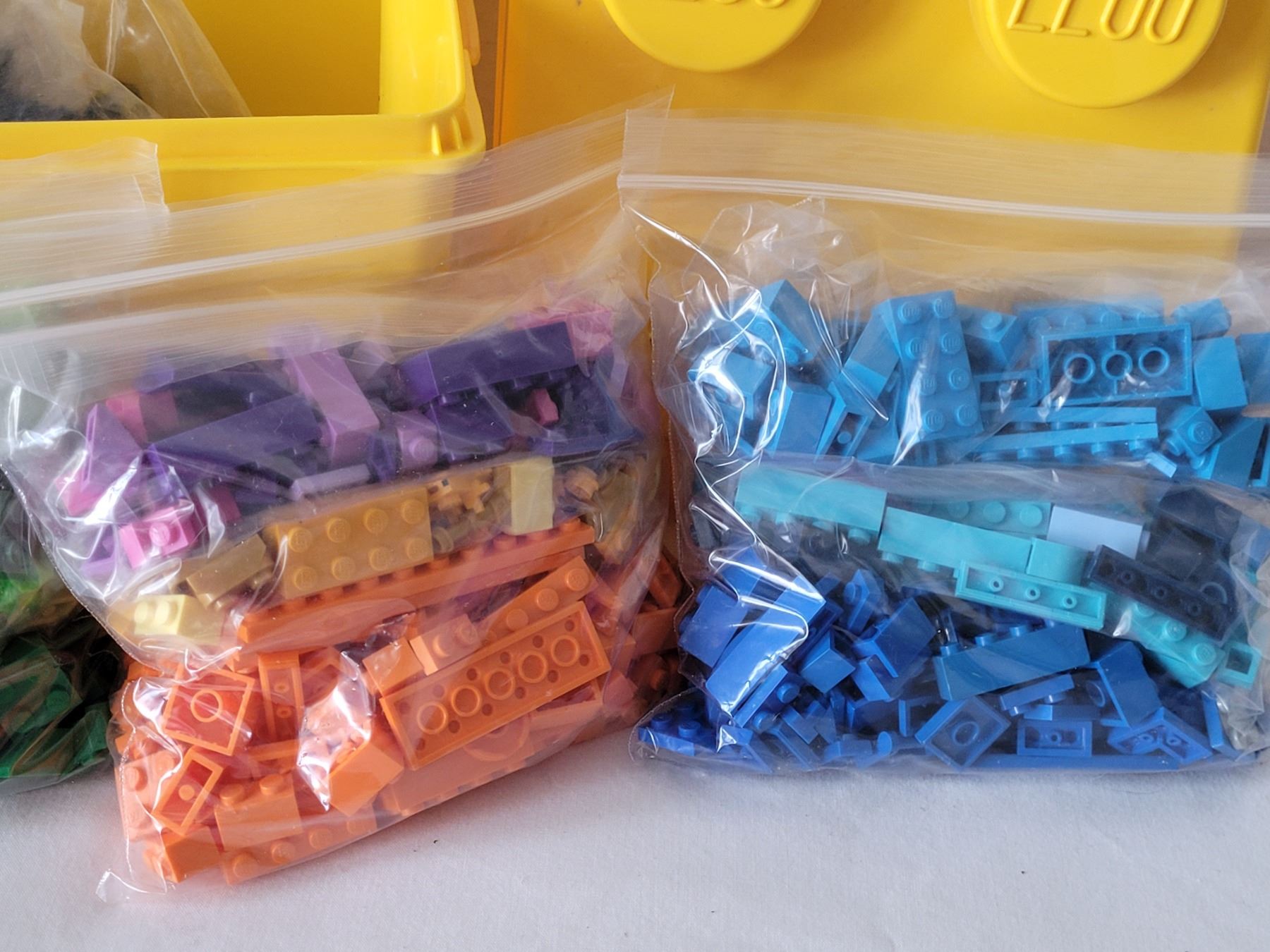 Lego storage brick containing bags of coloured lego bricks.