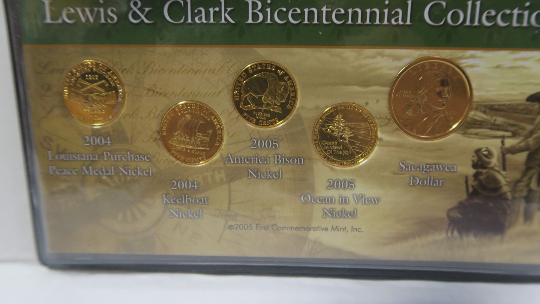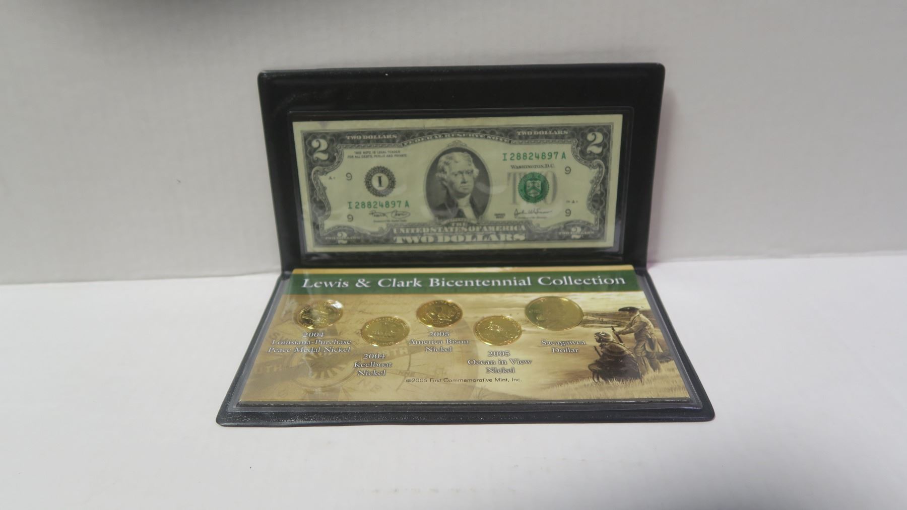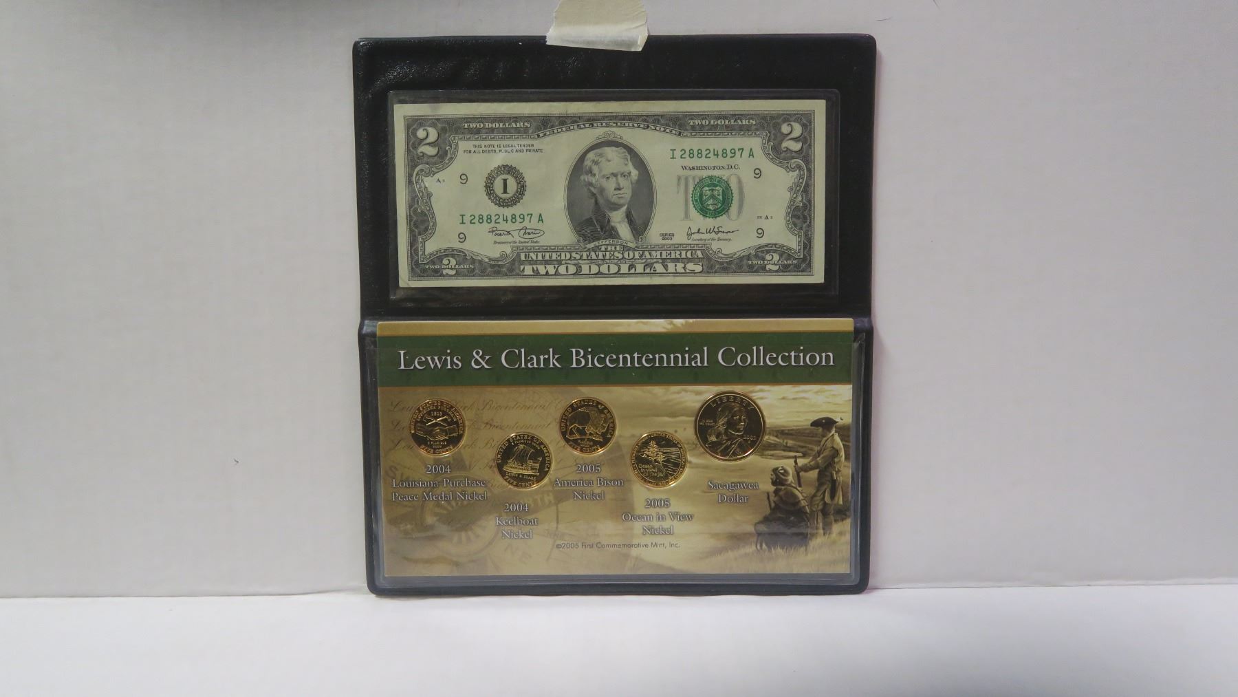 Lewis & Clark Bicentennial Collection includes 4 Nickels (Louisiana Purchase, Keelboat, Bison & Ocean View), plus Sacagawea Dollar and a 2003 U.S. Federal Reserve $2 note depicting Thomas Jefferson. Housed in a folder.