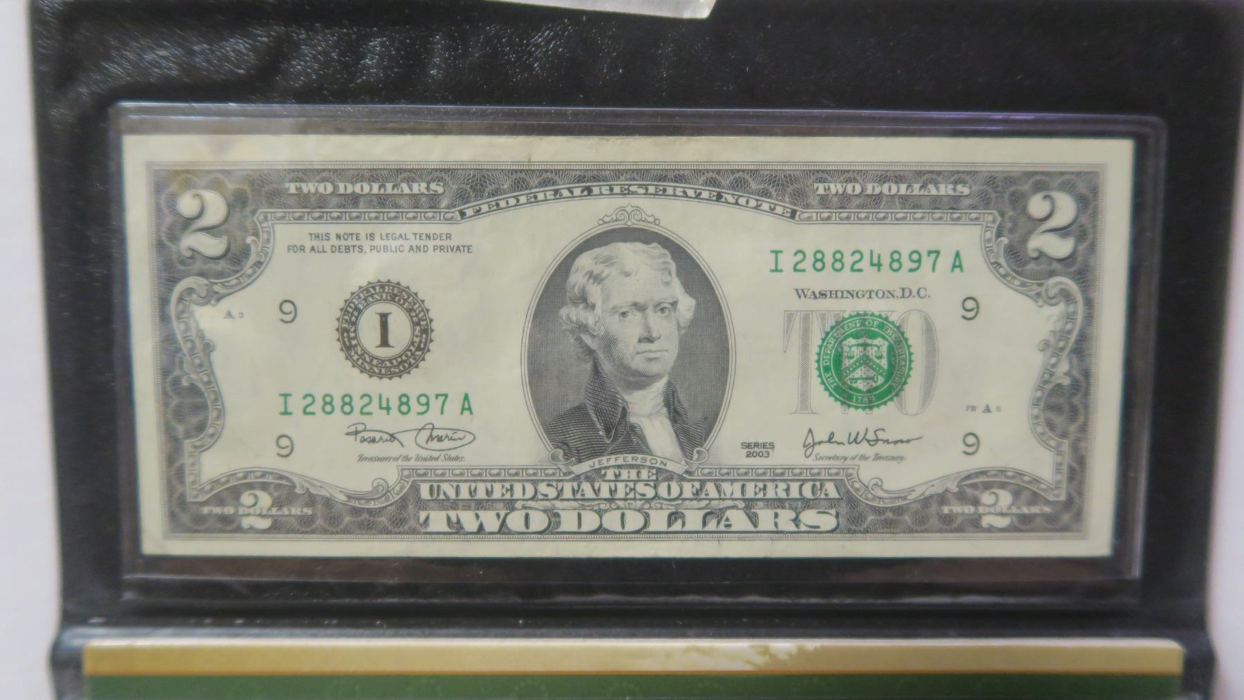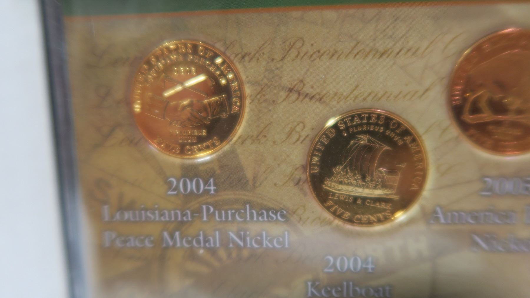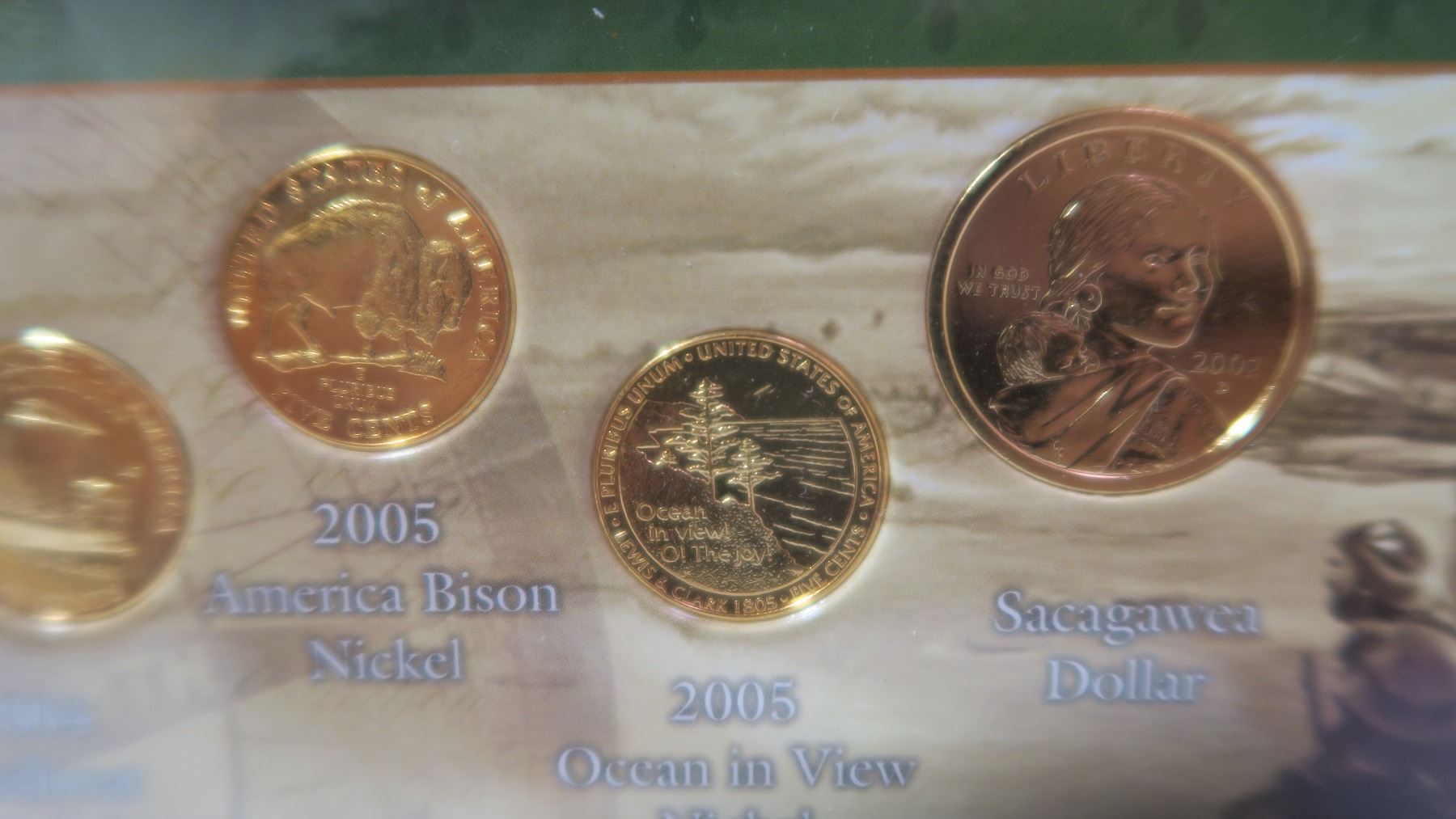 Lewis & Clark Bicentennial Collection includes 4 Nickels (Louisiana Purchase, Keelboat, Bison & Ocean View), plus Sacagawea Dollar and a 2003 U.S. Federal Reserve $2 note depicting Thomas Jefferson. Housed in a folder.