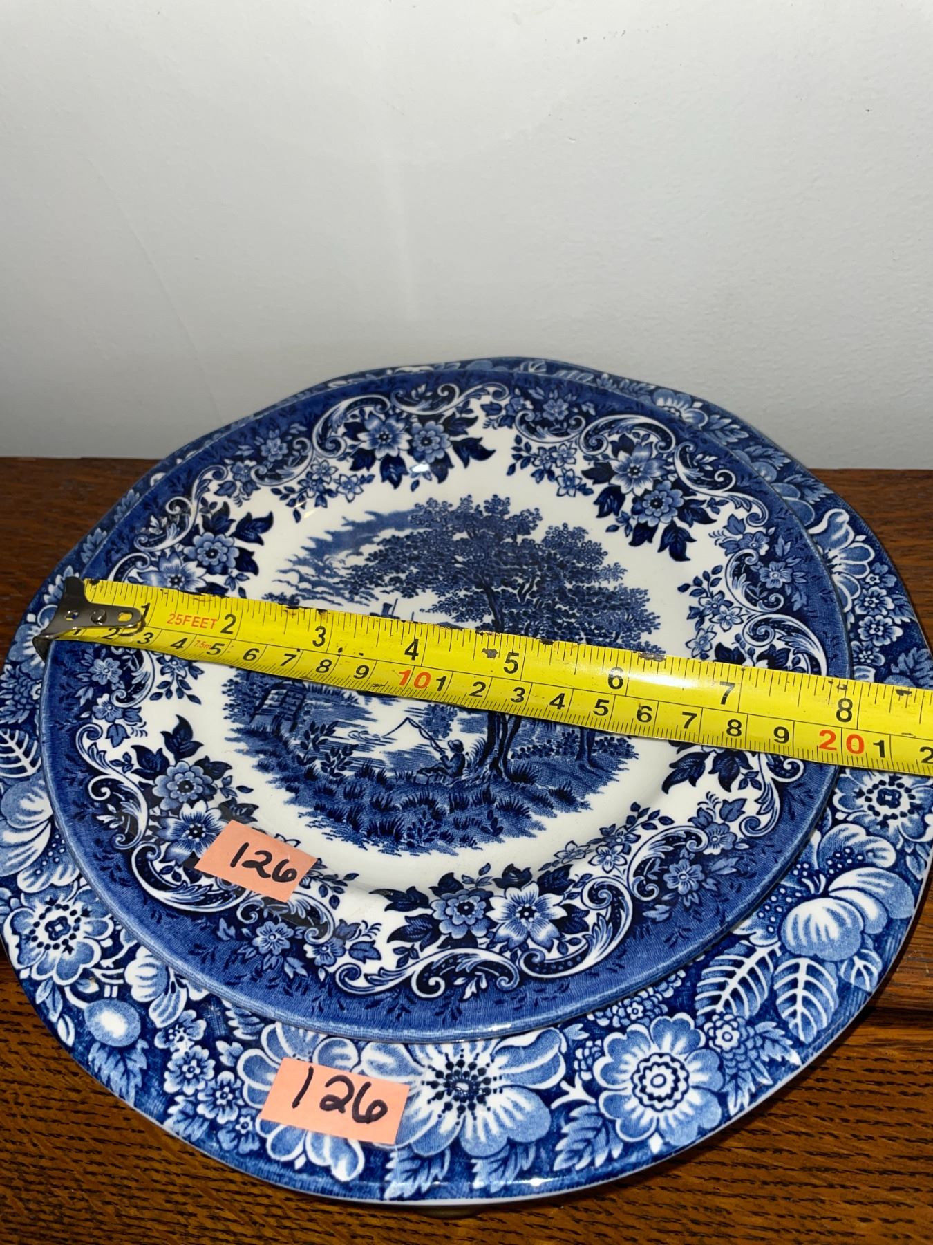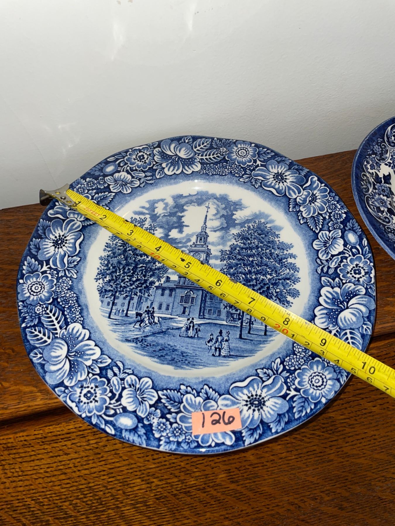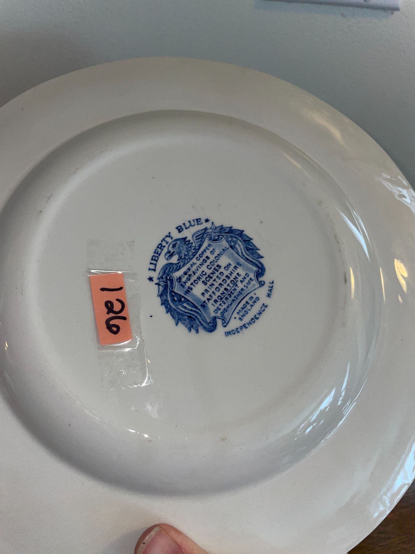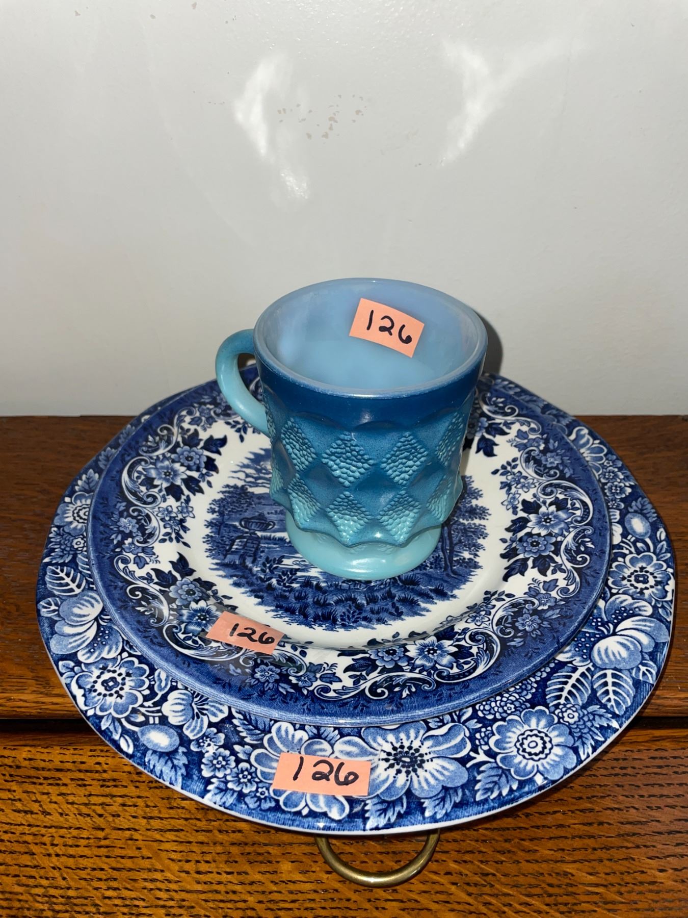 Liberty blue plate, and another English made plate and blue ombré, Kimberly patterned mug, by fire king. No chips or cracks