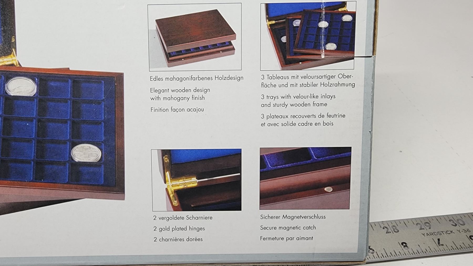 Lighthouse wooden, 90 coin (39x39mm) presentation case, w/ 3 trays, magnetic catch and mahogany finish - like new, in box