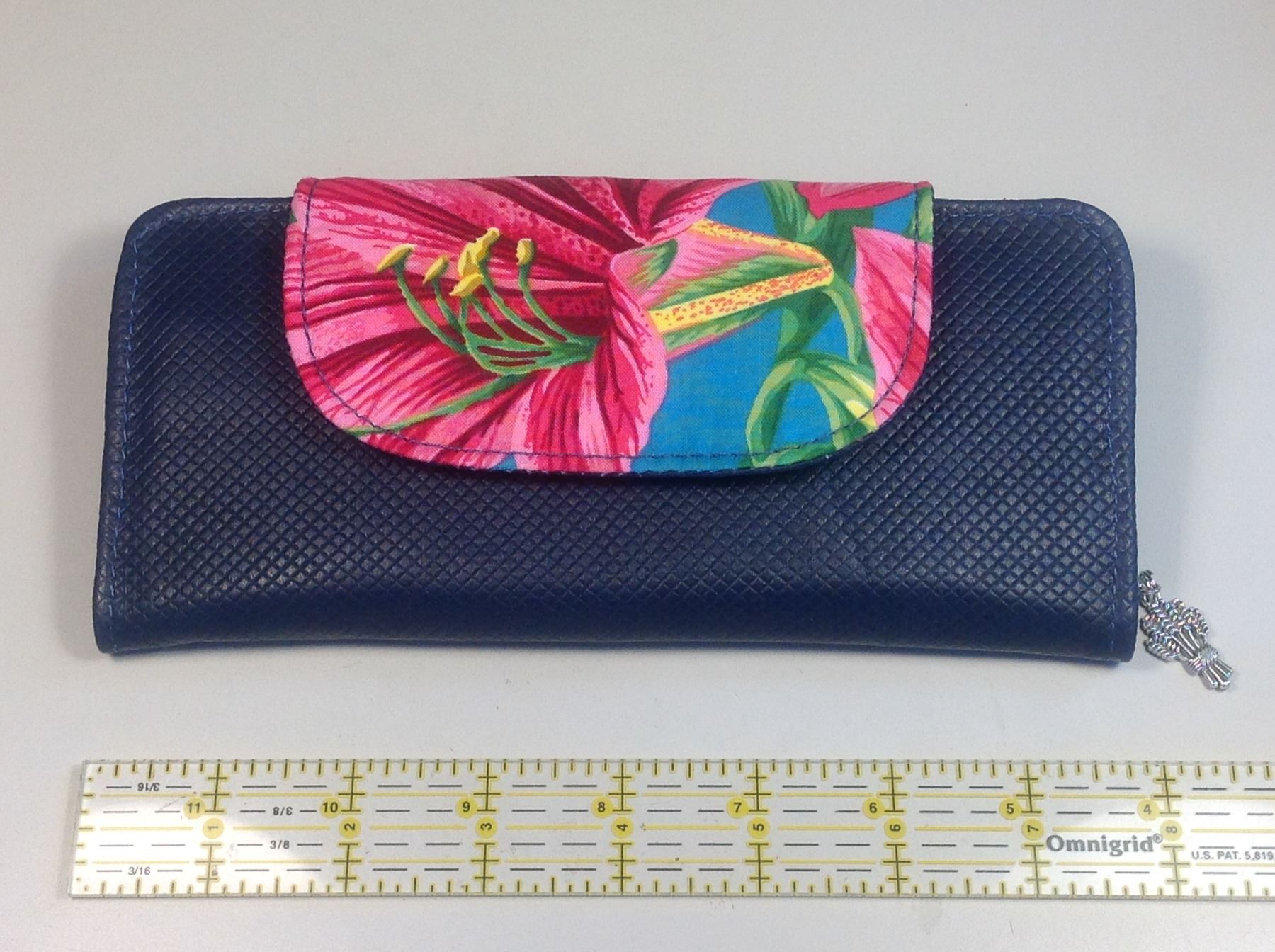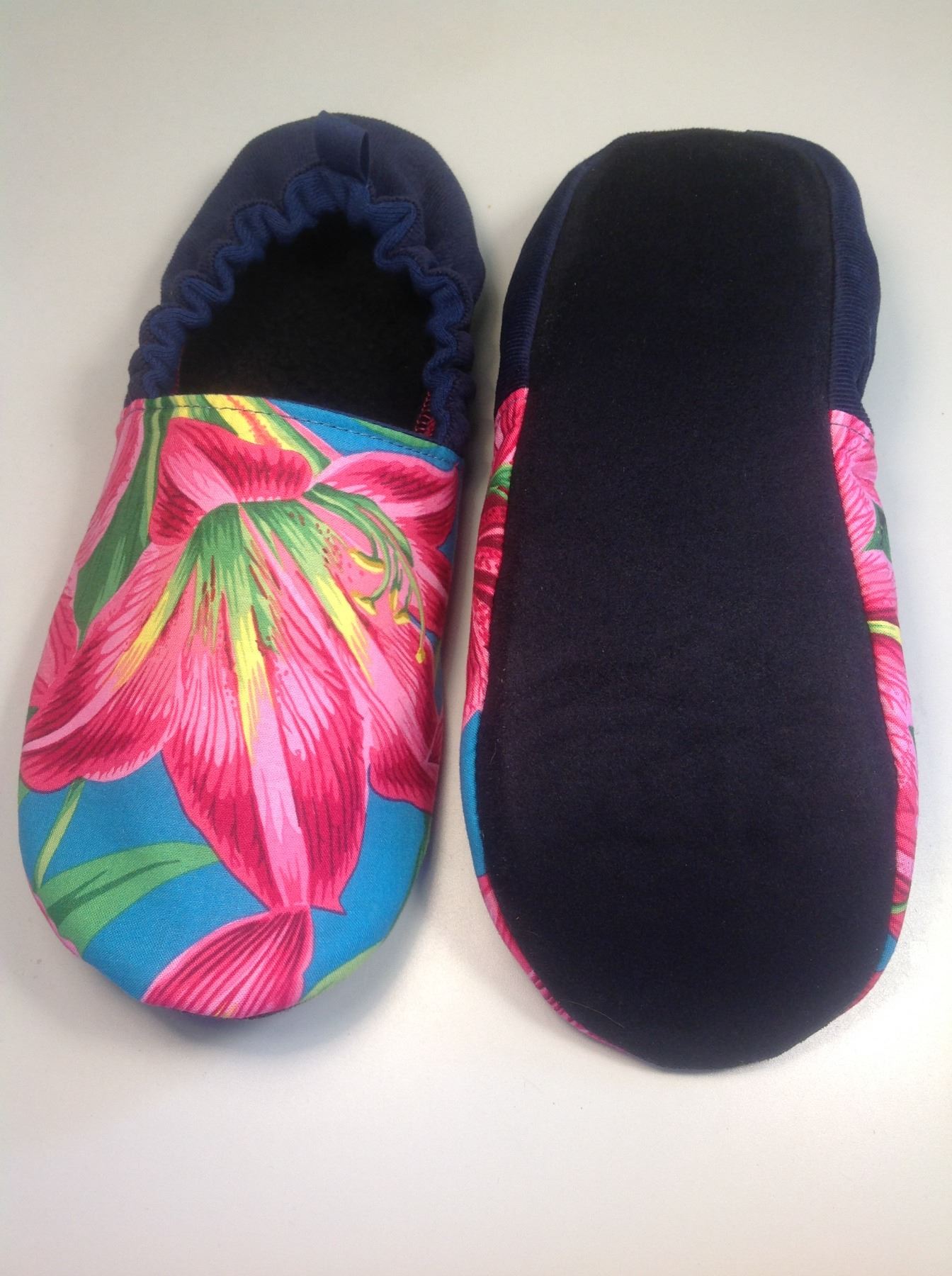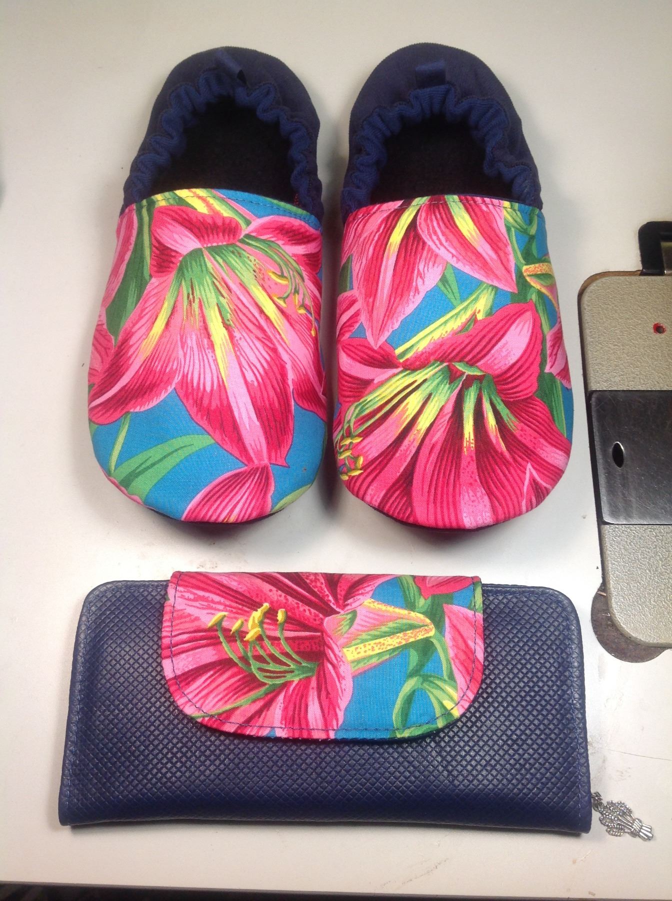Slipper -size 8/9 will fit up to 10" foot -regular width.Lily fabric/navy corduory(outer), cotton lined, 3 ply sole outer sole is vegan suede HP . Wallet is Blue Leather and Fabric. Approx 7 3/4"x3 1/2 " (closed) Has 6 card slots, zipper pocket /w wheat charm, two slip pockets and closes with two magnetic snaps