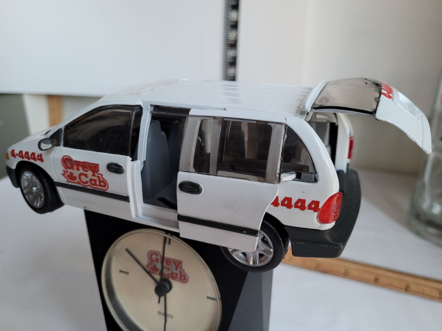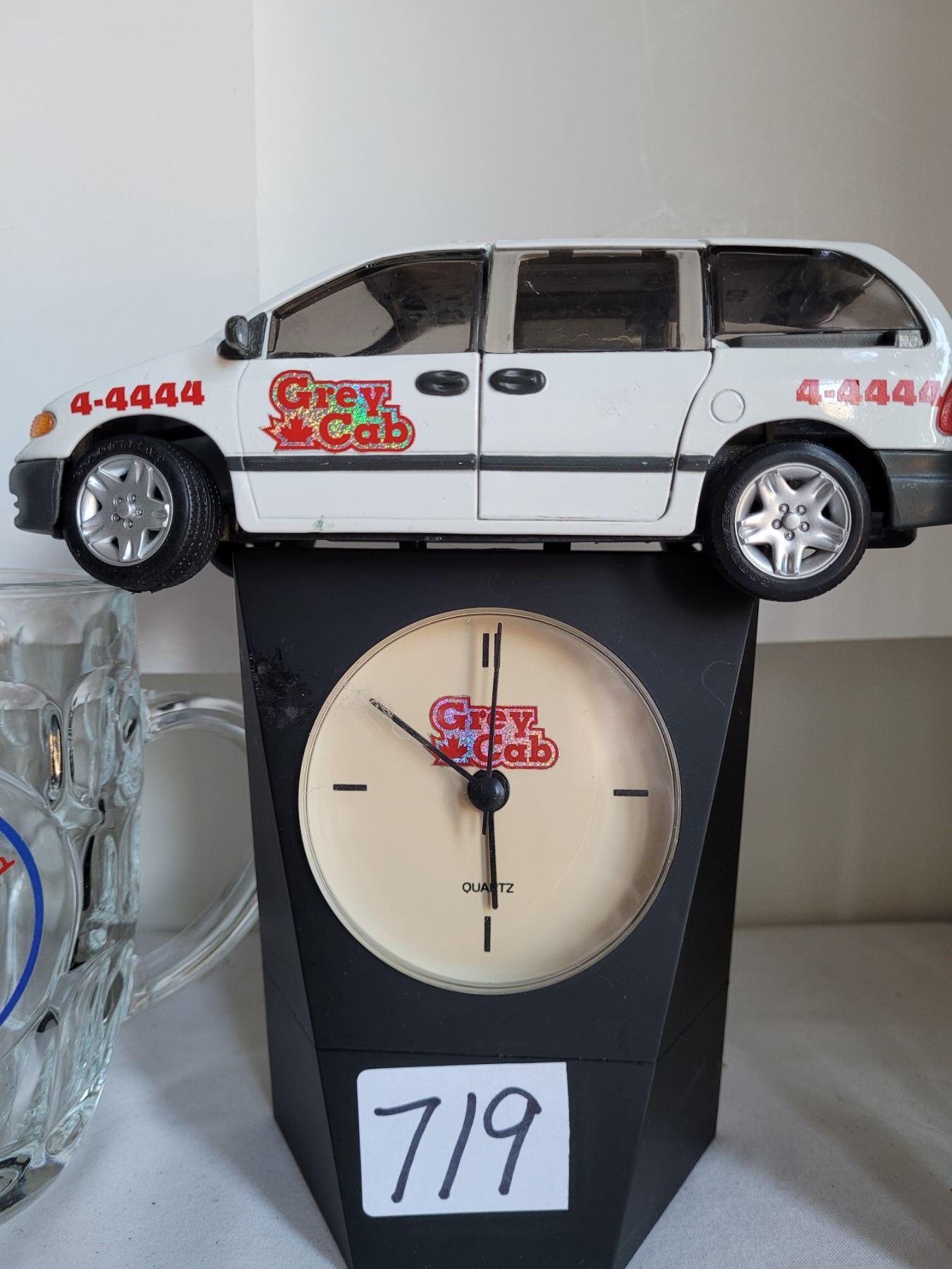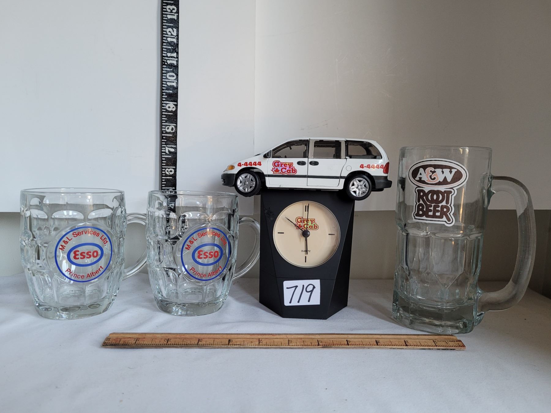Local advertising. Grey cab van clock(moving parts) Esso, A&W mugs