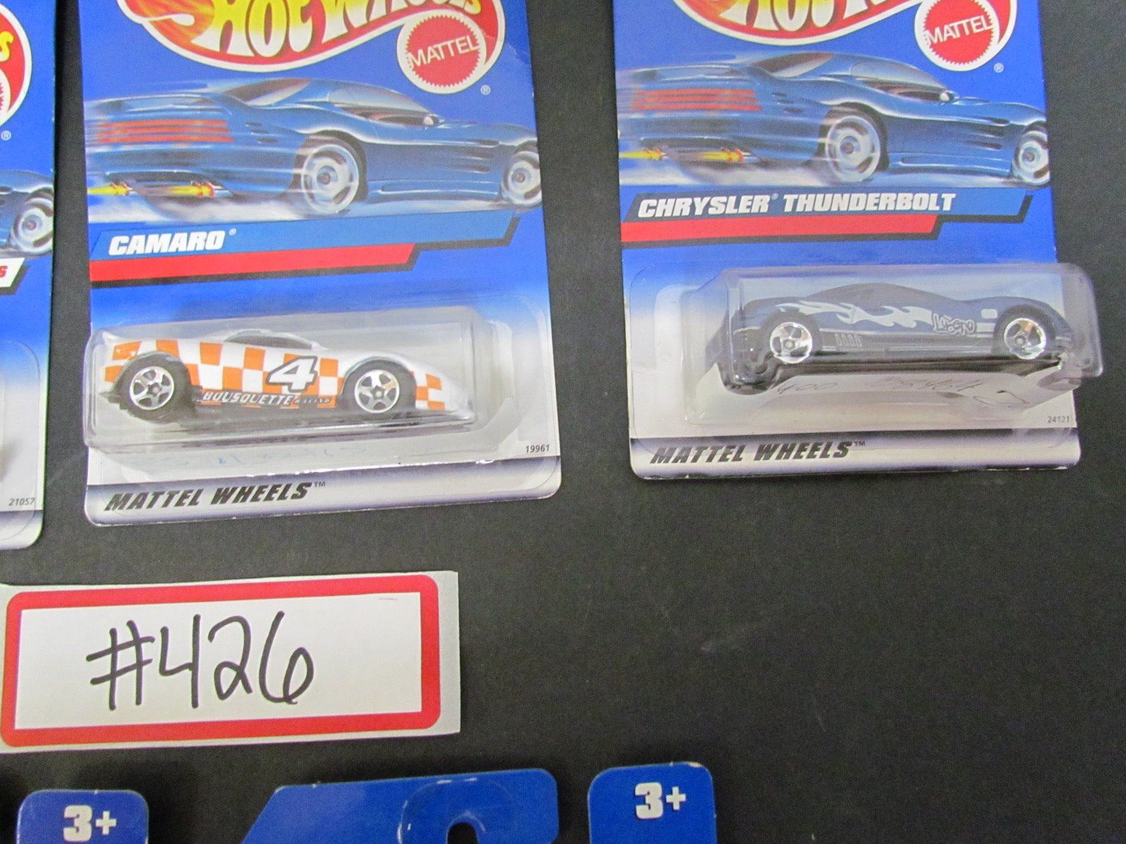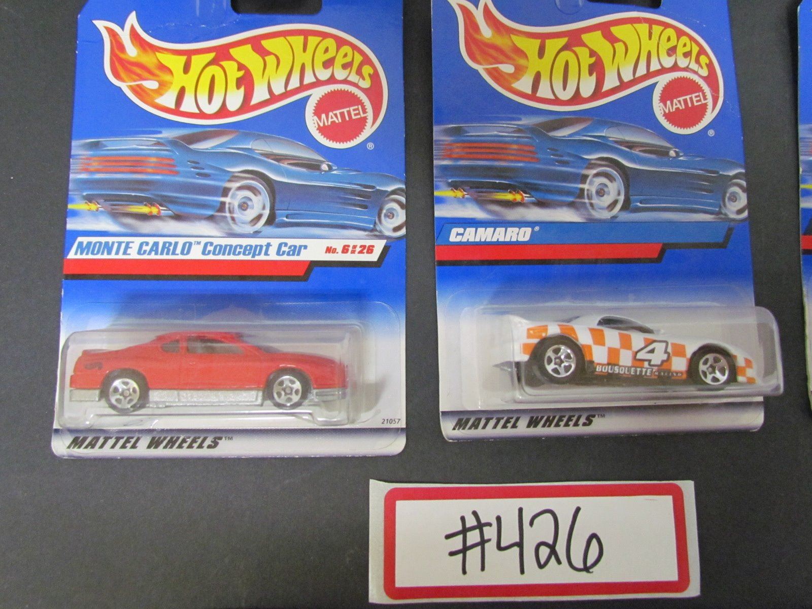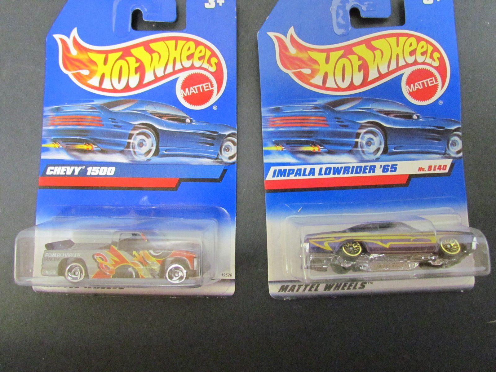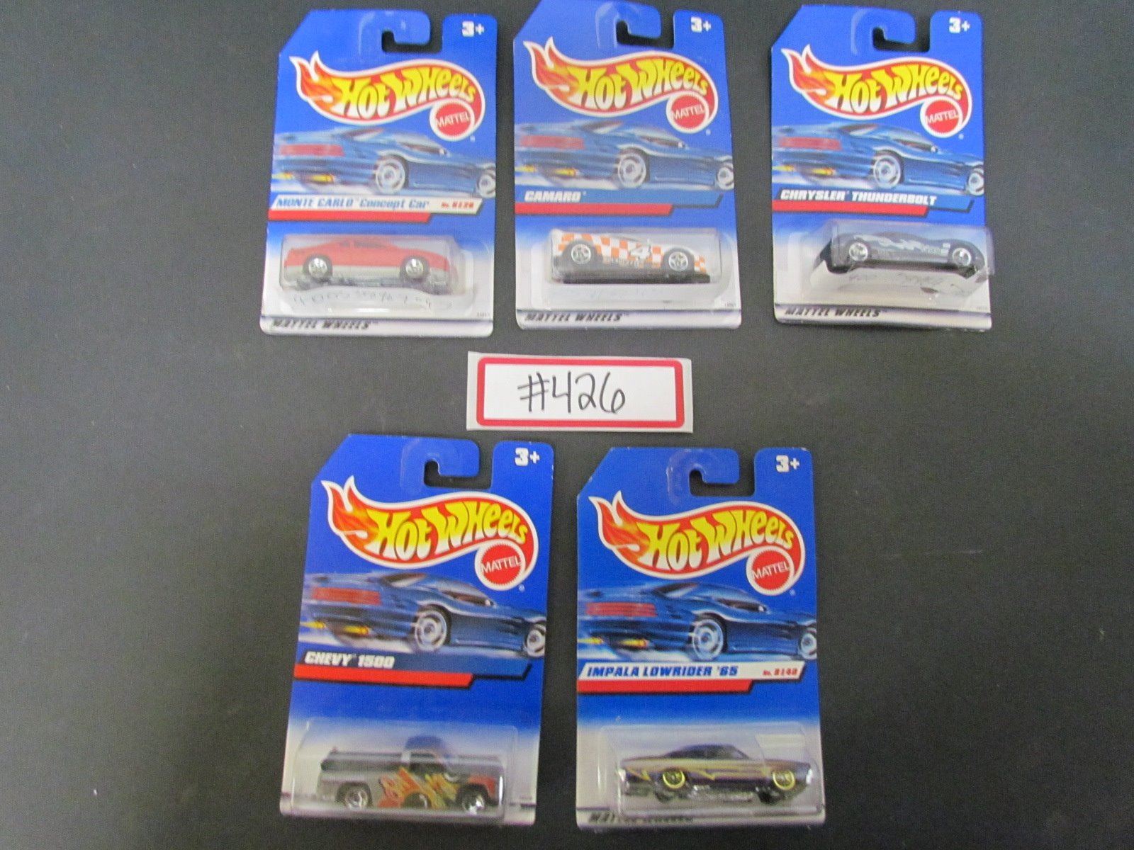 Lot#16- 5 Hotwheels-Impala LowRider 65,Chevy 1500,Chrysler Thunderbolt,Camaro,Monte Carlo Concept Ca