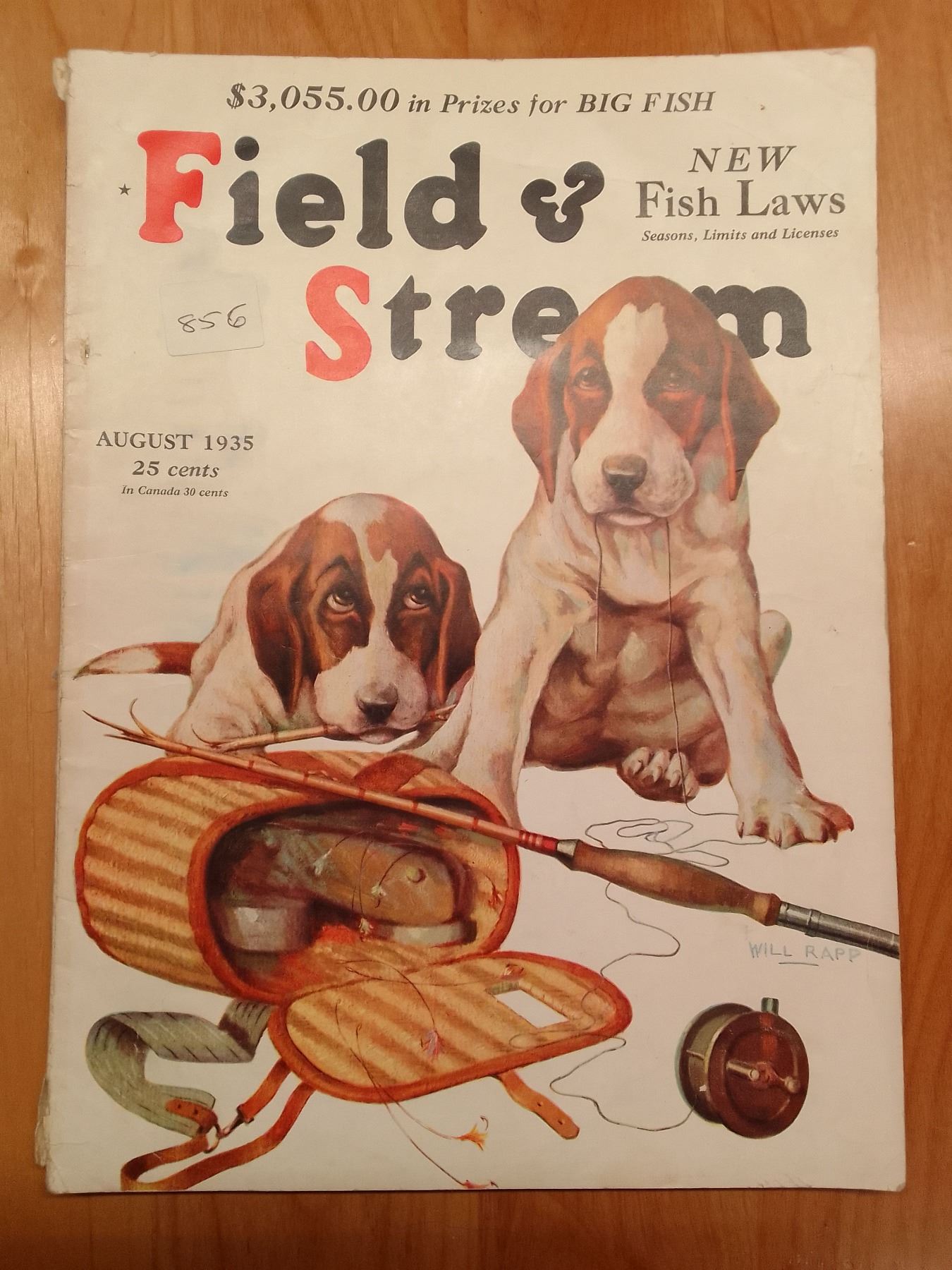 Lot # 856 - Field & Stream Aug 1935: Adorable Beagle Puppies & Fishing Gear Cover by Will Rapp- This August 1935 issue of Field & Stream features a charming cover painting by Will Rapp of two sad-eyed beagle puppies beside an open creel, rod, and reel. Priced at 25 cents, it offers $3,055 in prizes for big fish, new fishing laws, seasons, limits, and licenses—capturing the golden age of American outdoor sportsmanship.