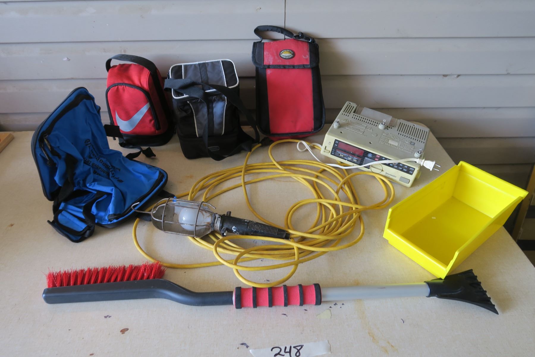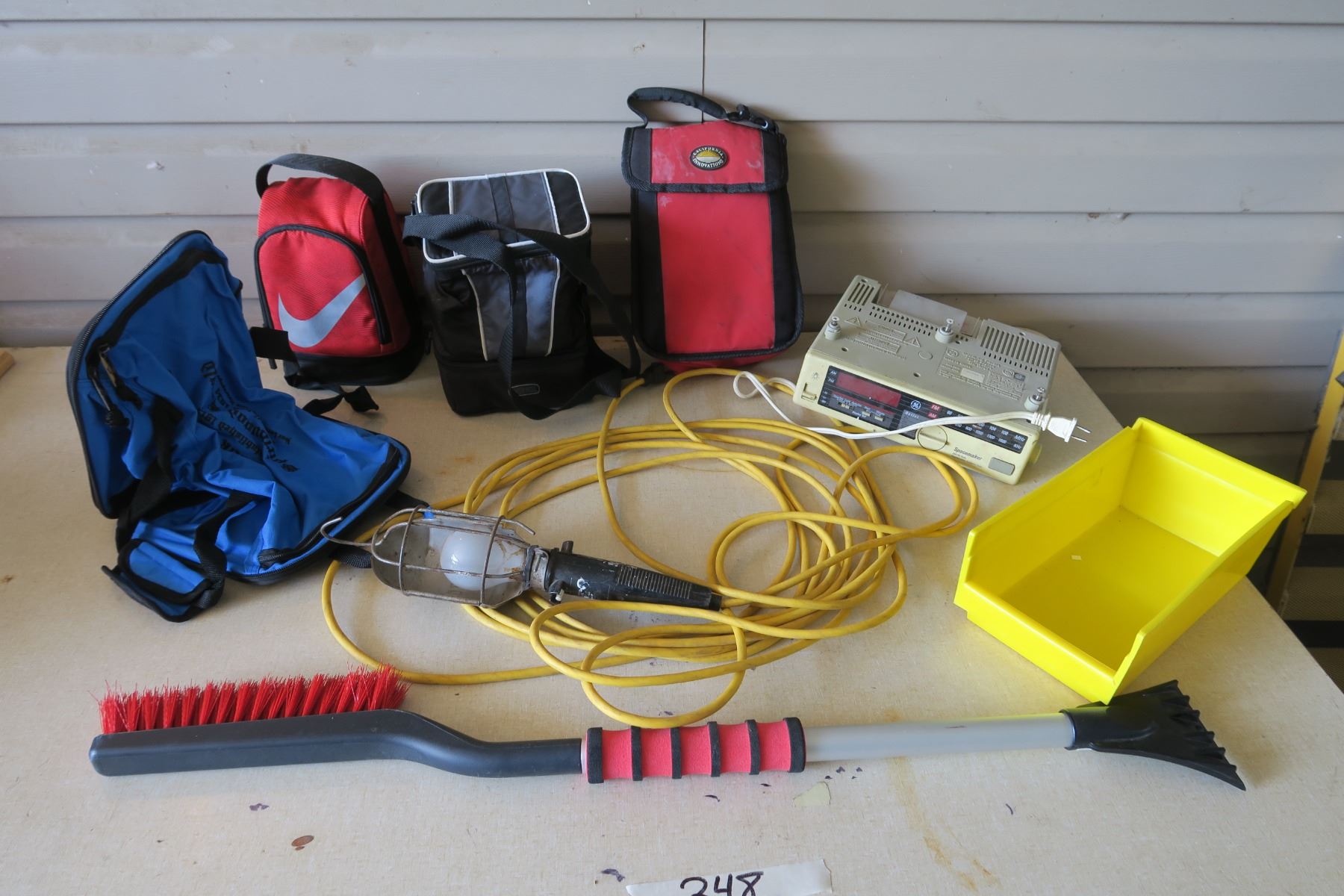 Lot AM/FM Radio, 3 Lunch bags, Foldable Pouch, Shop Lamp, Tray and Snow Brush