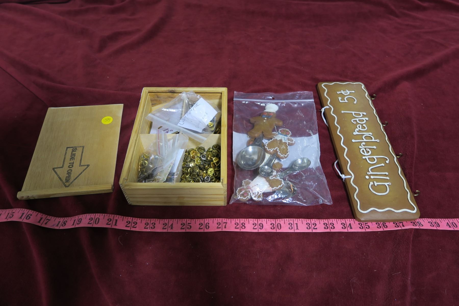 Lot Box of pins/pin backs + Gingerbread wallhanging & measuring spoon set