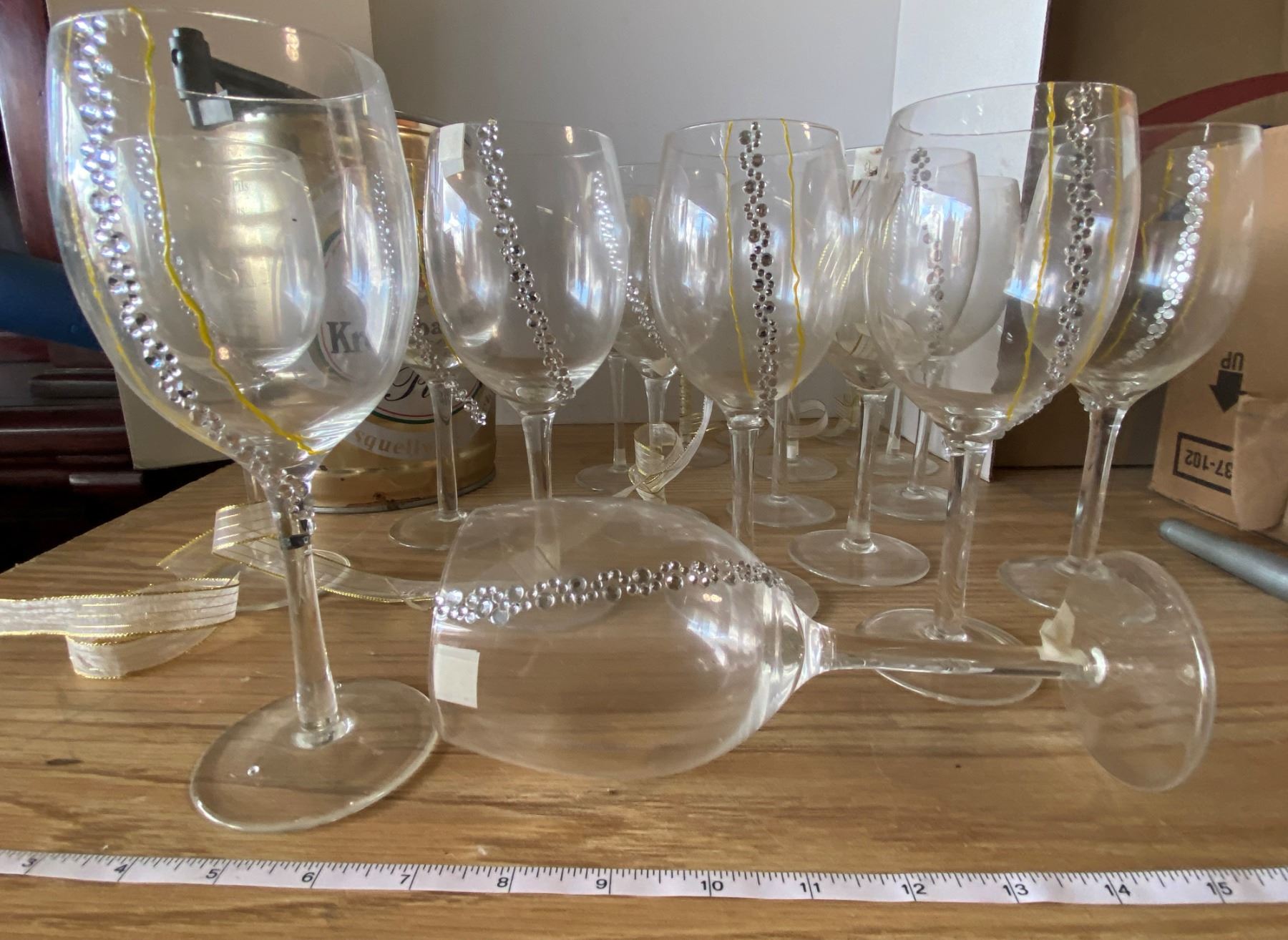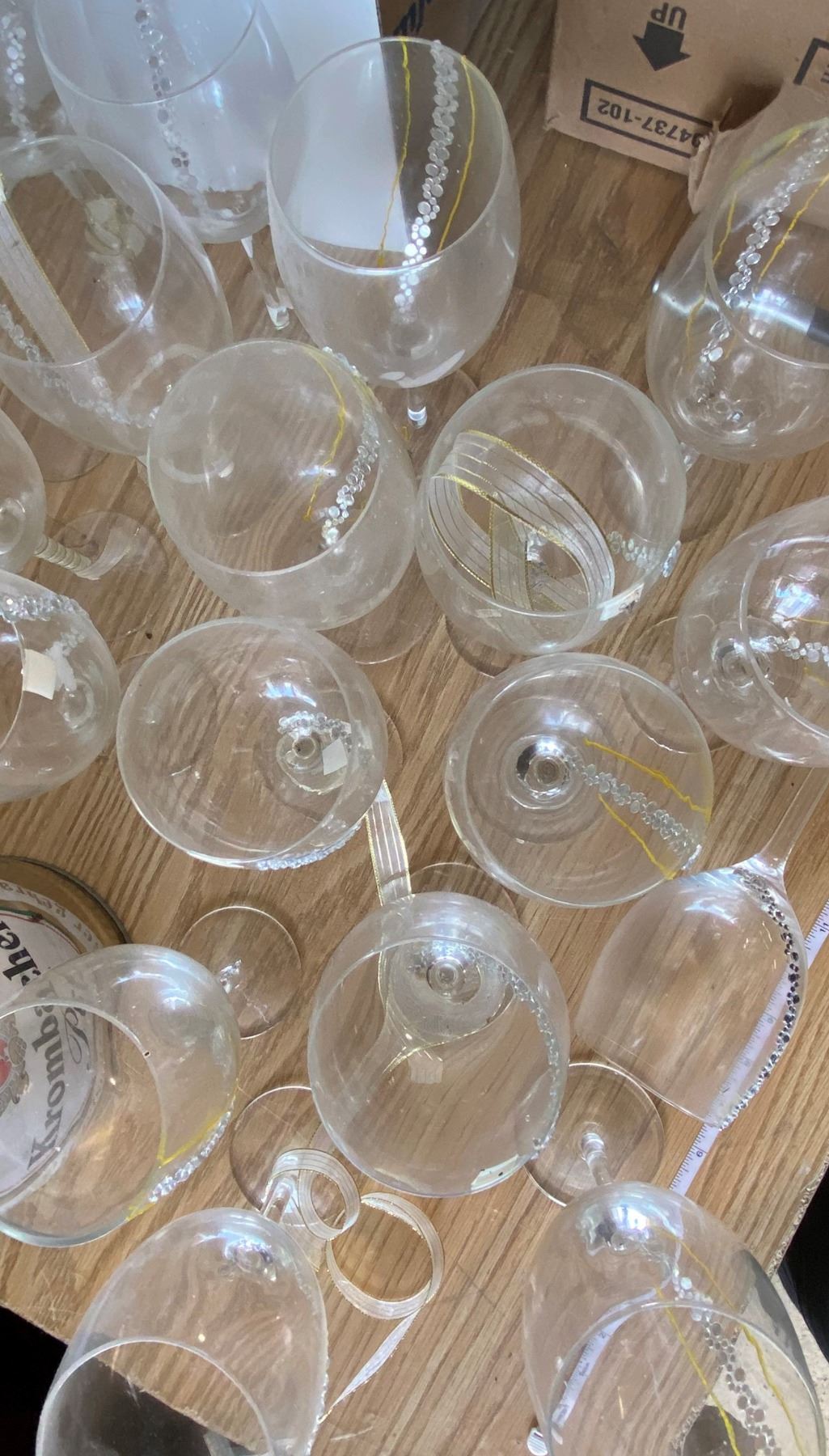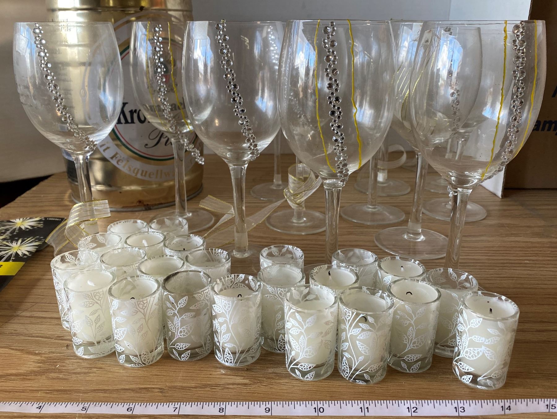 Lot Celebration Decorations, Wine Glasses, Glass Votive Candles, & Sparklers