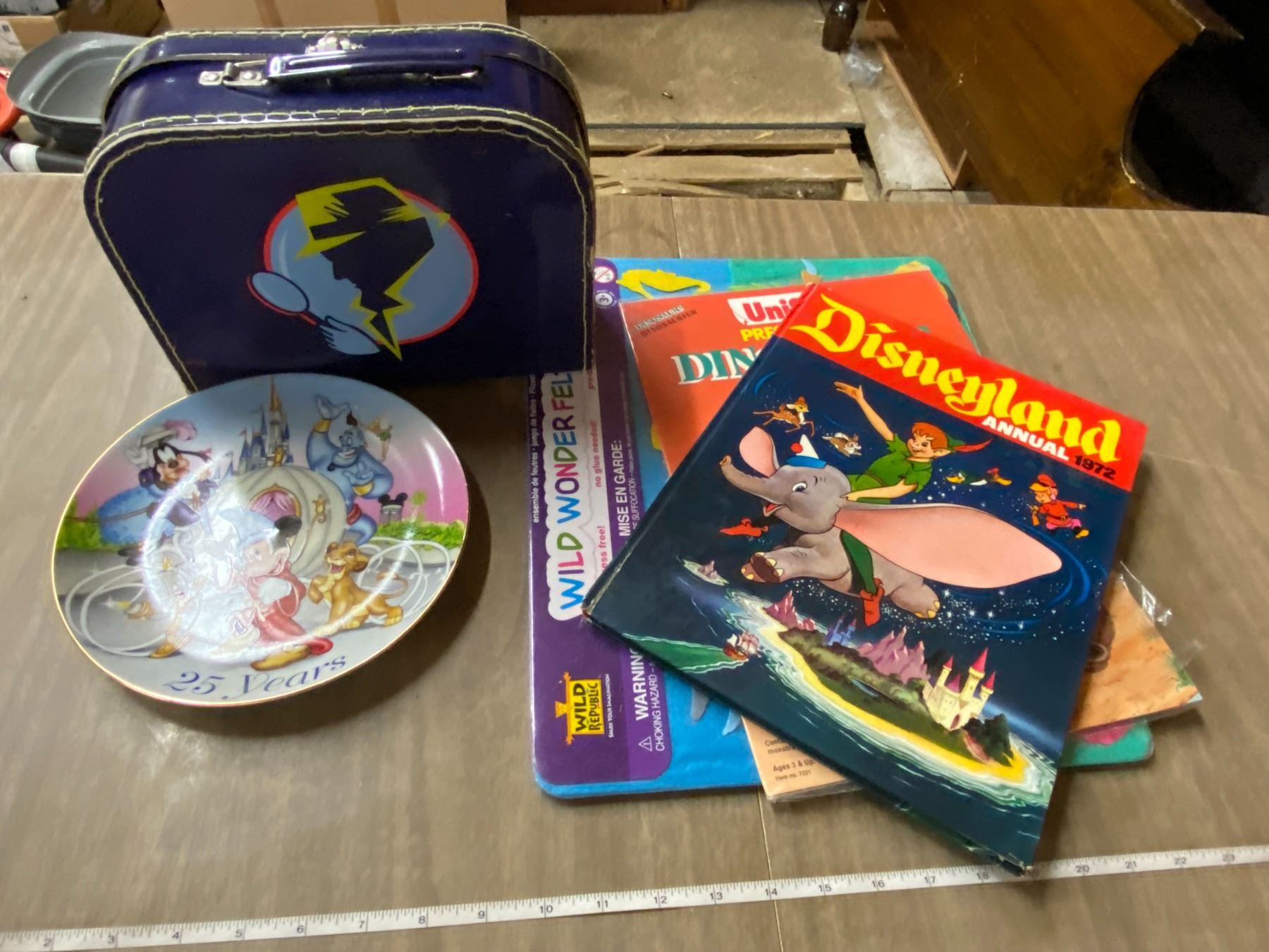Lot Disney Collector Plate, Spy Case, Disney Book, Dinosaurs sticker book, and felt sticker mat