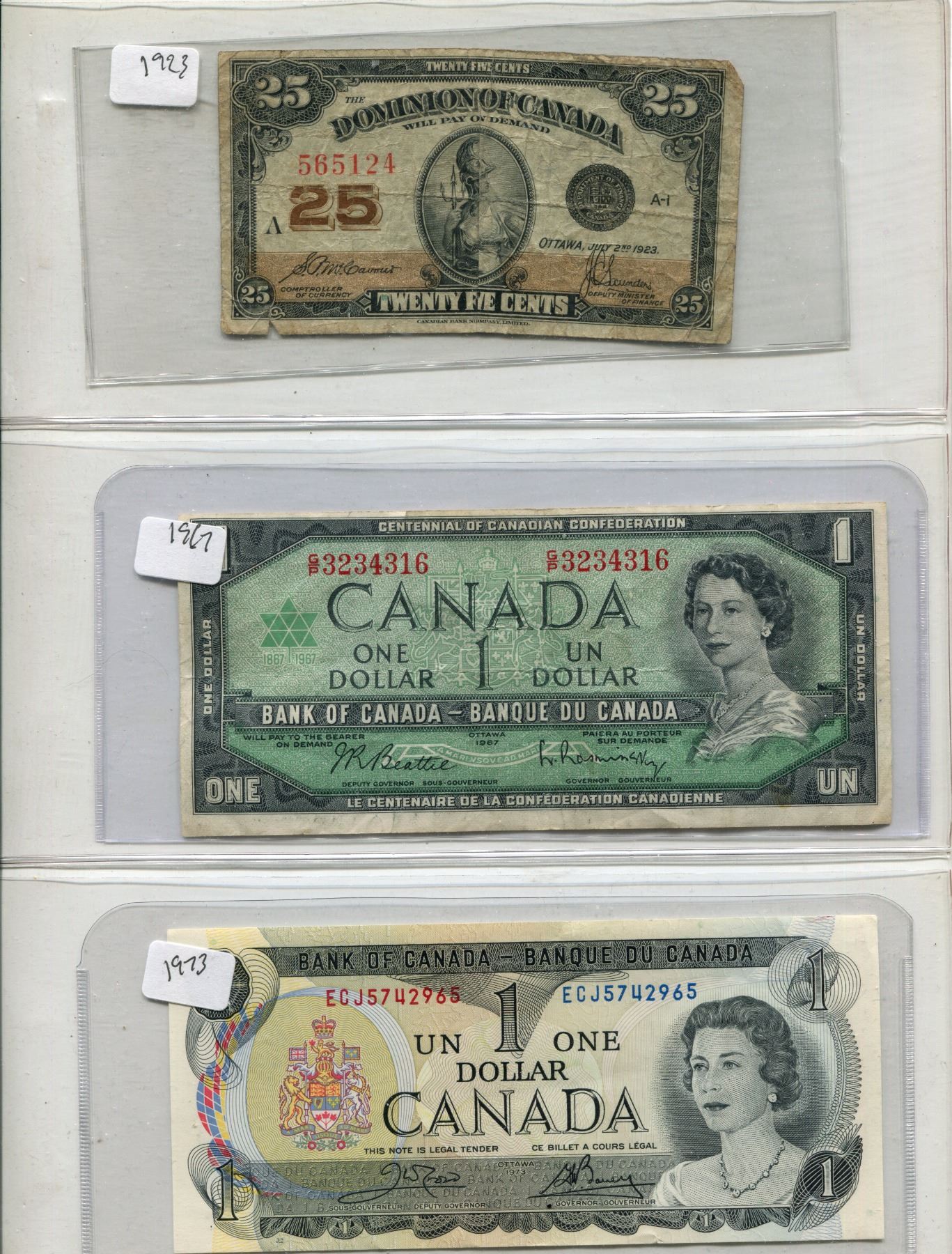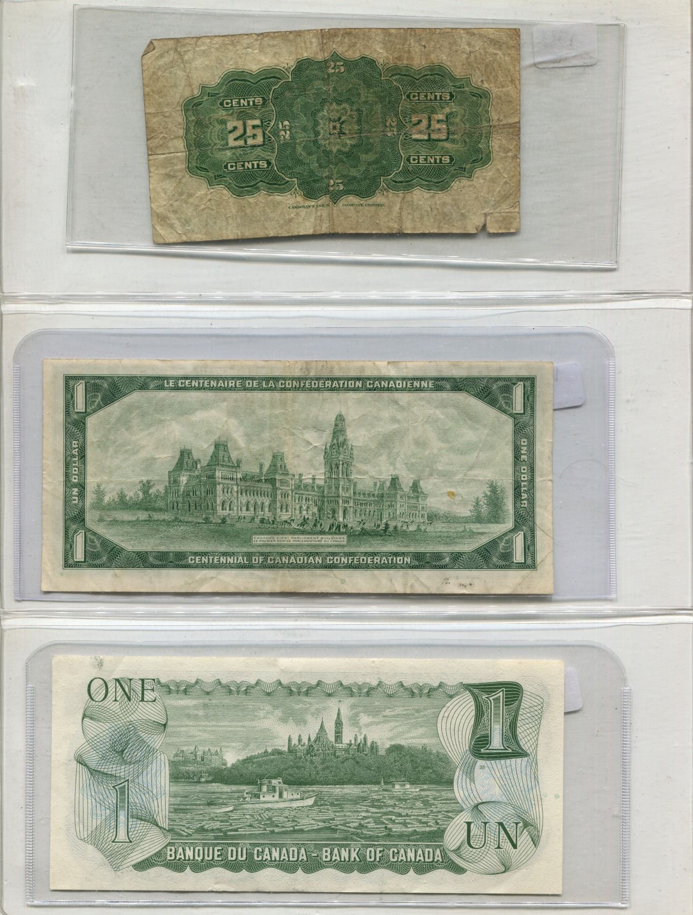Lot Of (3) Canadian Bills (2) One Dollar + (1) 25 Cents