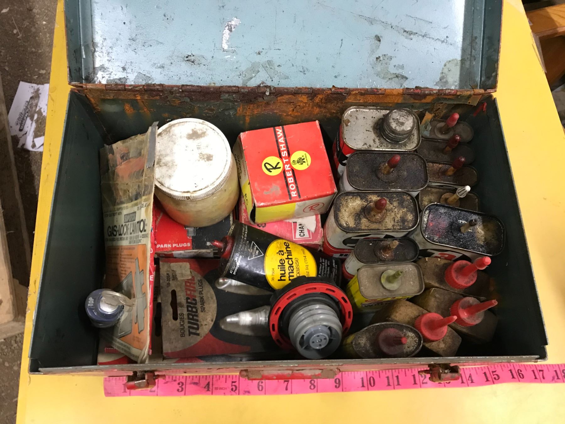 Lot Vintage Oil Cans & Misc. & Vintage Shop Box
