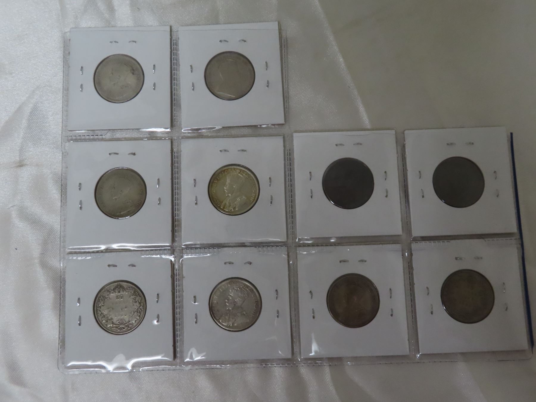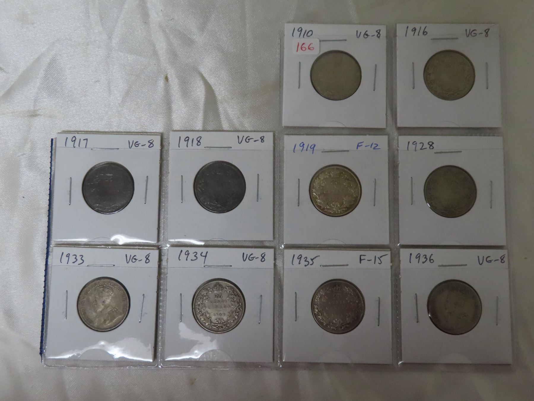 Lot of 10 Canadian Edward VII & George V Silver 25 Cents. Dates include 1910, 1916, 1917, 1918, 1919, 1928, 1933, 1934, 1935 & 1936. Coins grade up to F-15.