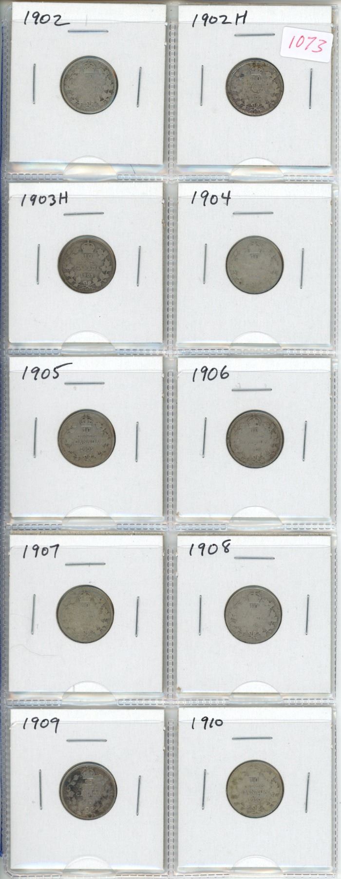 Lot of 10 Canadian Edward VII Silver 10 Cents. Includes 1902, 1902H, 1903H, 1904, 1905, 1906, 1907,