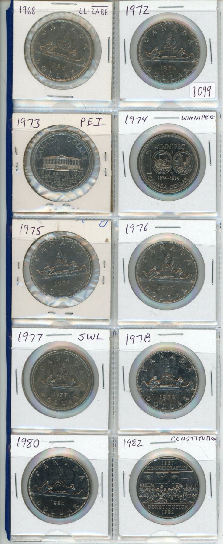 Lot of 10 Canadian Nickle Dollars. Includes 1968, 1972, 1973 PEI, 1974 Winnipeg, 1975, 1976, 1977 Short Water Lines, 1978, 1980 & 1982 Constitution. Coins grade AU to BU.