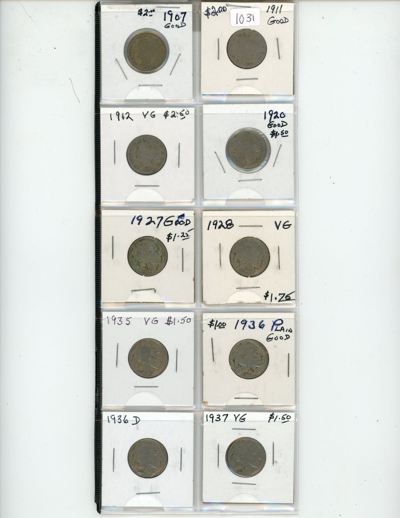 Lot of 10 U.S. Liberty Head & Buffalo Nickels. Includes 1907, 1911, 1912, 1920, 1927, 1928, 1935, 1936, 1936D & 1937. Coins grade Good to Very Good.