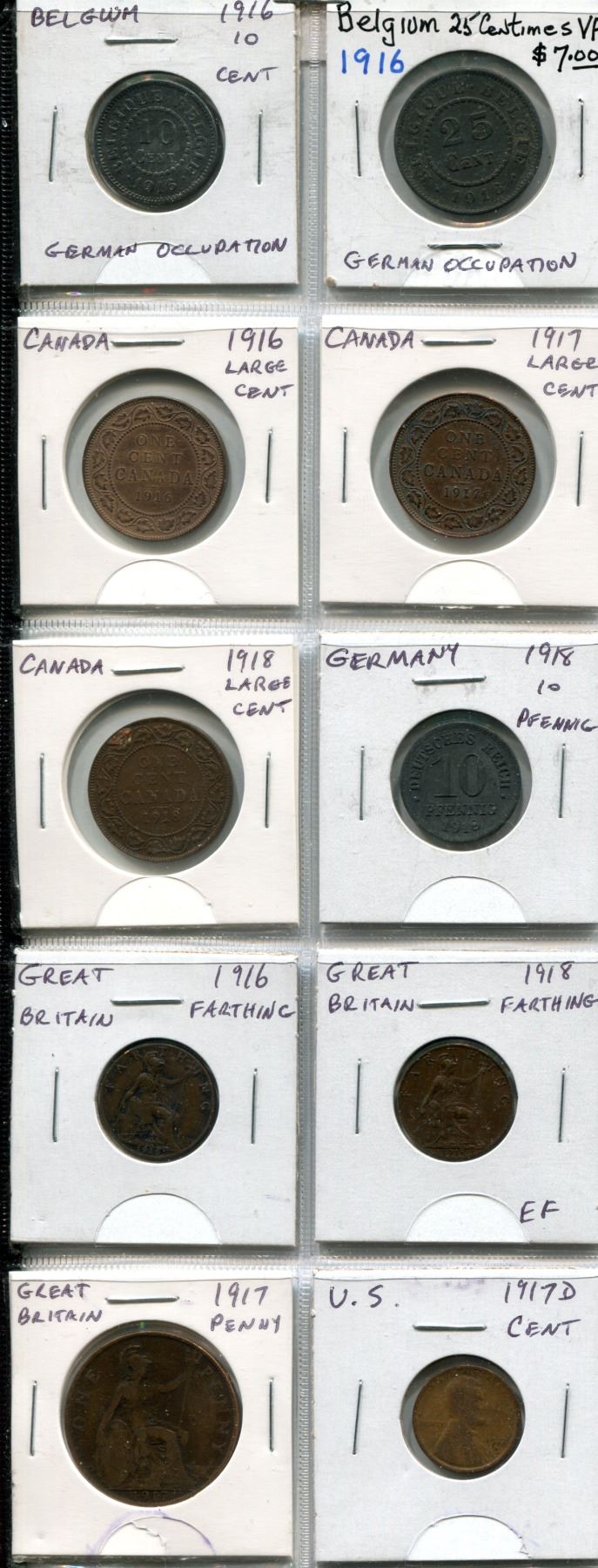 Lot of 10 World Coins issued during World War I. Includes Belgium under German occupation, Canada, G