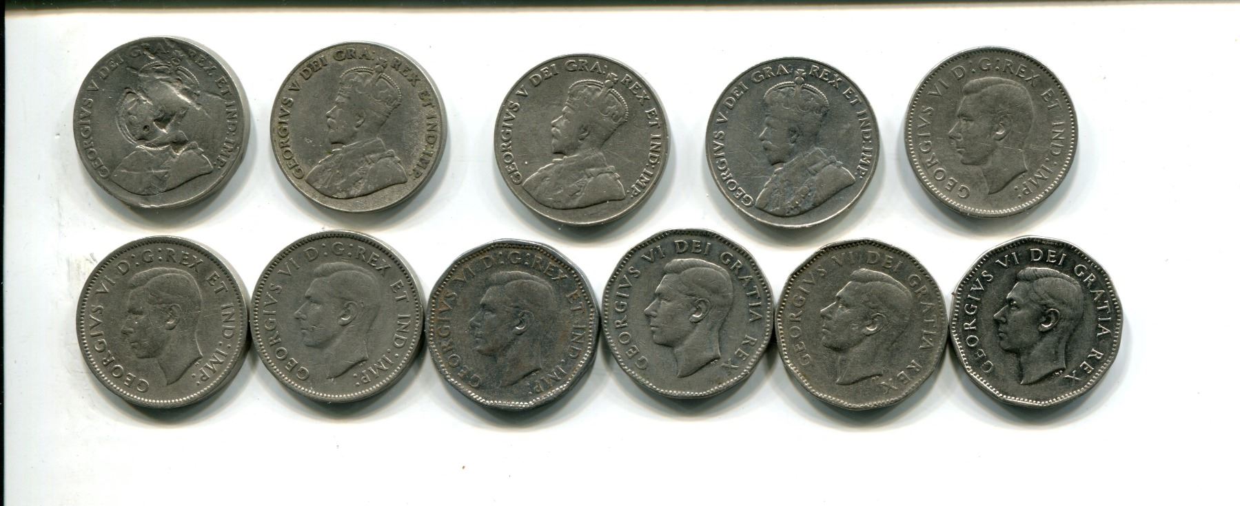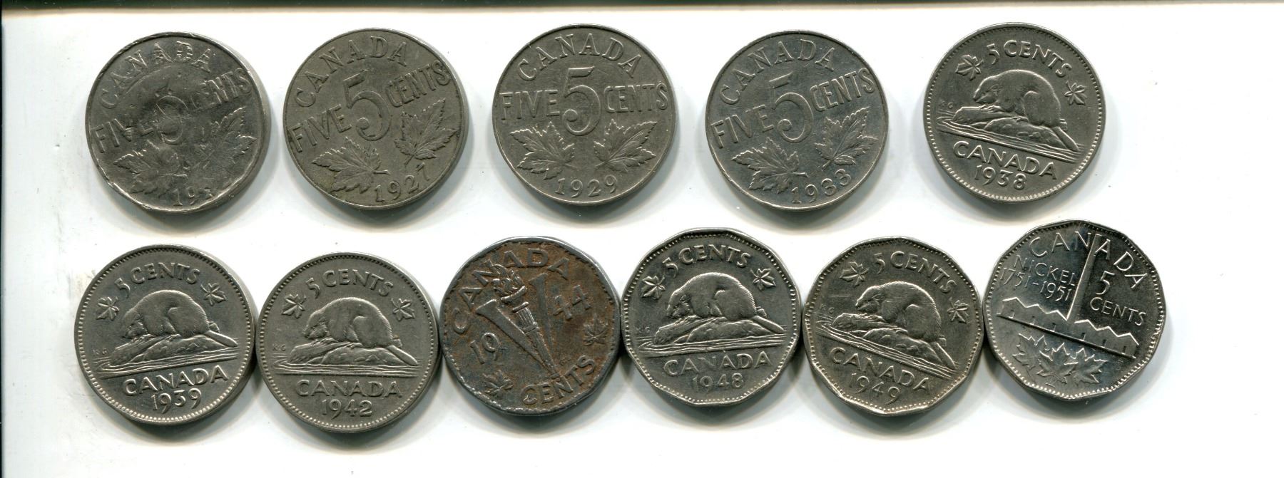 Lot of 11 Canadian nickels 1922, 1927, 29, 33, 38, 39, 42, 44, 48, 49, 51
