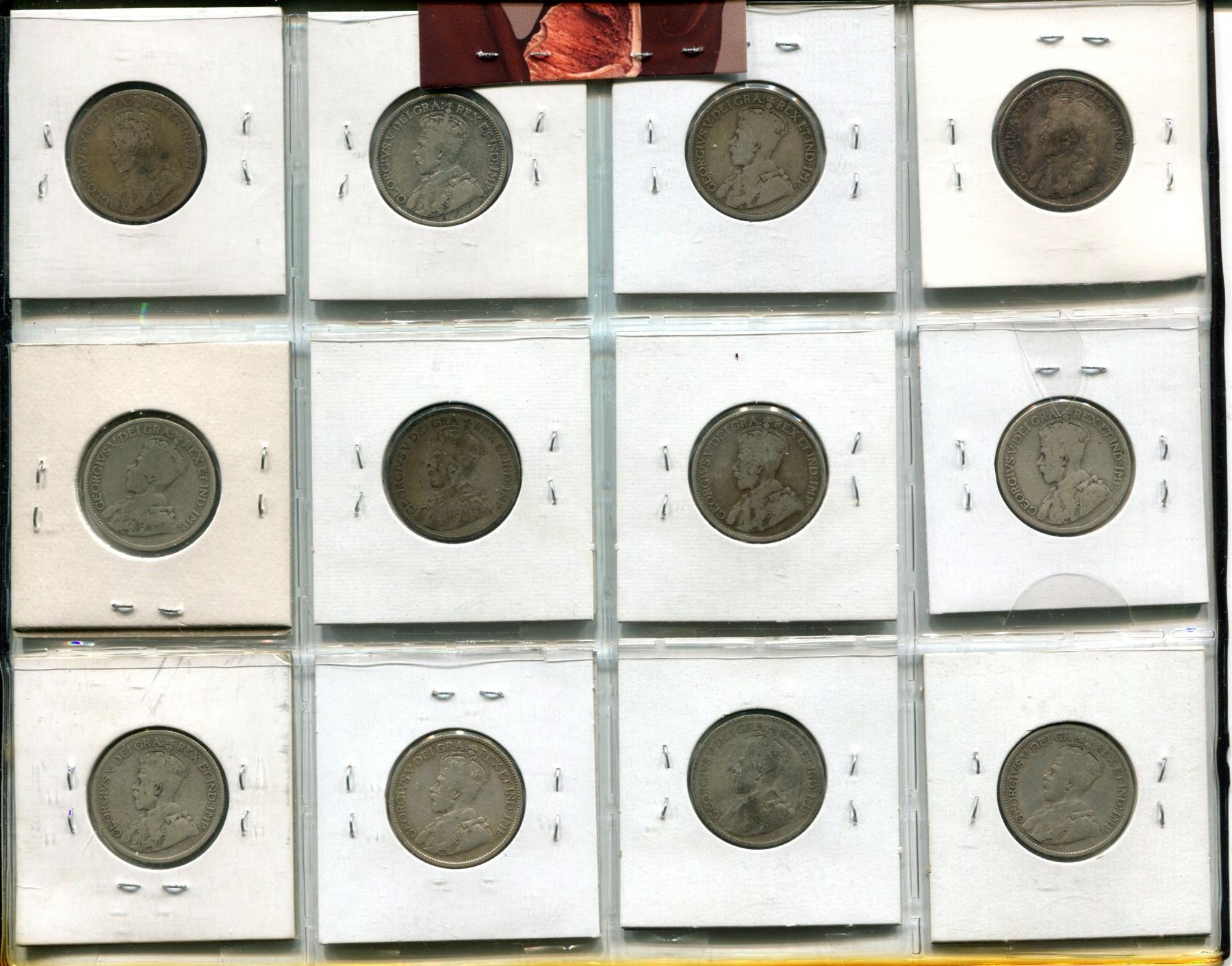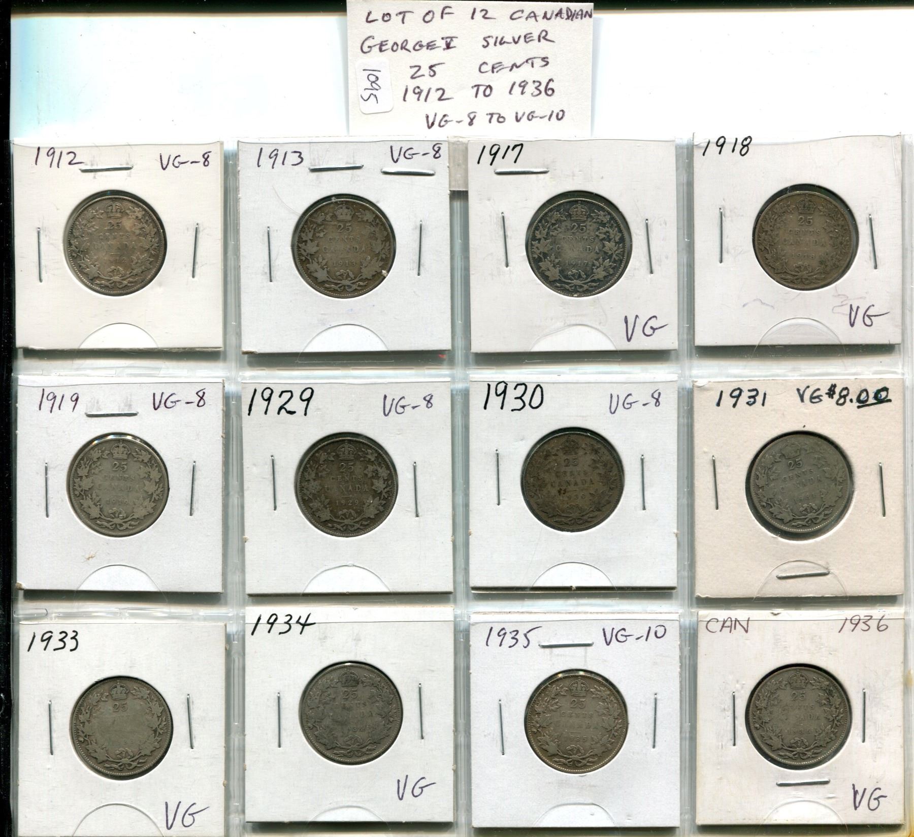 Lot of 12 Canadian George V Silver 25 Cents. Includes 1912, 1913, 1917, 1918, 1919, 1929, 1930, 1931, 1933, 1934, 1935 & 1936. Coins grade VG-8 to VG-10.