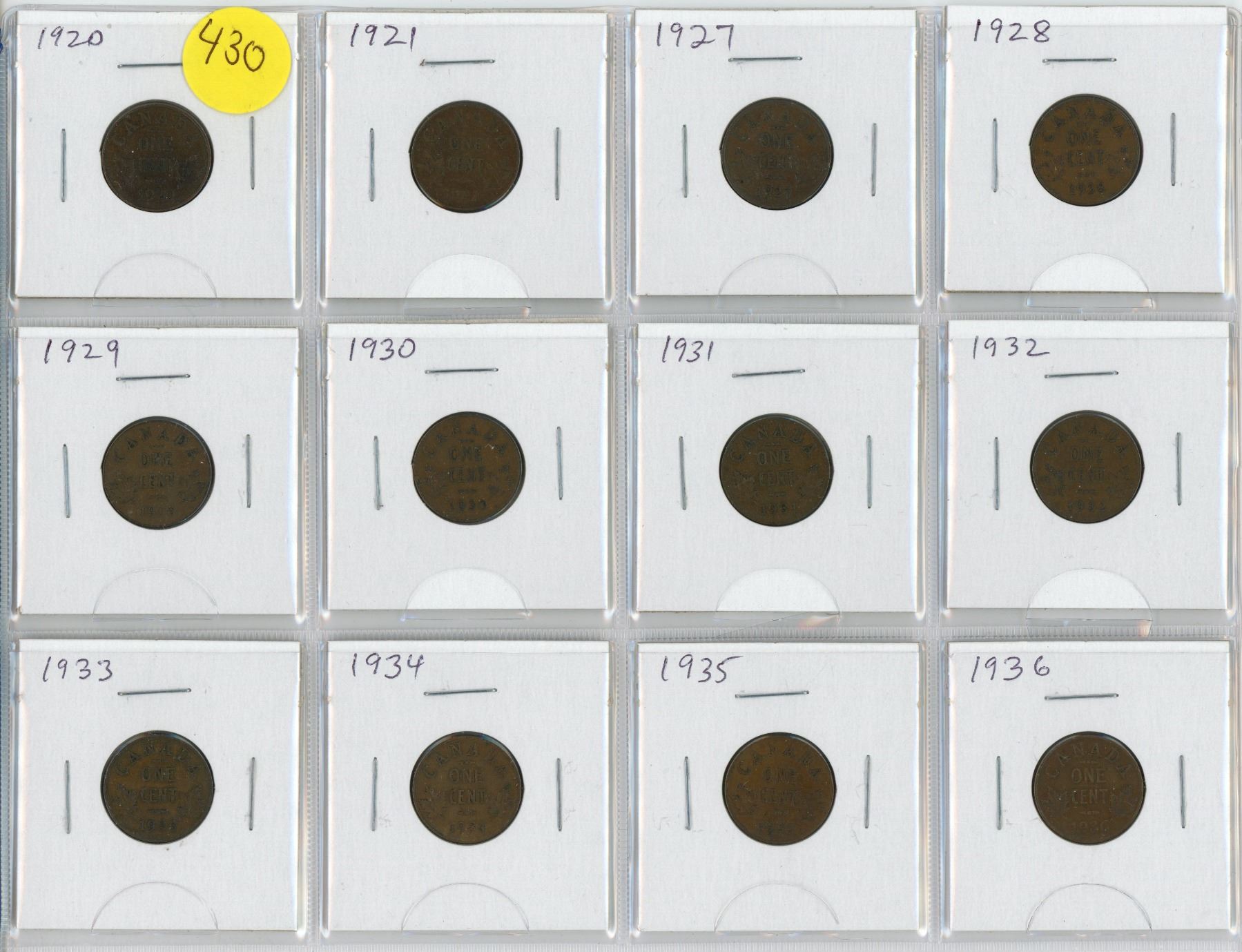 Lot of 12 Canadian George V Small Cents. Includes 1920, 1921, 1927, 1928, 1929, 1930, 1931, 1932, 1933, 1934, 1935 & 1936.