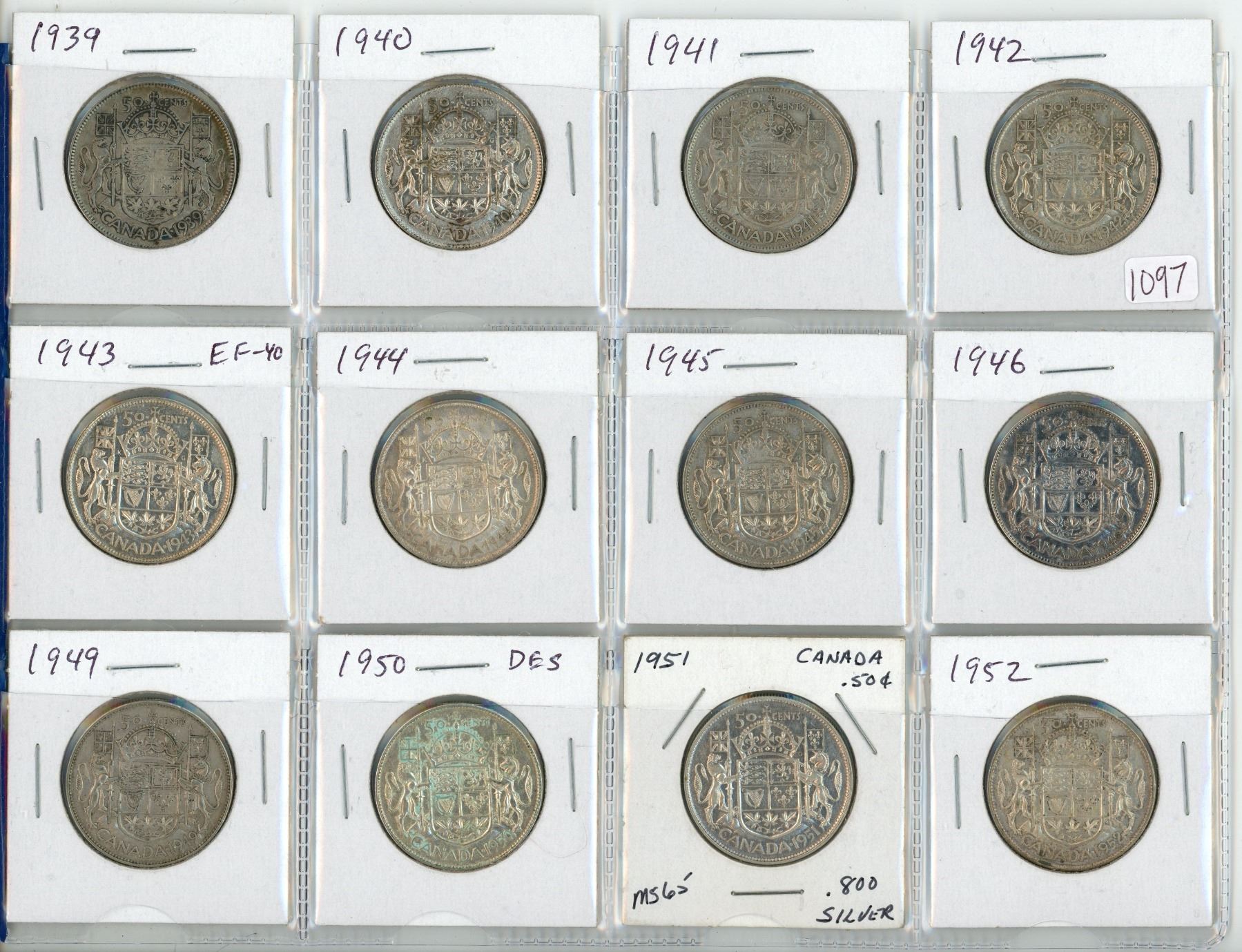 Lot of 12 Canadian George VI Silver 50 Cents. Includes 1939, 1940, 1941, 1942, 1943, 1944, 1945, 1946, 1949, 1950 Design in Zero, 1951 & 1952. Coins grade up to EF-40.