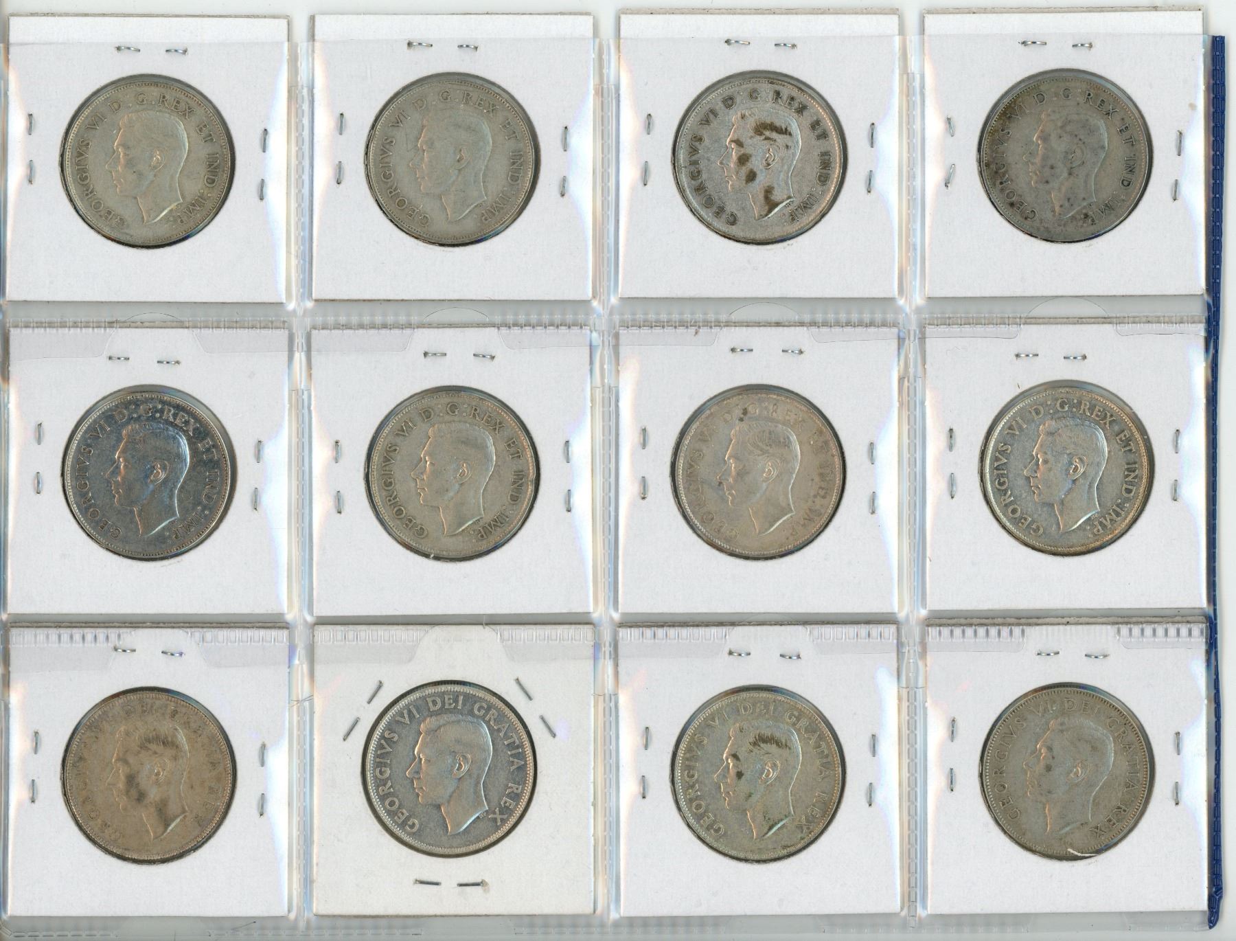 Lot of 12 Canadian George VI Silver 50 Cents. Includes 1939, 1940, 1941, 1942, 1943, 1944, 1945, 194